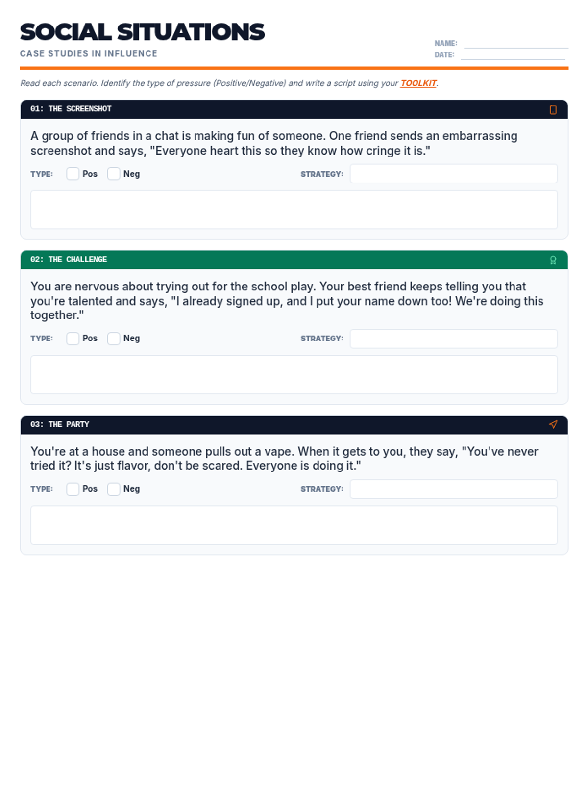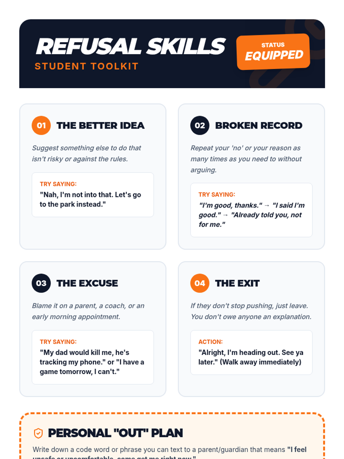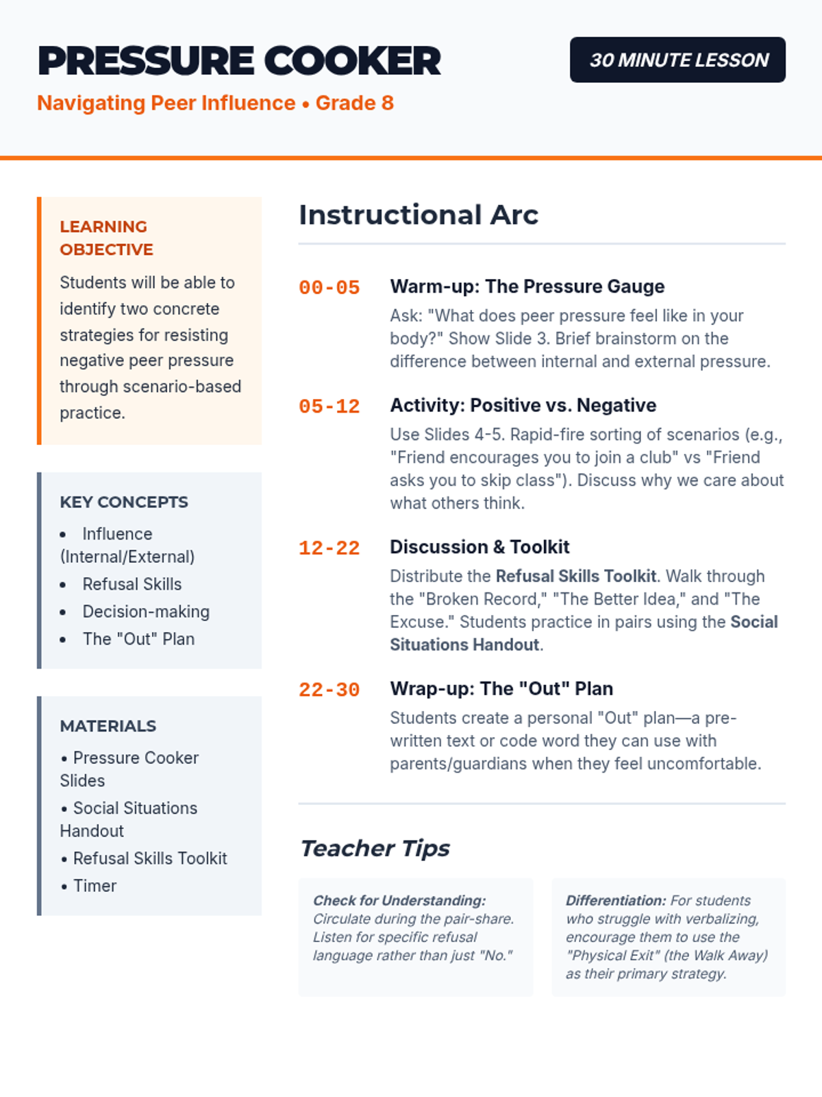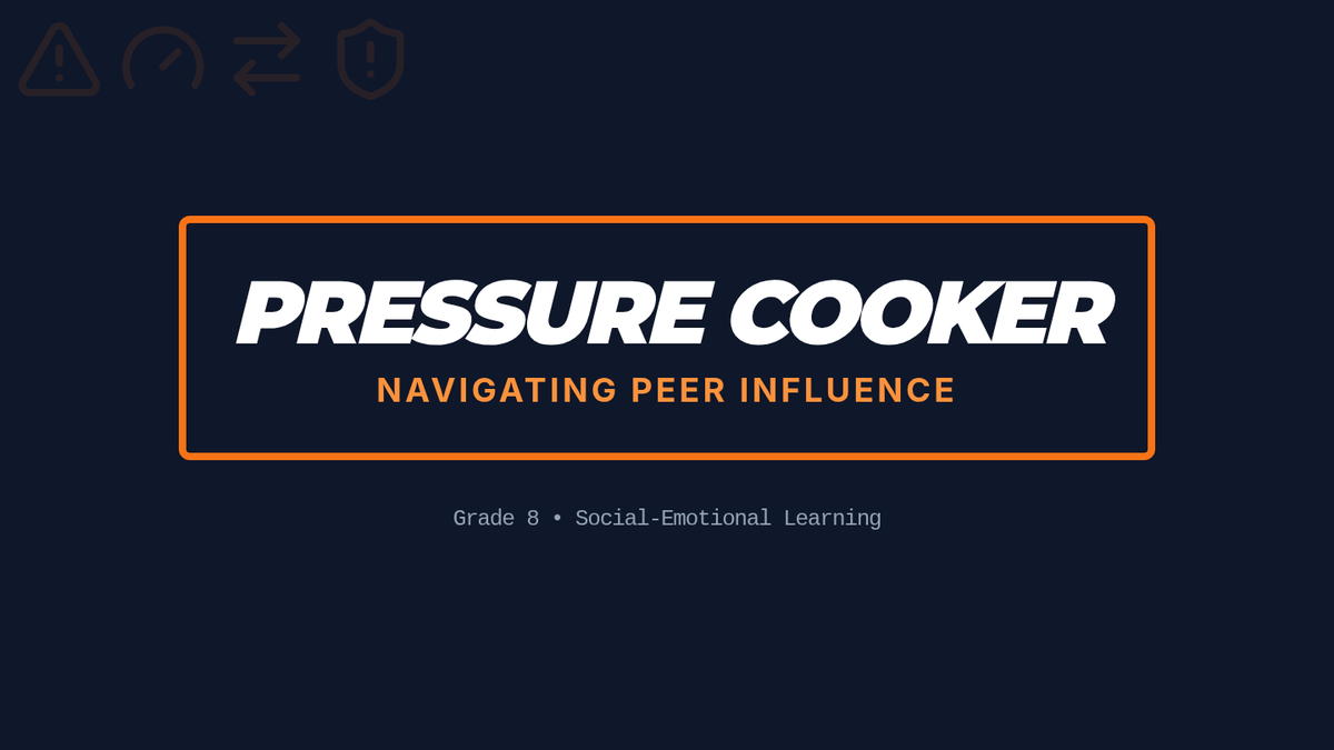 A fast-paced 30-minute lesson designed to help 8th-grade students recognize different types of peer influence and develop concrete refusal strategies. Students move from defining peer pressure to practicing 'out' plans through realistic social scenarios.