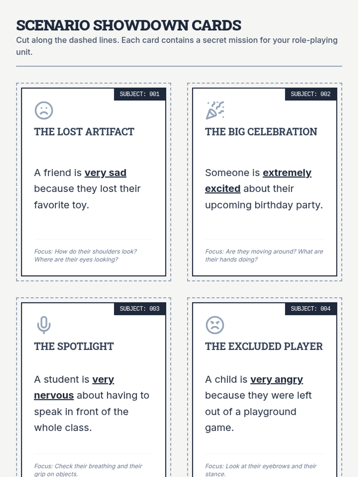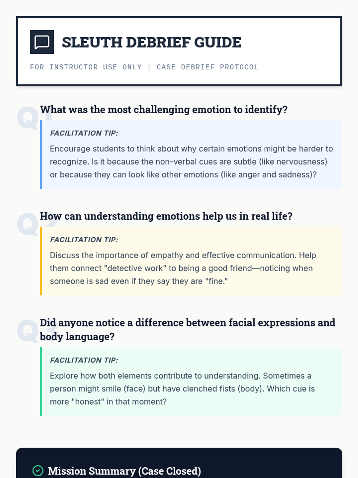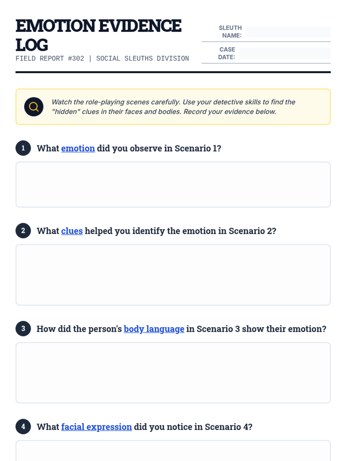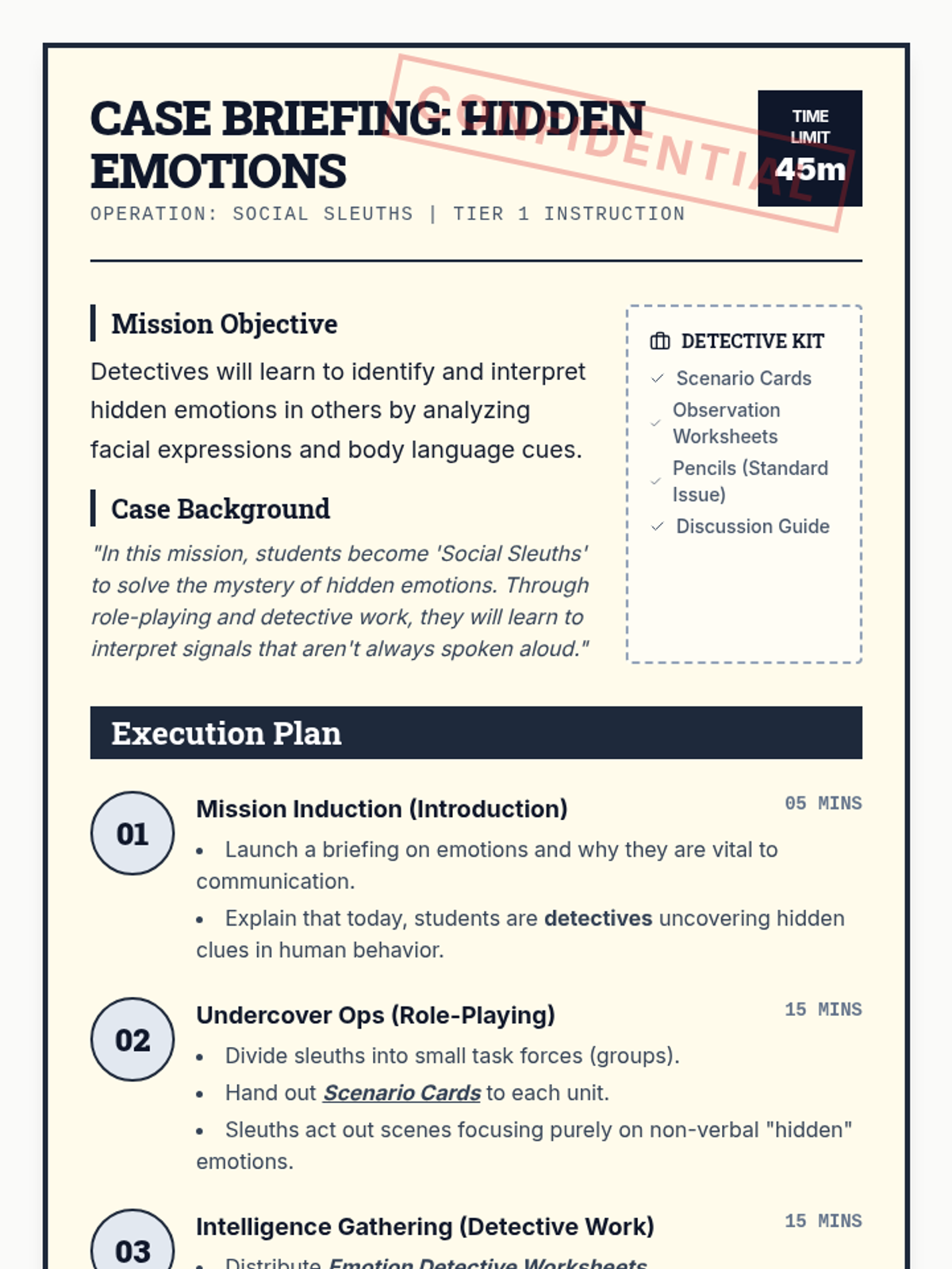 A mystery-themed lesson where 3rd-grade students become 'Social Sleuths' to identify hidden emotions through body language and facial expressions. Students will use role-play and observation to build empathy and social awareness.
