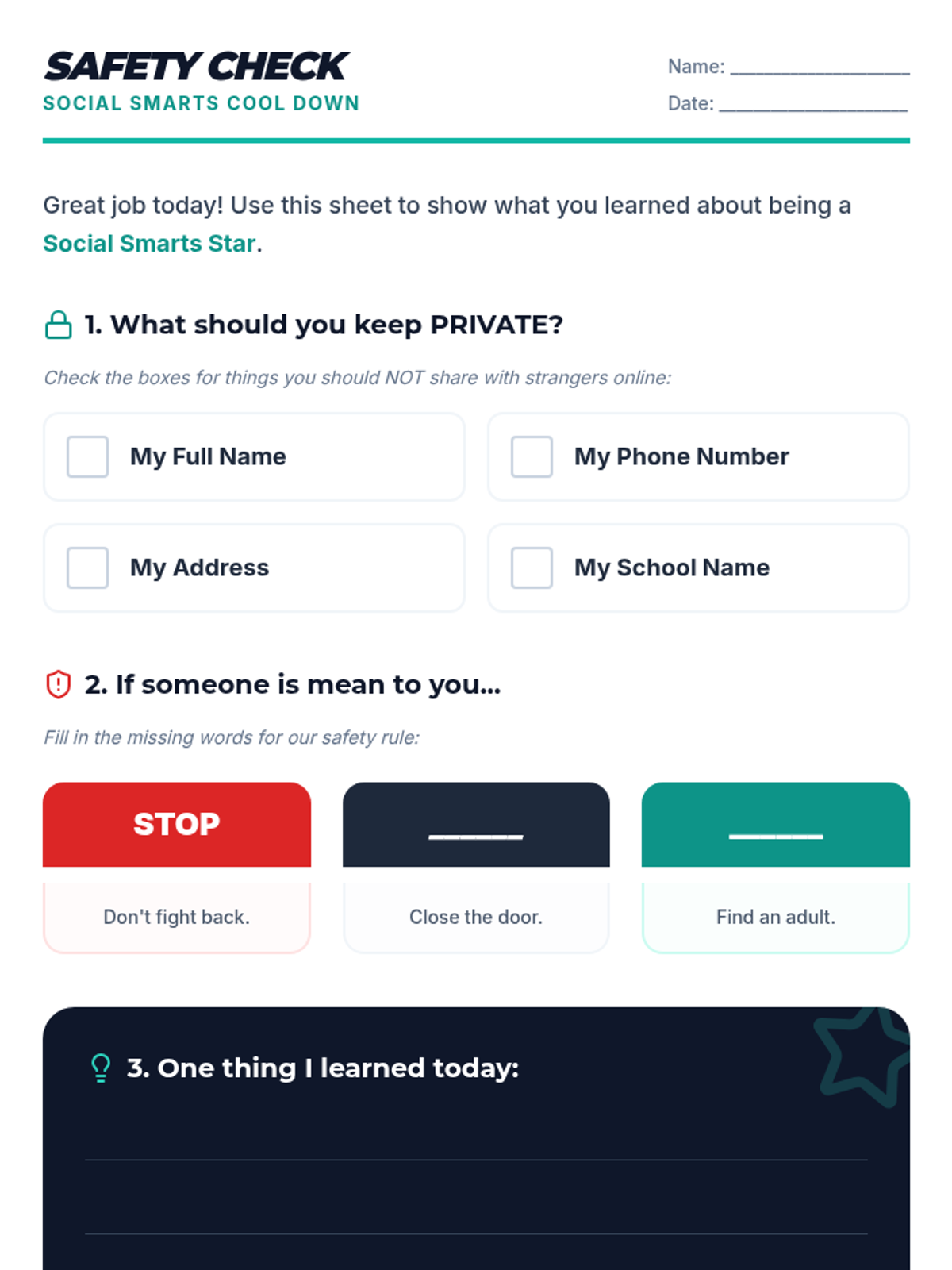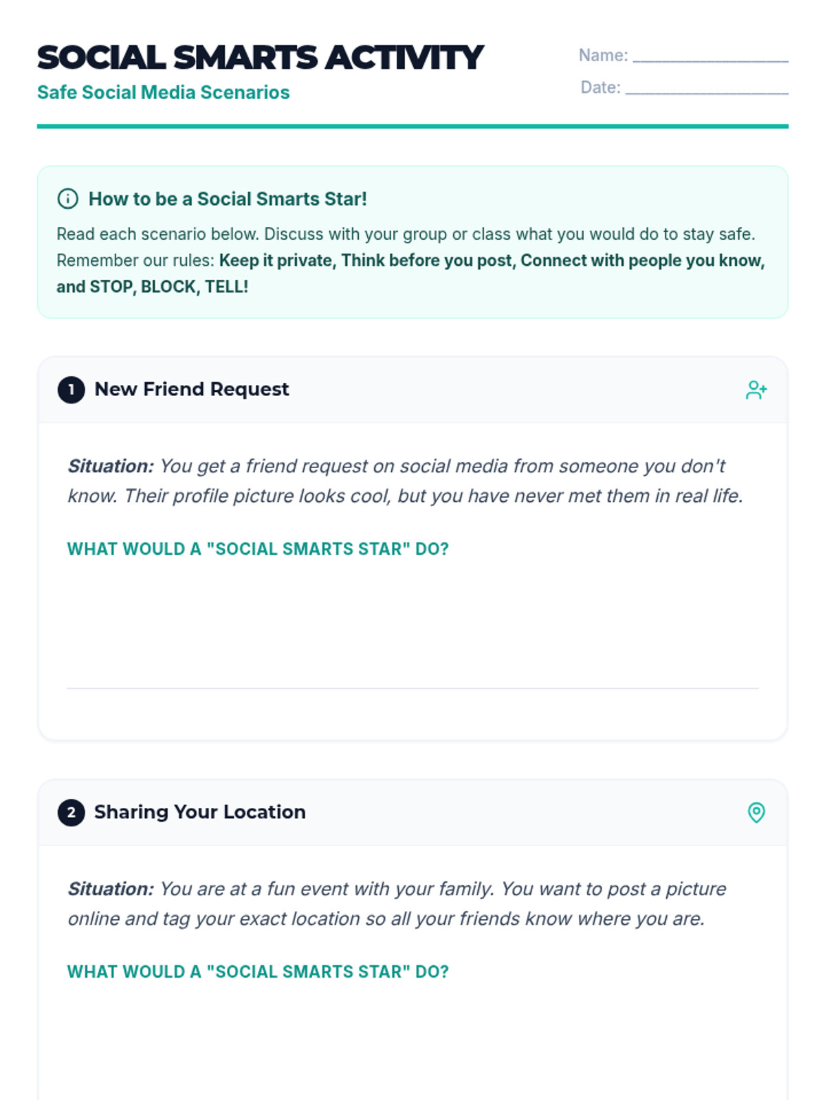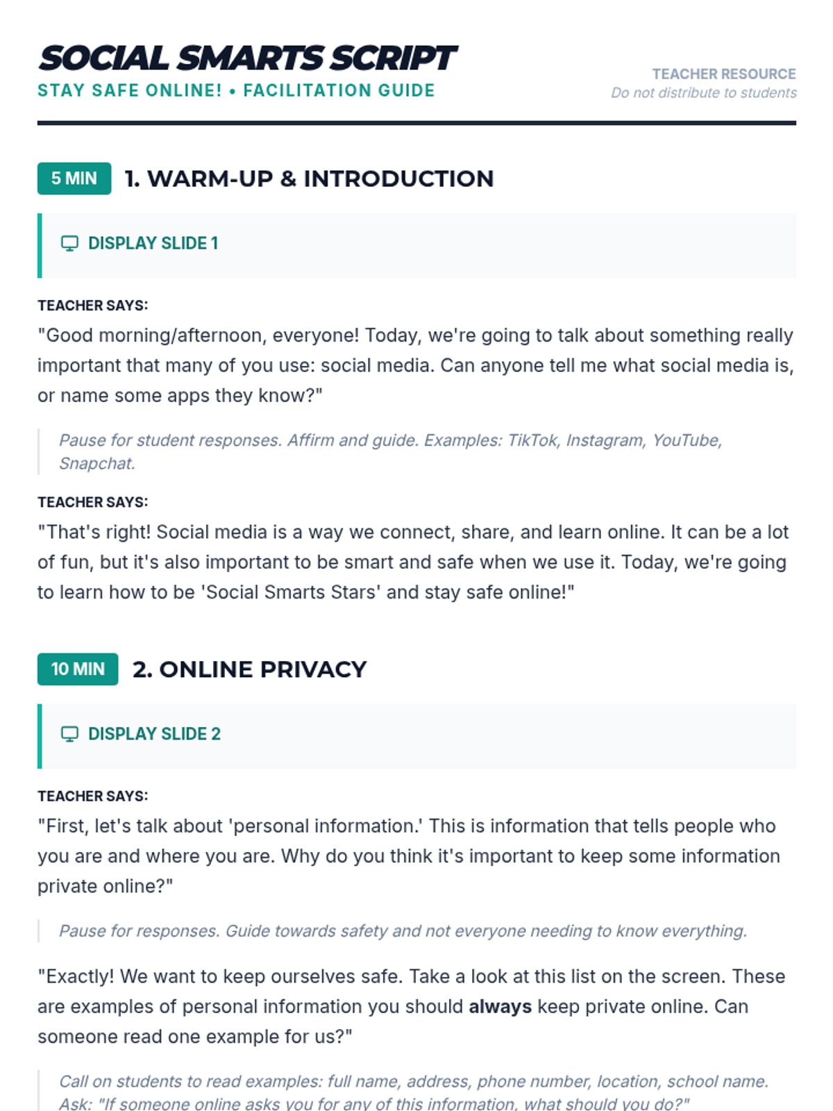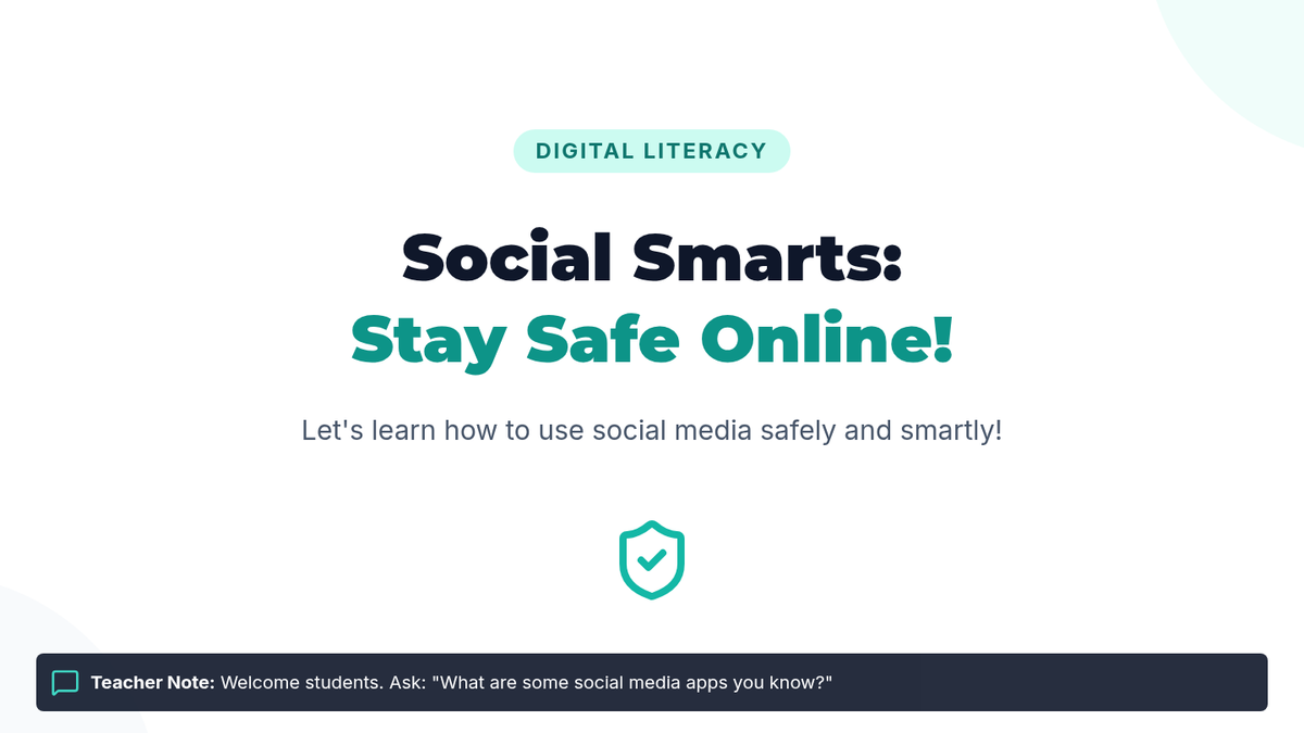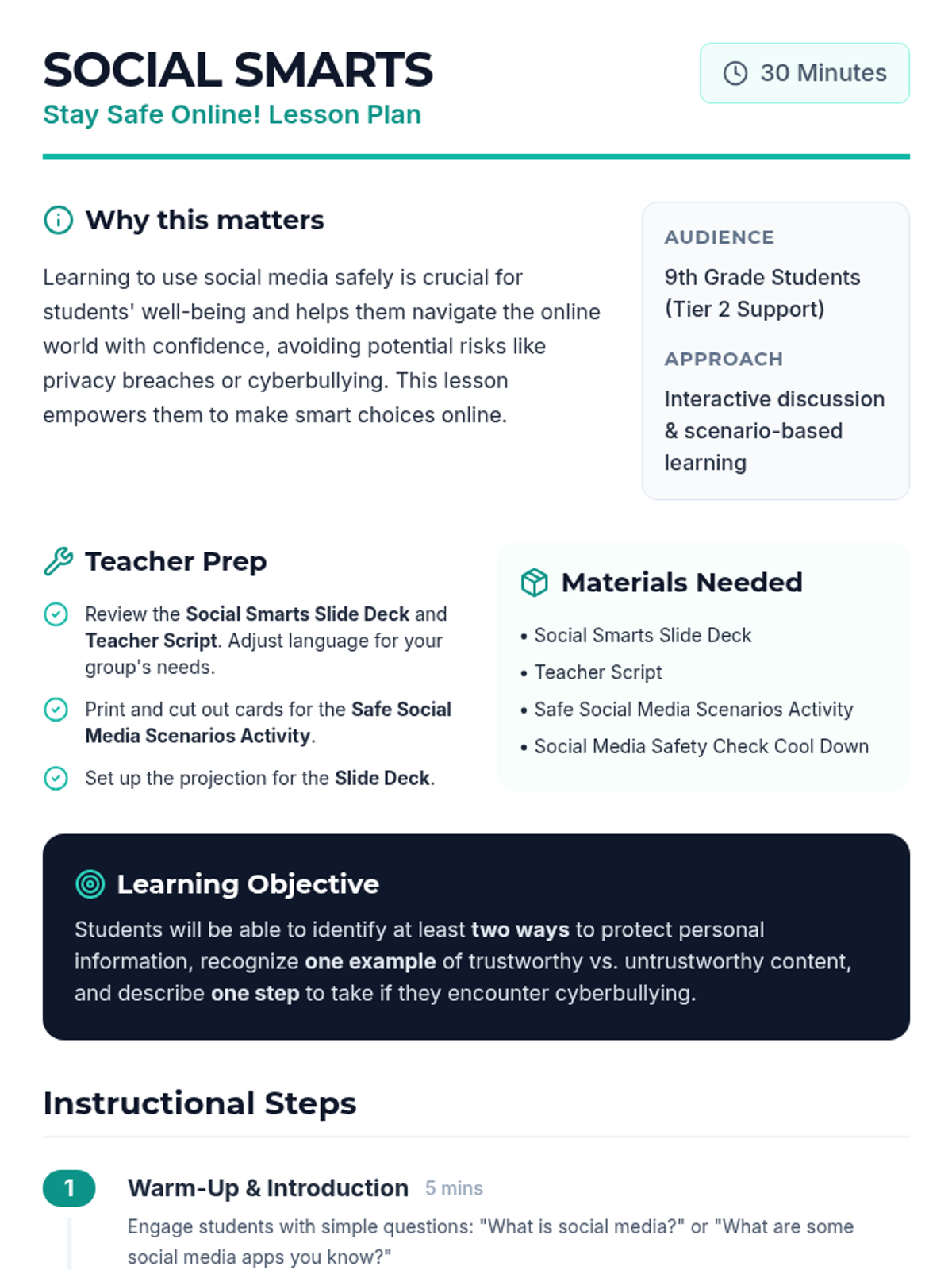 A 30-minute interactive lesson for 9th-grade students with cognitive disabilities focused on privacy, identifying trustworthy content, and responding to cyberbullying.