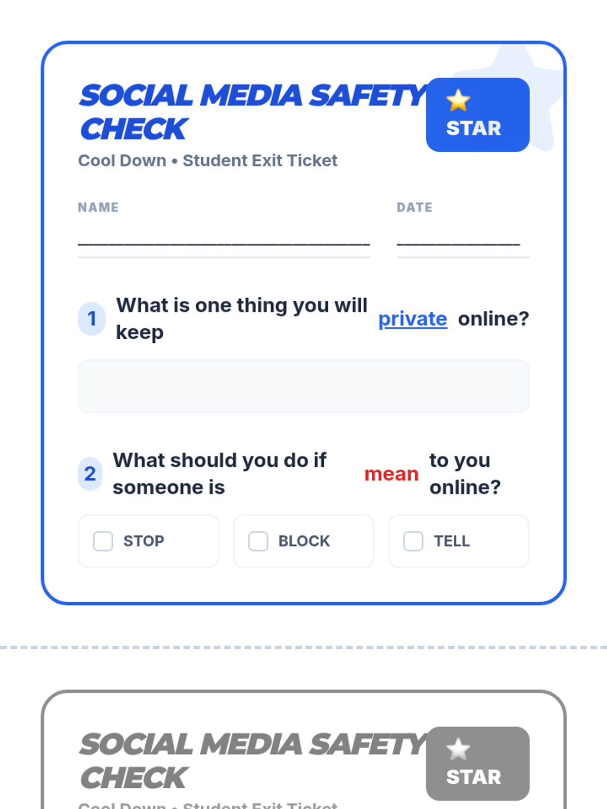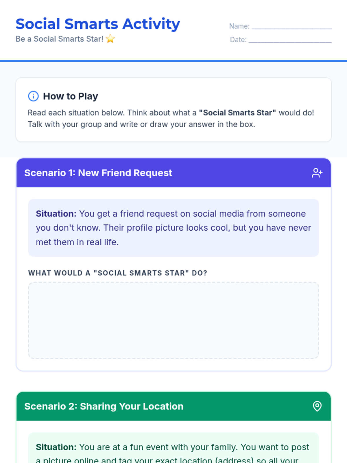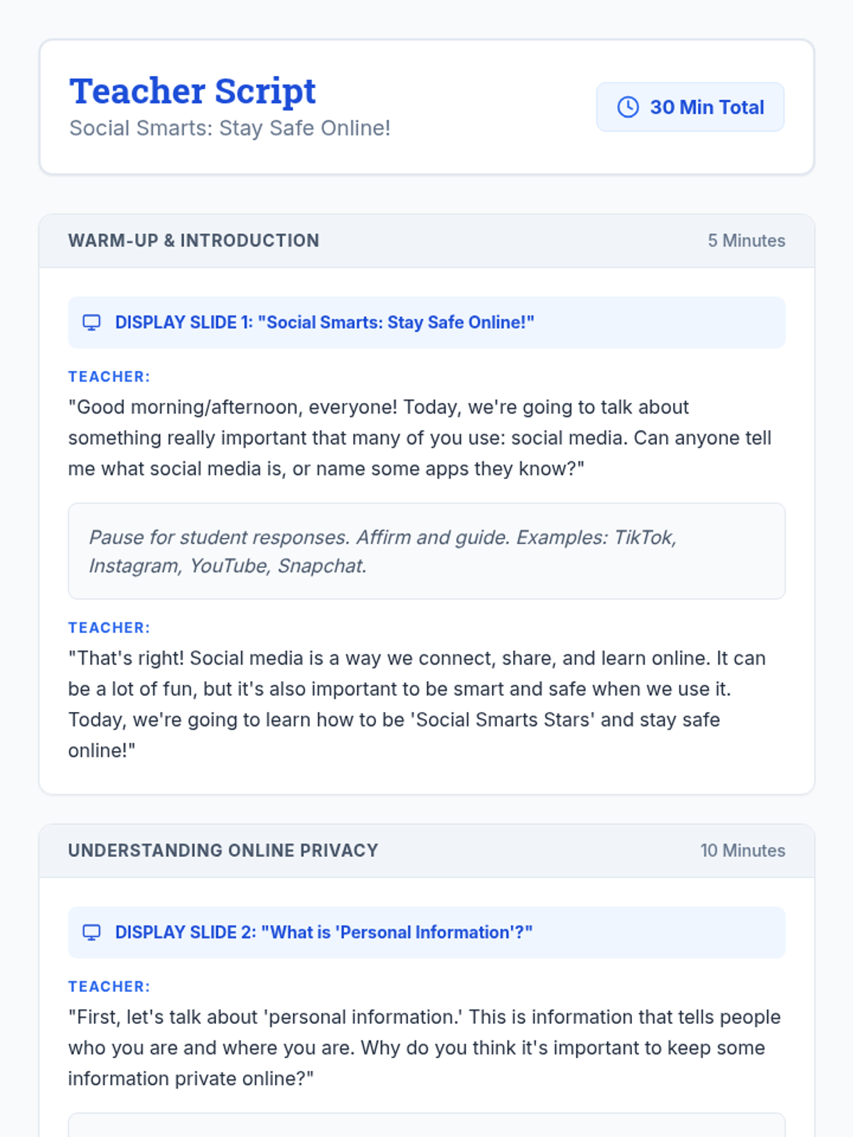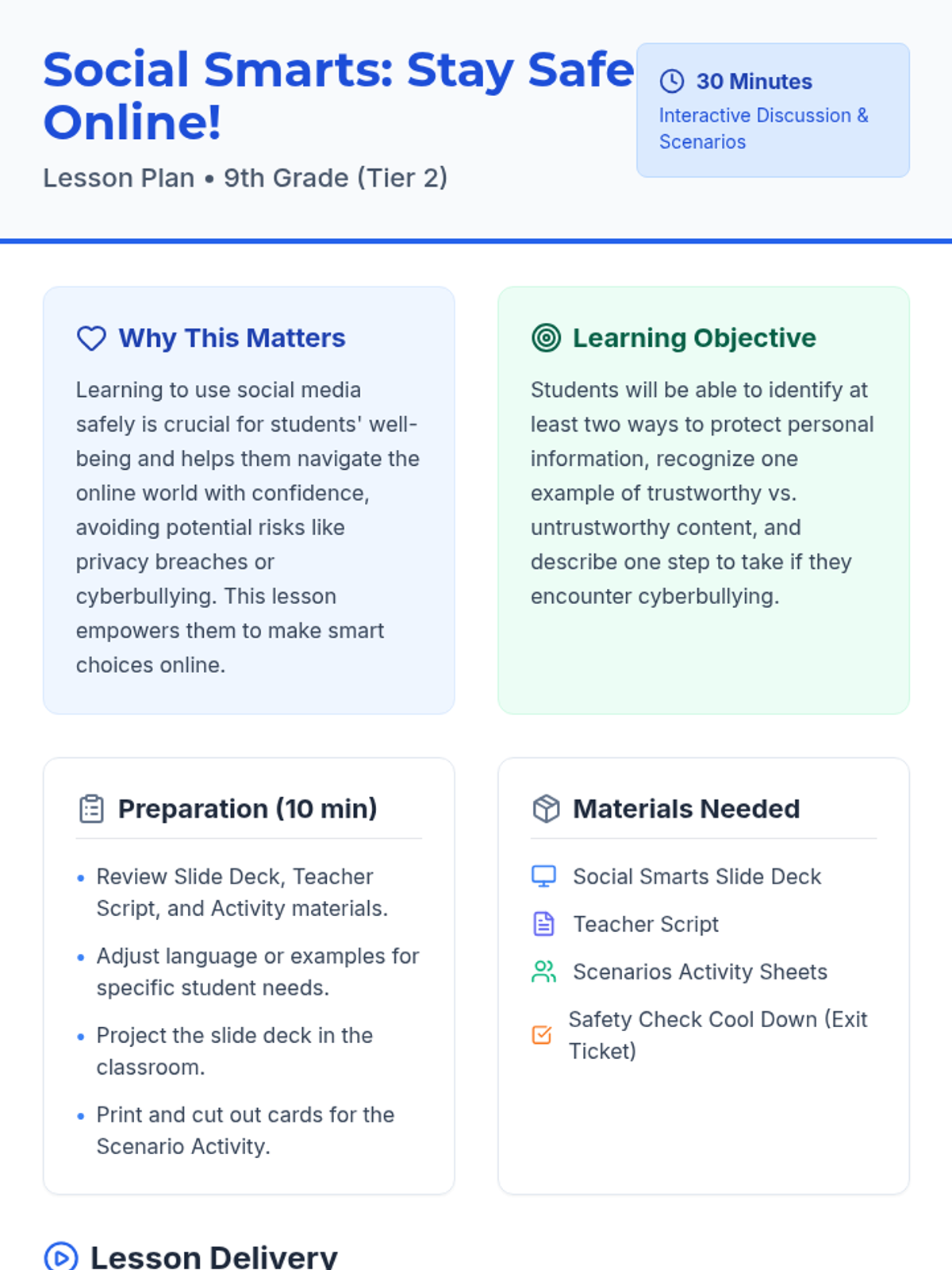 A 30-minute lesson for 9th-grade students with cognitive disabilities focused on privacy, identifying trustworthy content, and responding to cyberbullying on social media.