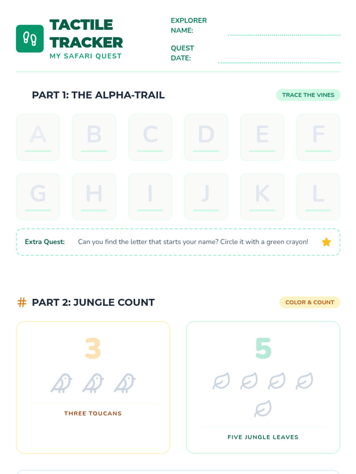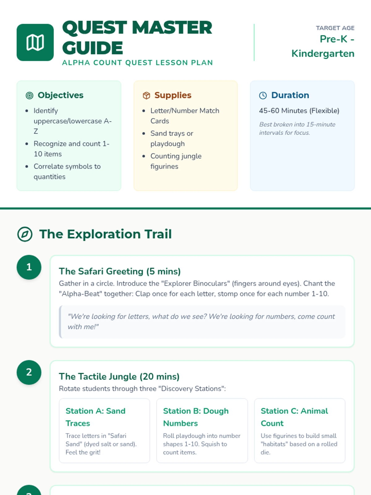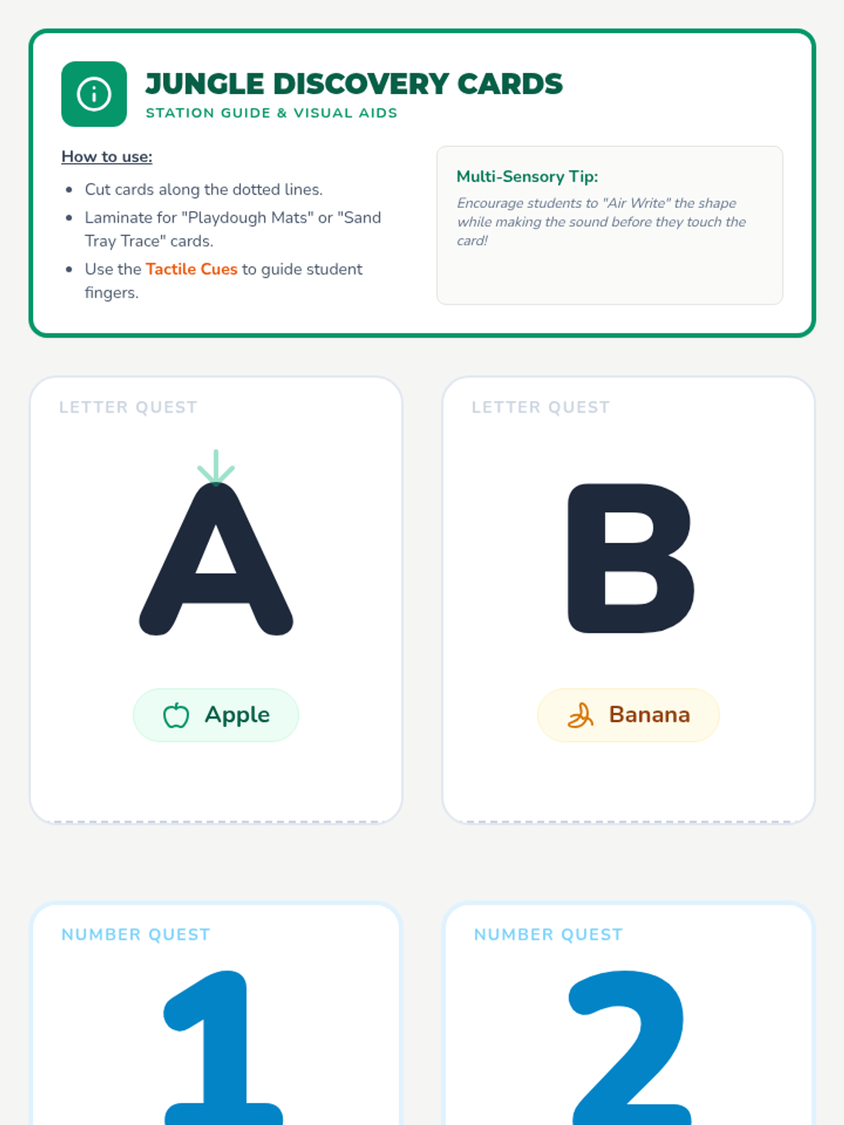 A multi-sensory jungle-themed journey through the alphabet and numbers 1-10, featuring tactile activities, differentiated instruction, and positive behavior management for early learners.