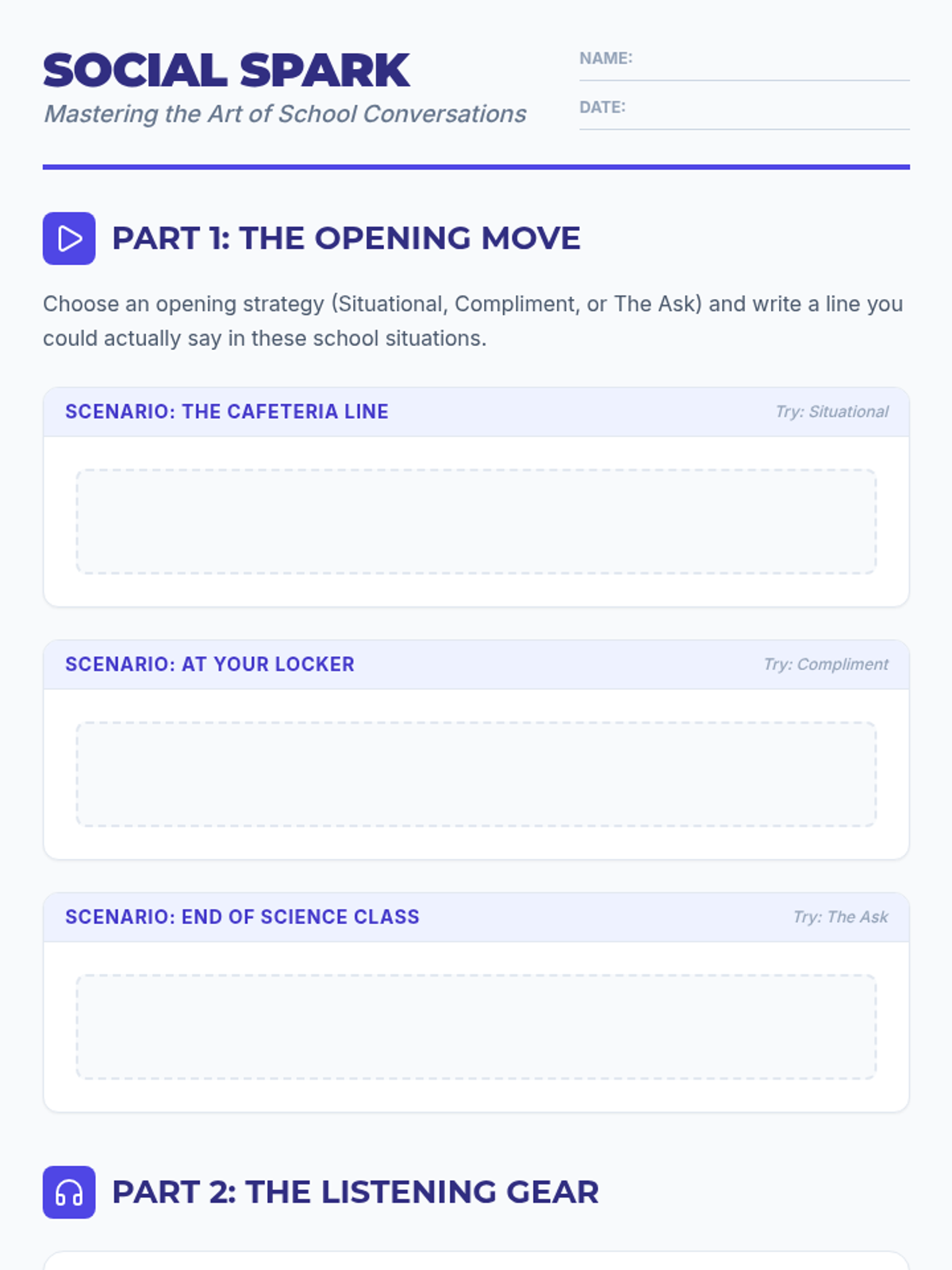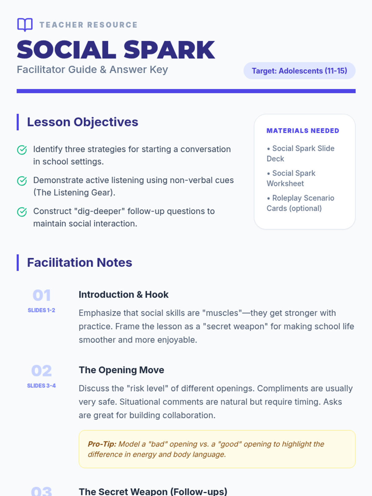 A lesson designed for adolescents to master peer-to-peer school conversations, focusing on effective opening strategies and the art of active listening and follow-up questions.