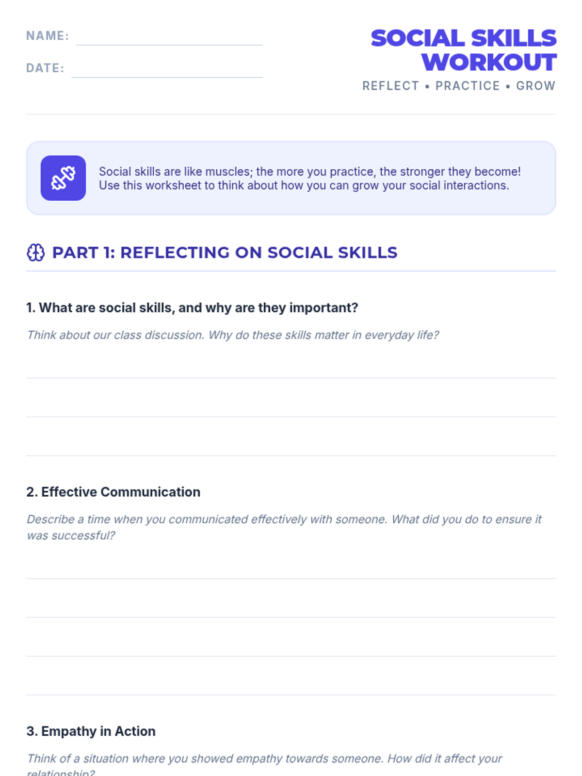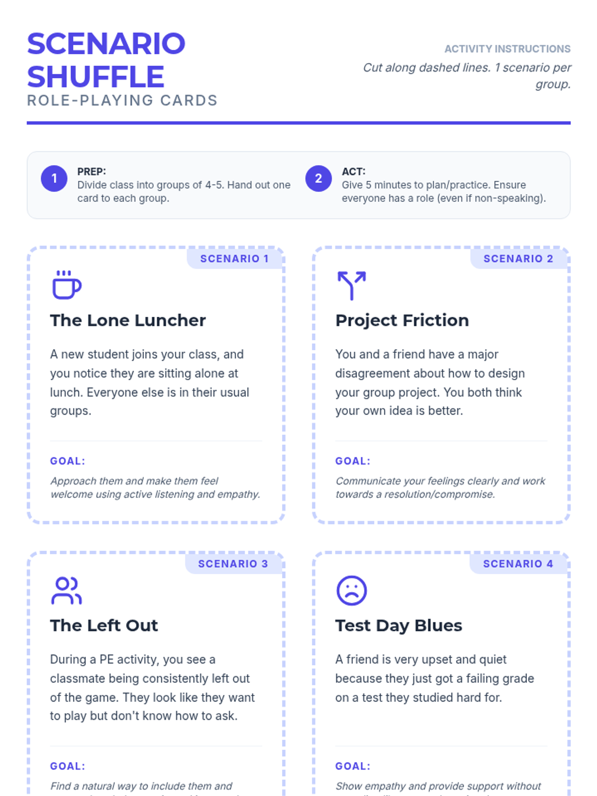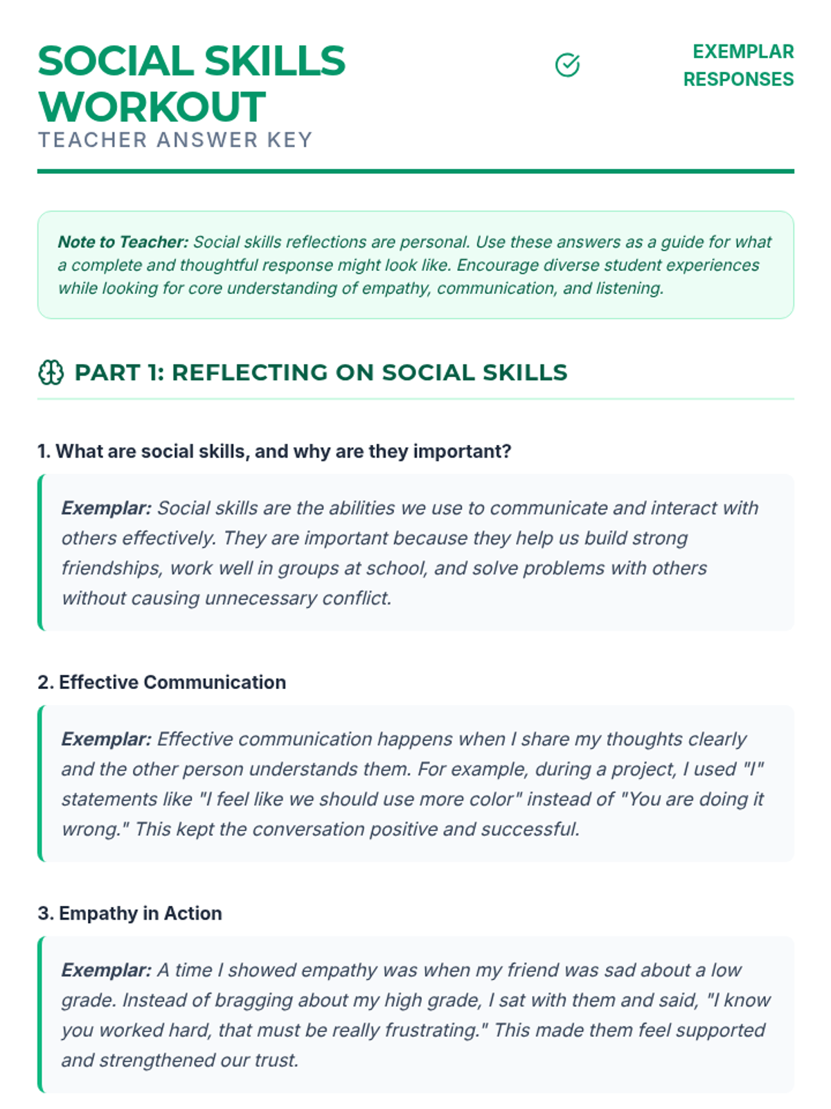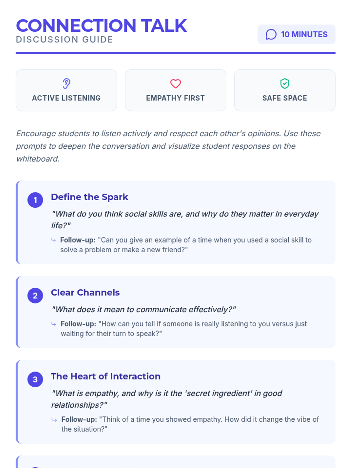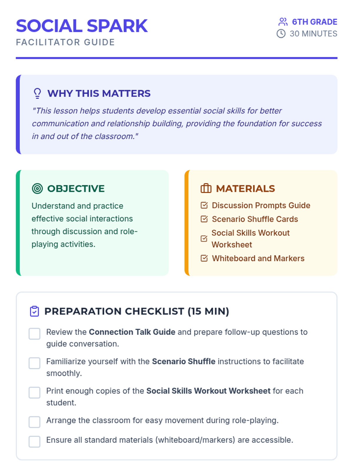 A 30-minute lesson for 6th graders focused on developing essential social skills like active listening, empathy, and conflict resolution through discussion, role-play, and reflection.