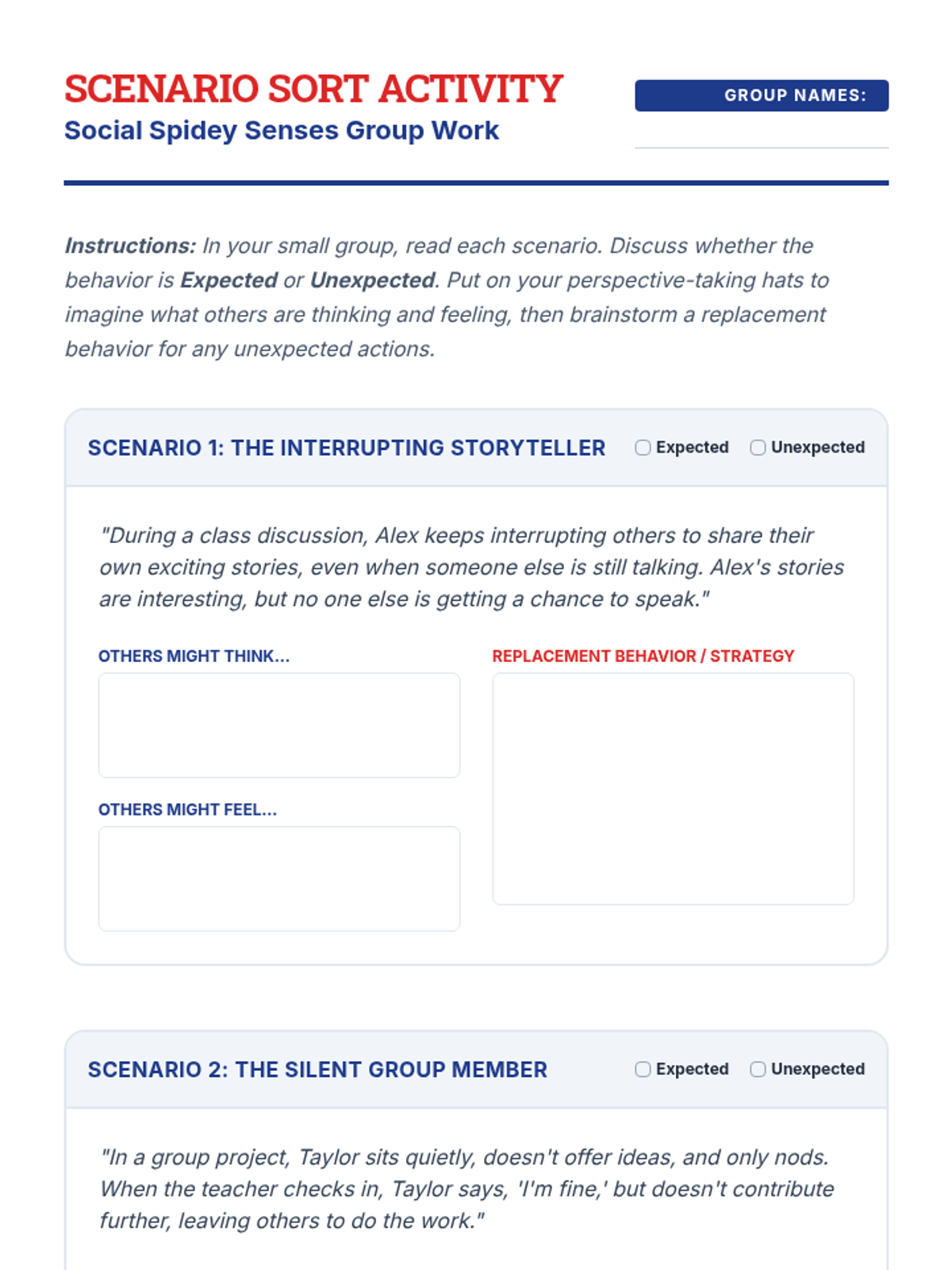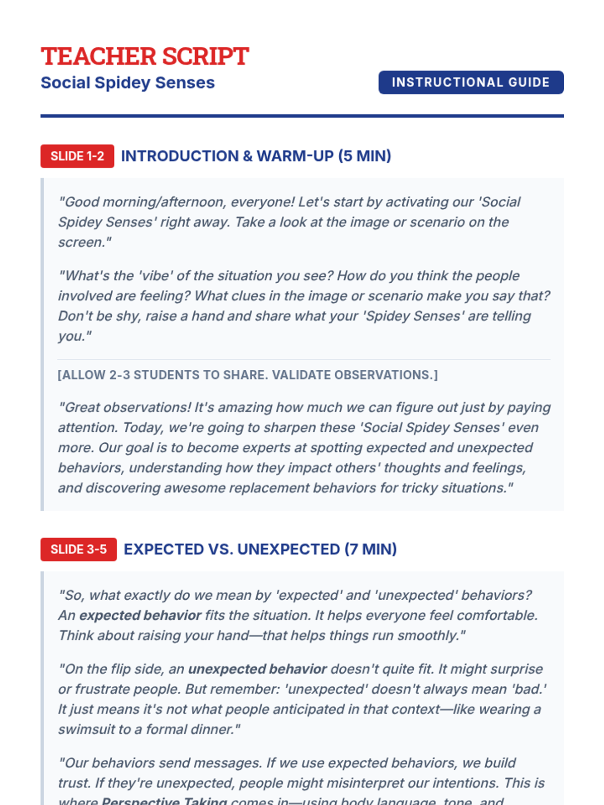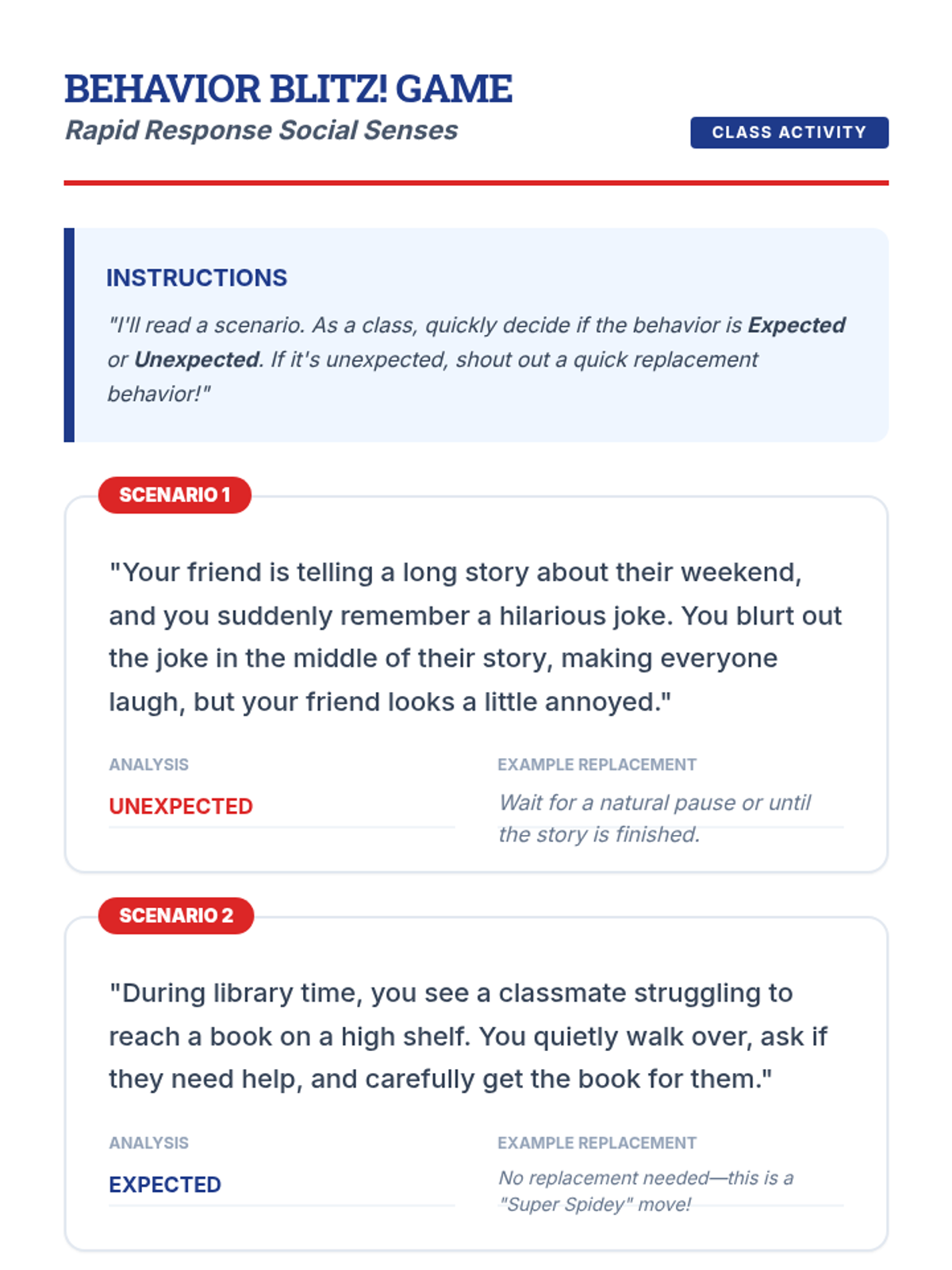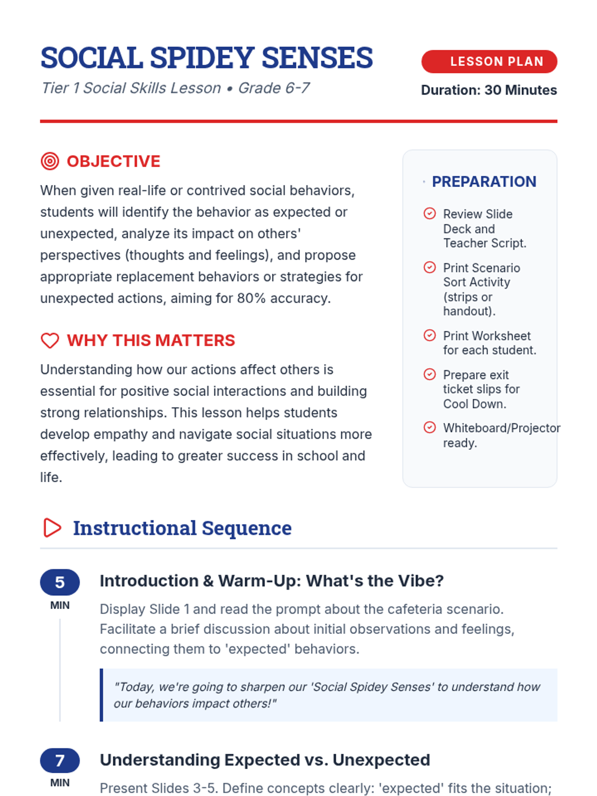 A 30-minute Tier 1 SEL lesson for gifted middle schoolers focusing on expected vs. unexpected behaviors and perspective-taking using a superhero theme.