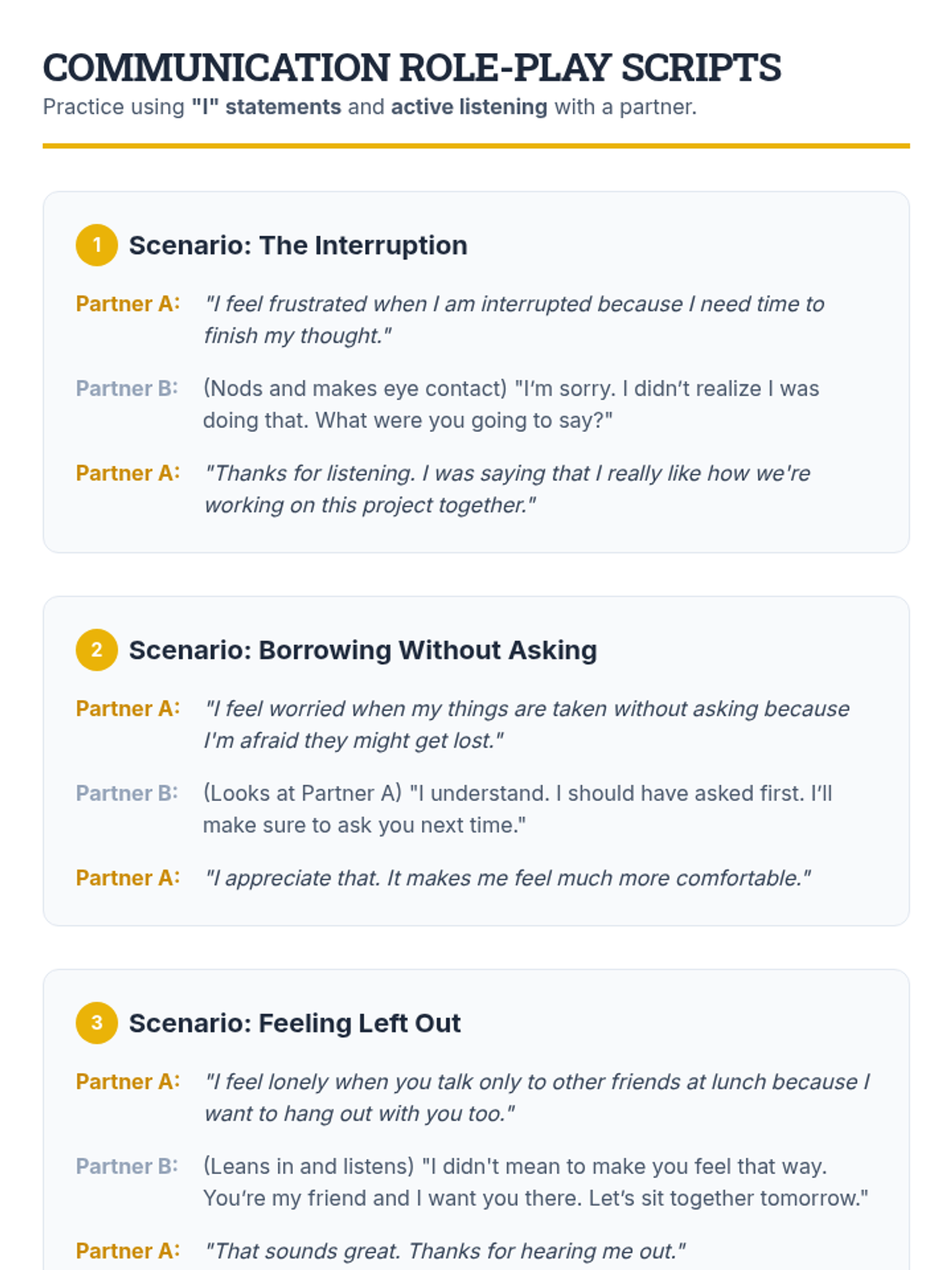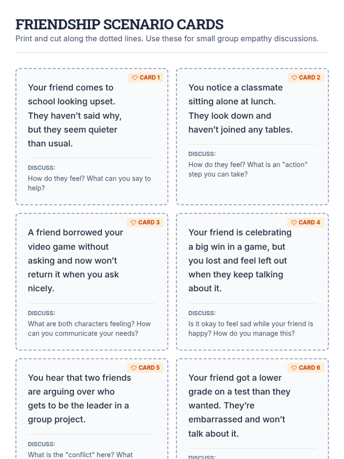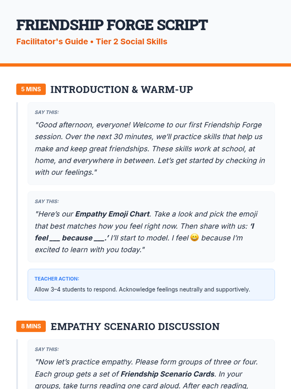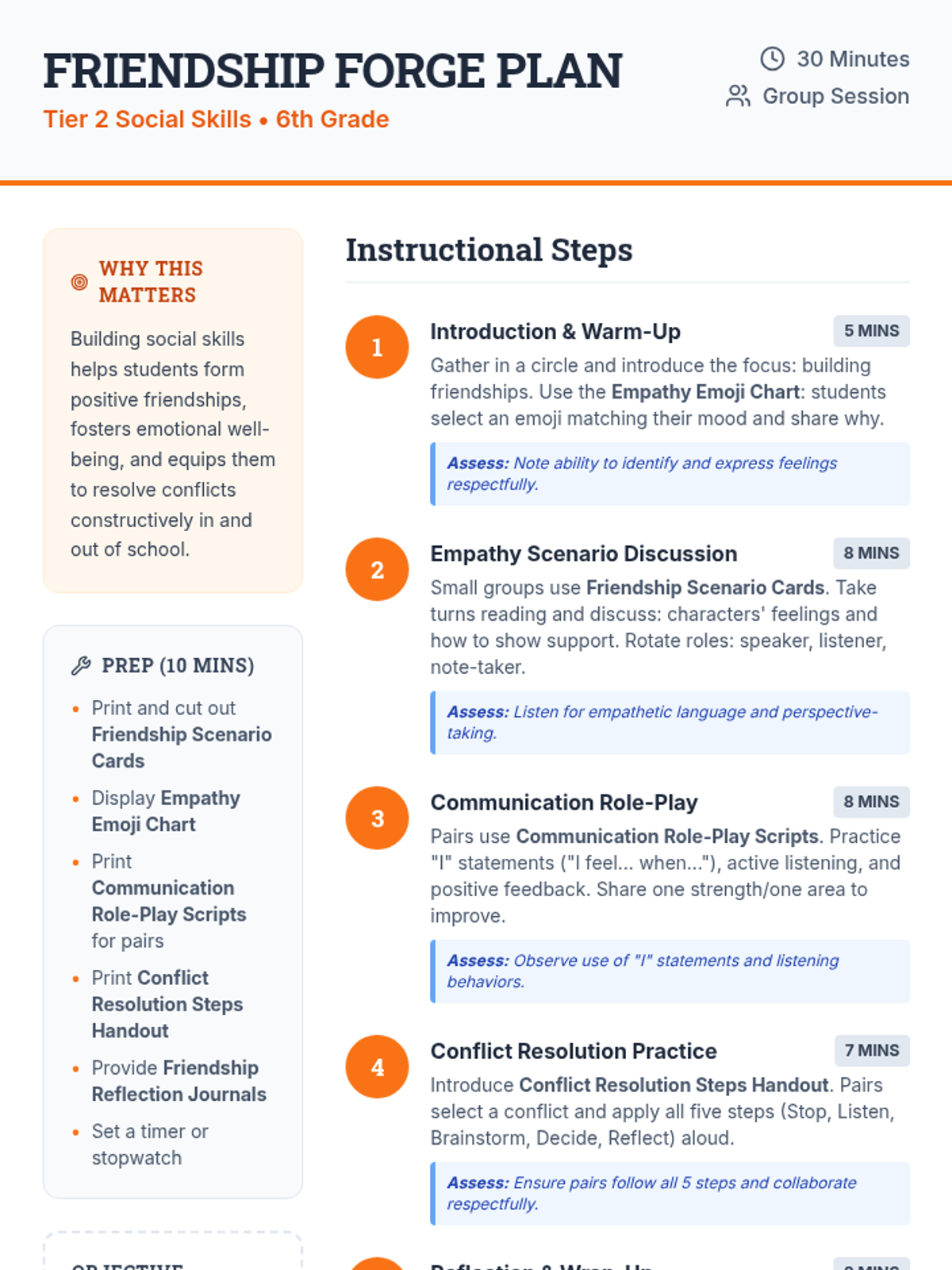 A 30-minute Tier 2 social skills session designed for 6th graders to build empathy, communication, and conflict resolution skills through interactive activities and reflection.