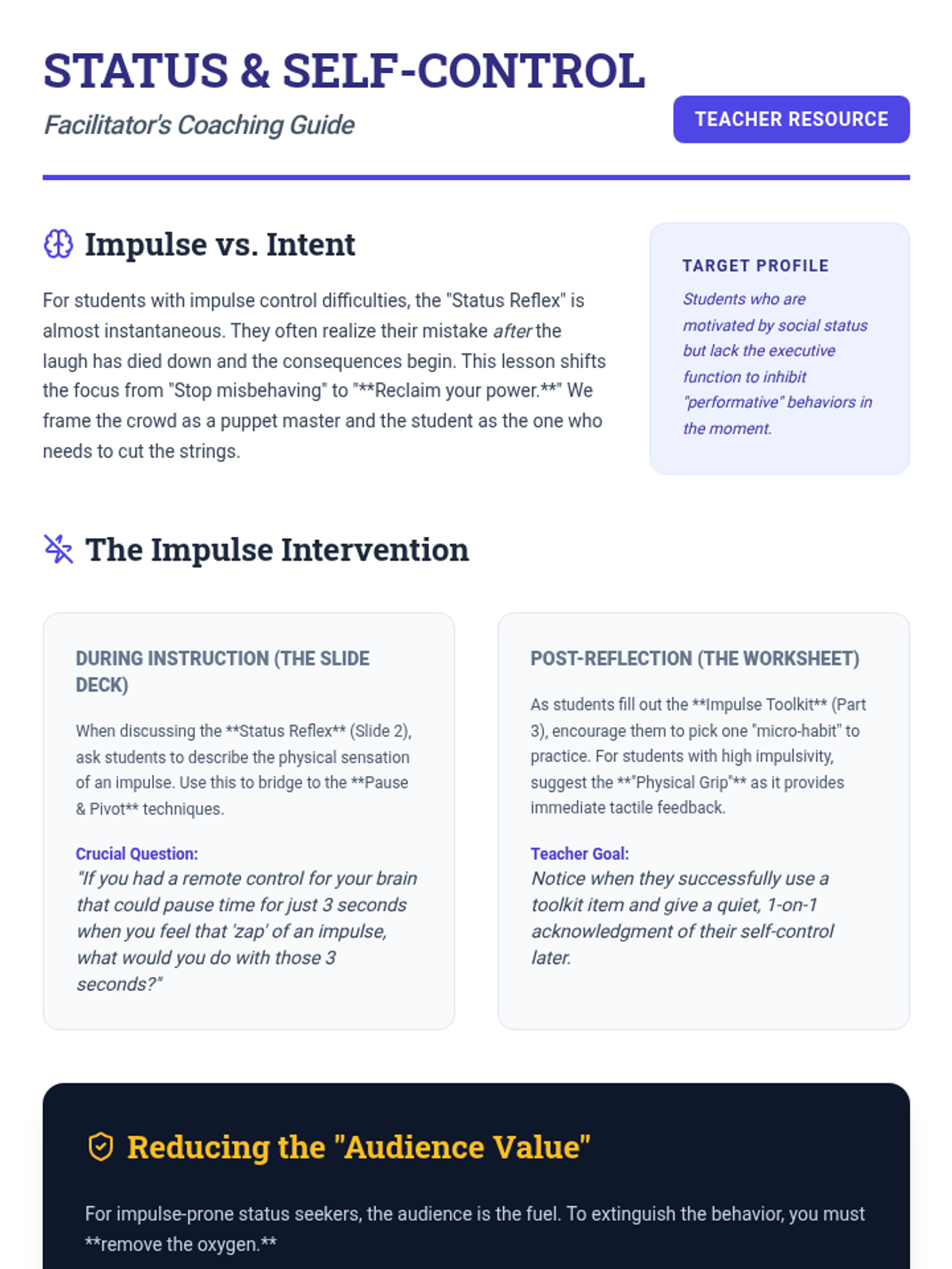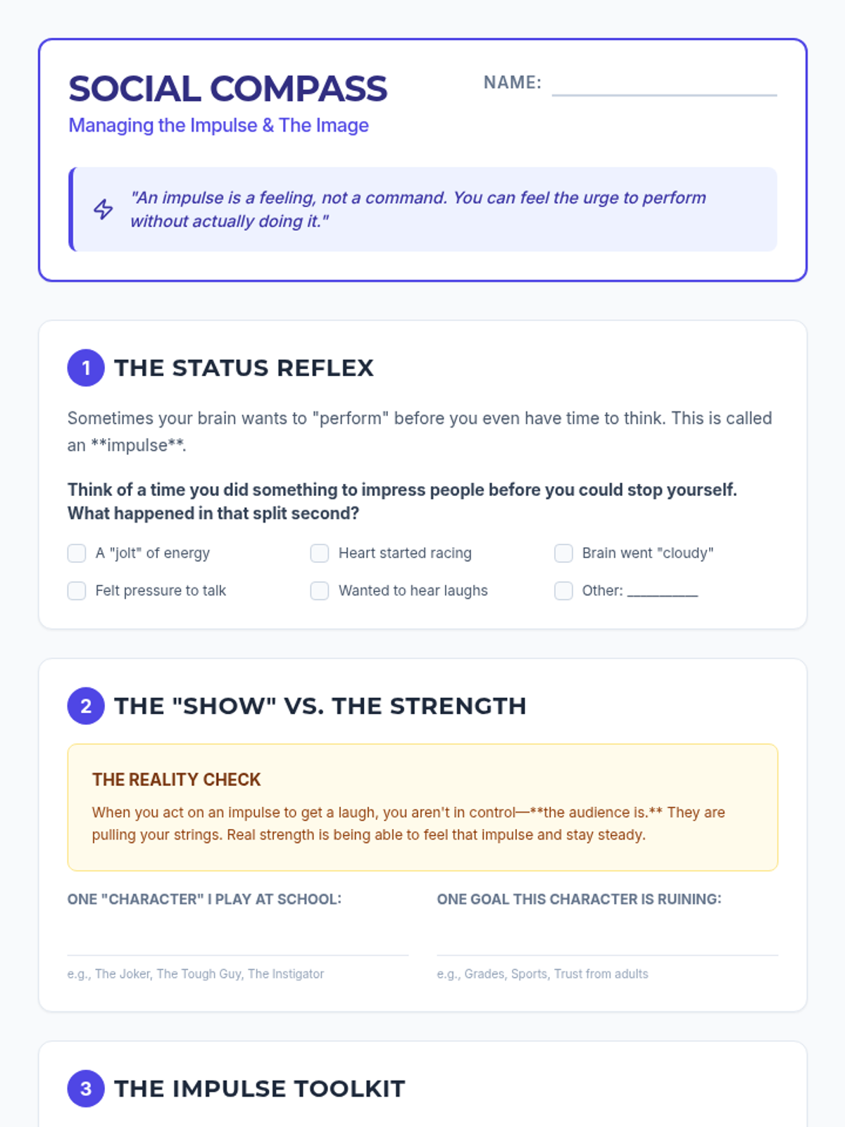 This lesson helps students explore the connection between their behaviors and their desire for peer approval. It provides tools for self-management and reflecting on whether their actions align with their personal values or are simply attempts to impress others.