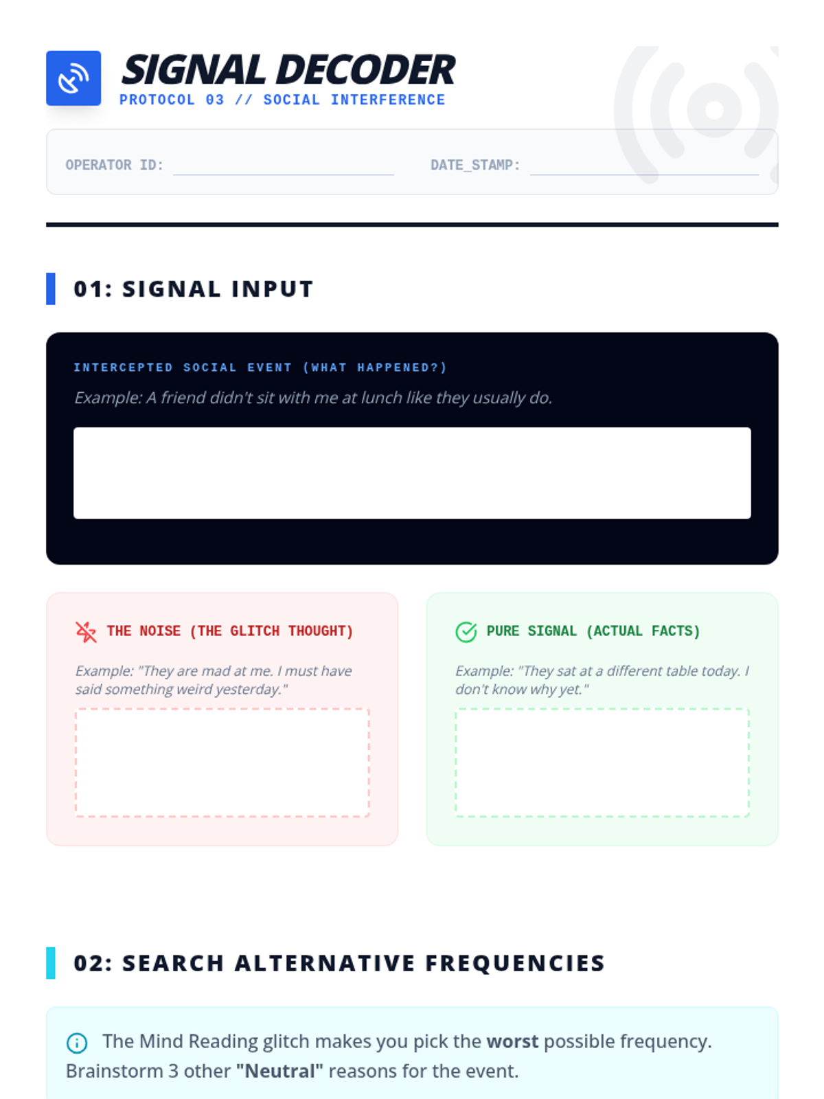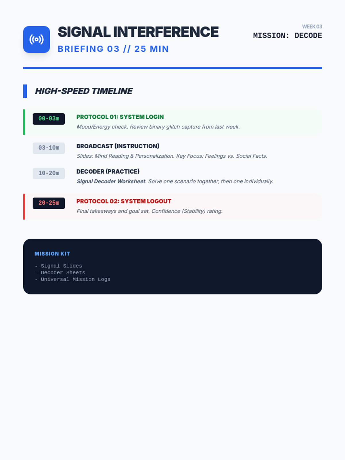 Explores 'Mind Reading' and 'Personalization'. Students act as signal decoders to separate actual social cues from glitched assumptions about what others are thinking.