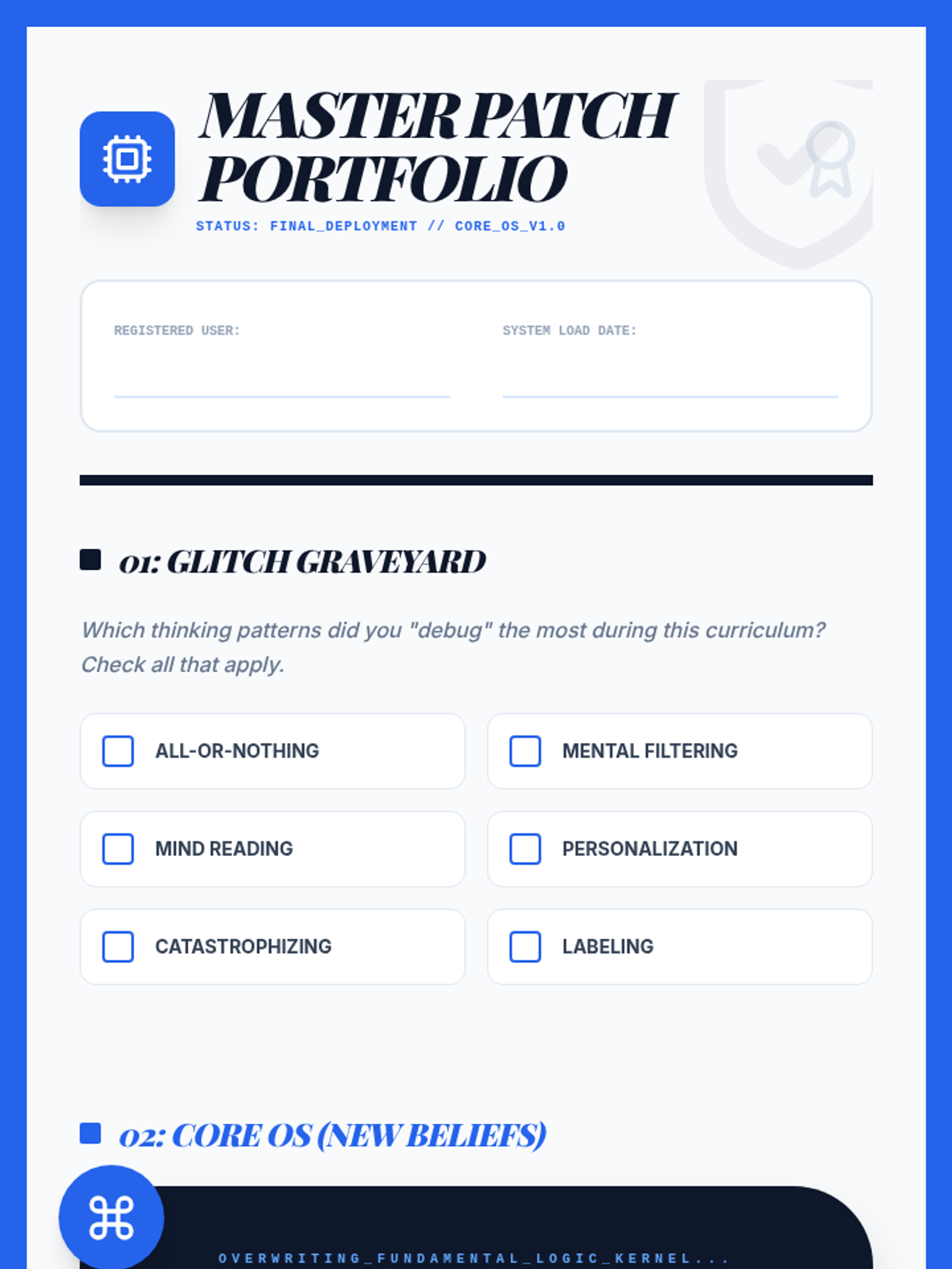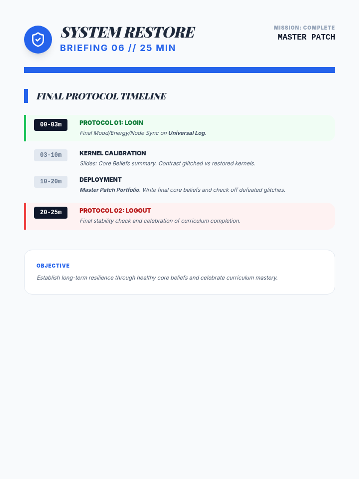 The final curriculum review and introduction to Core Beliefs. Students synthesize their learning to create a 'Master Patch'—a set of balanced core beliefs for long-term mental resilience.
