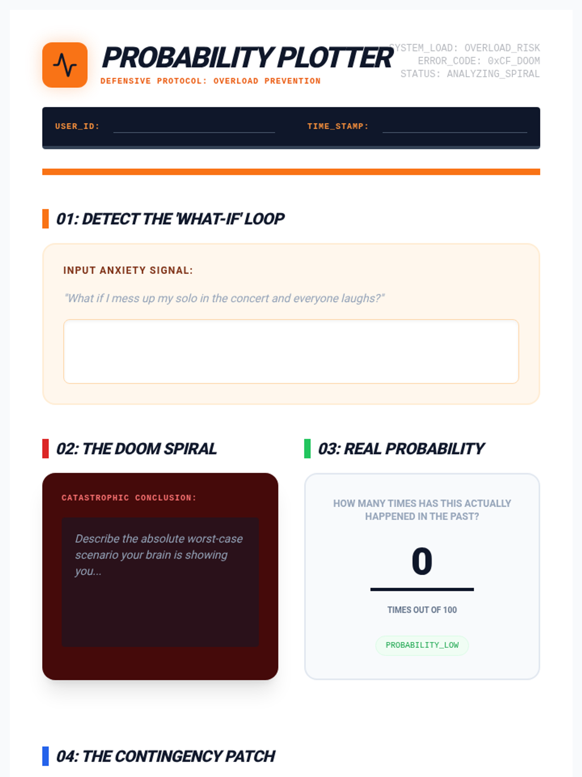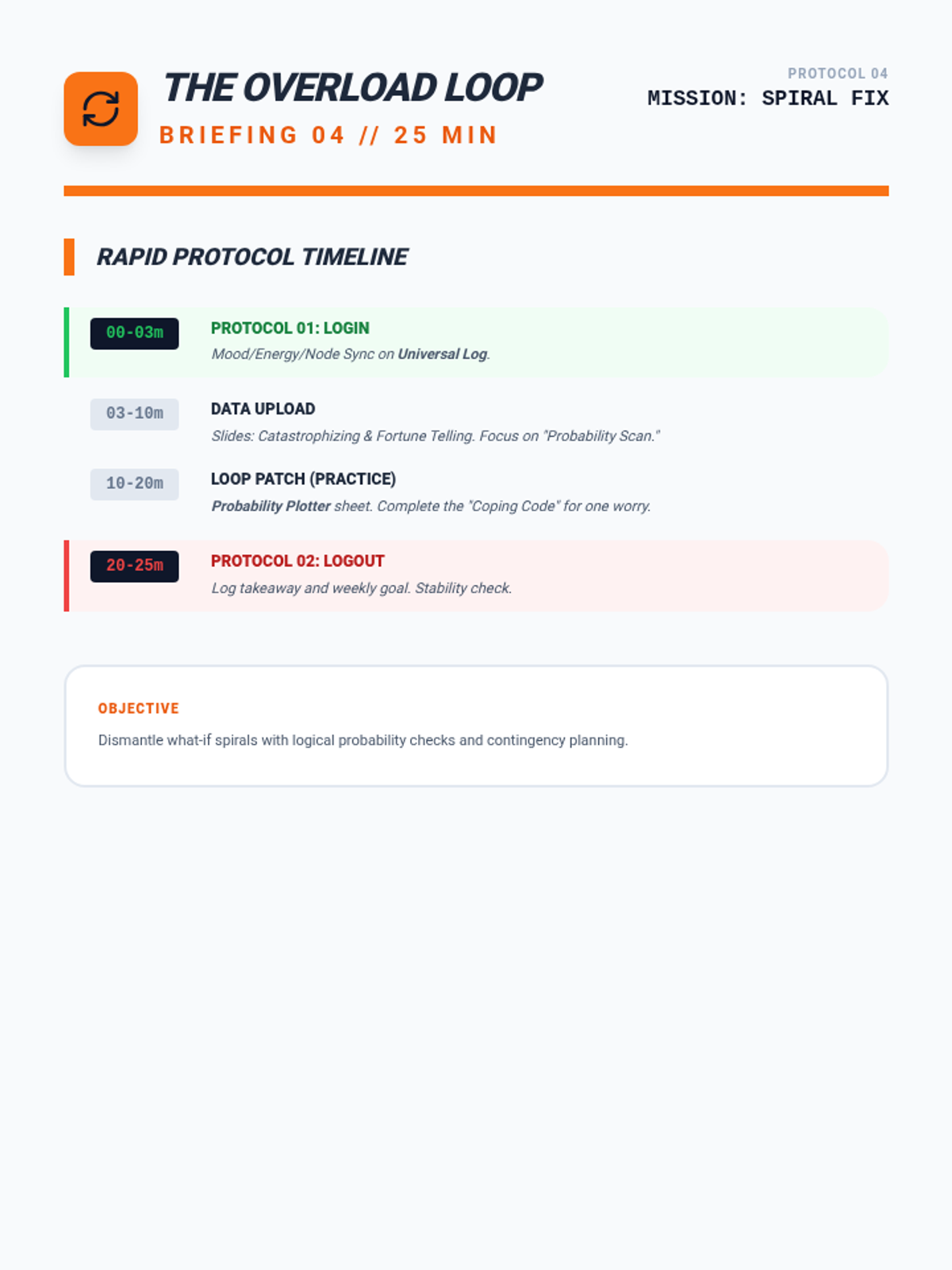Targets 'Catastrophizing' and 'Fortune Telling'. Students learn to stop the 'what if' spiral by assessing actual probabilities and creating contingency plans.