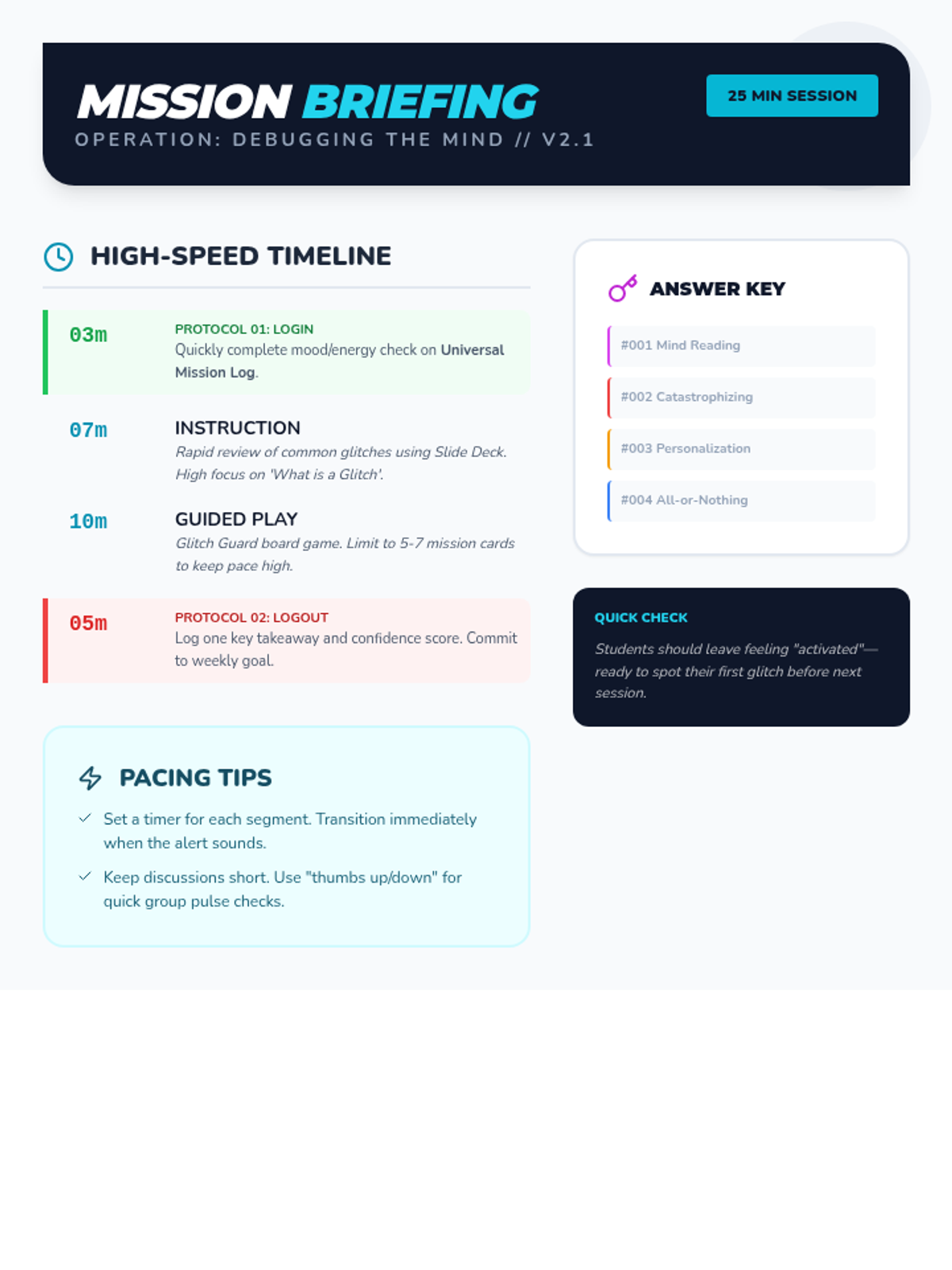 The core lesson of the Brain Glitch series, introducing cognitive distortions as 'system glitches' and using a cooperative board game to teach students how to identify and debug them.