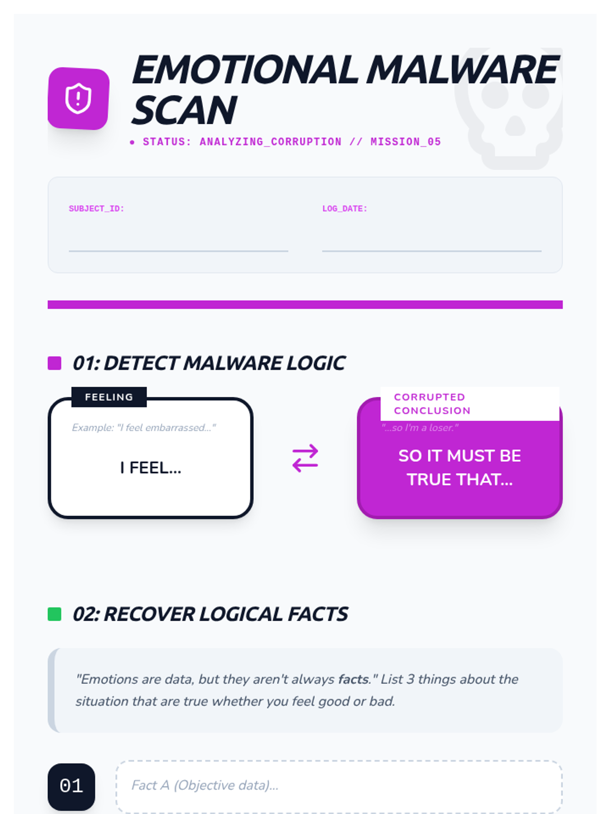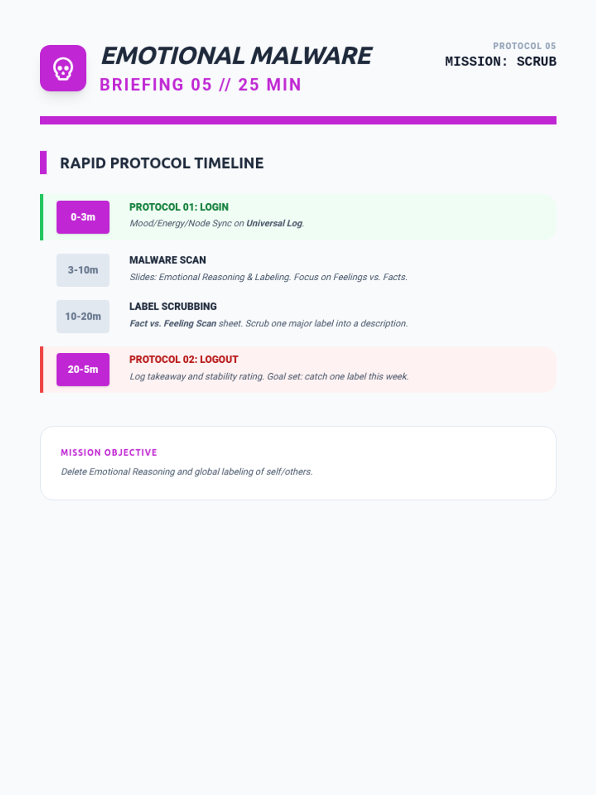 Addresses 'Emotional Reasoning' and 'Labeling'. Students learn to identify when their emotions are overwriting logic and how to strip away harmful labels from their self-identity.