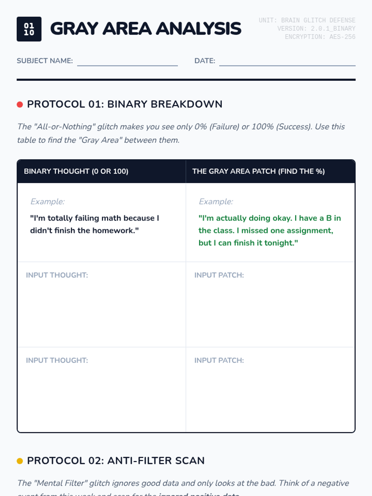 Focuses on 'All-or-Nothing' thinking and 'Mental Filtering'. Students learn to identify binary thinking patterns and practice finding the 'gray area' between extremes.