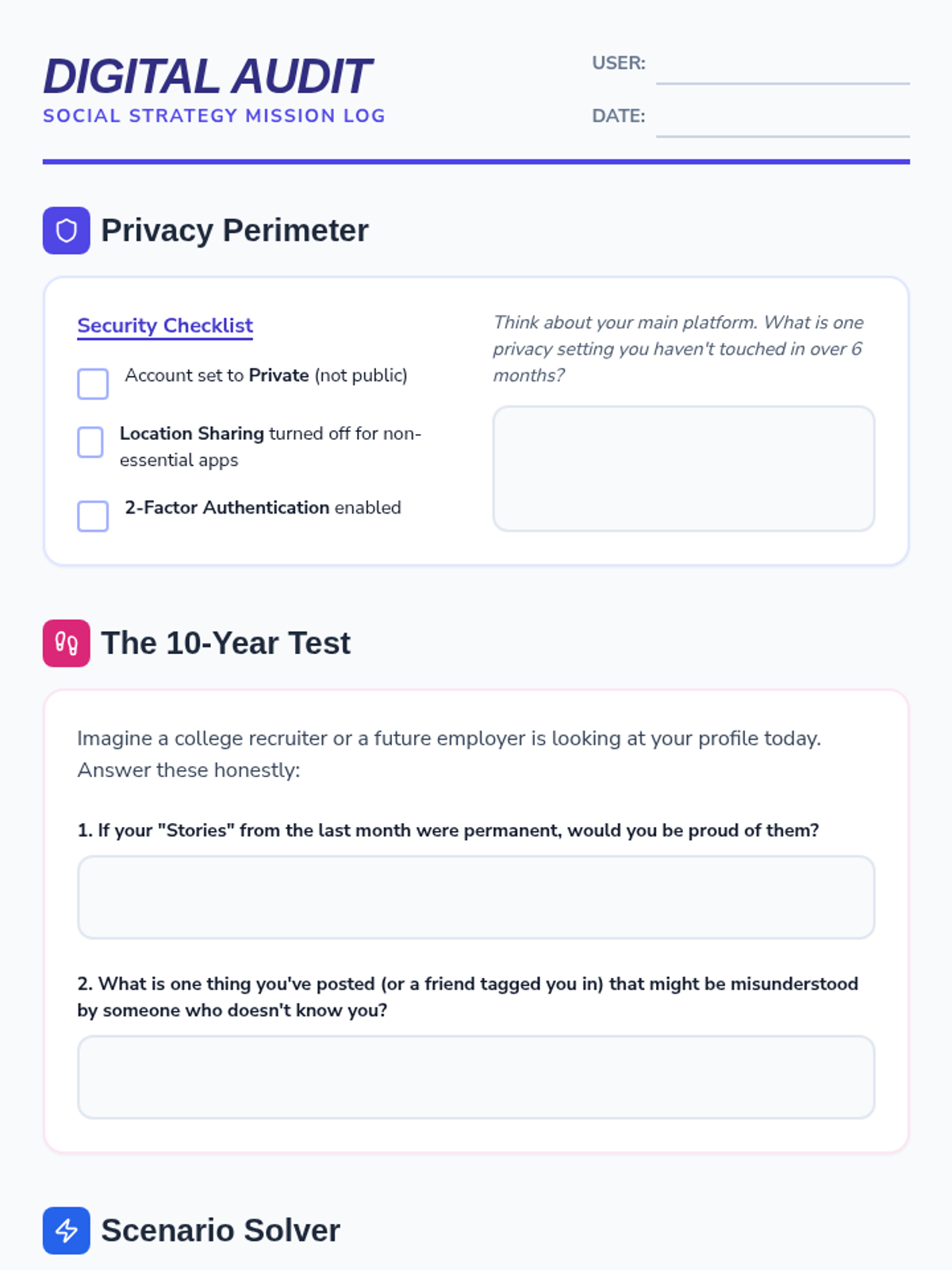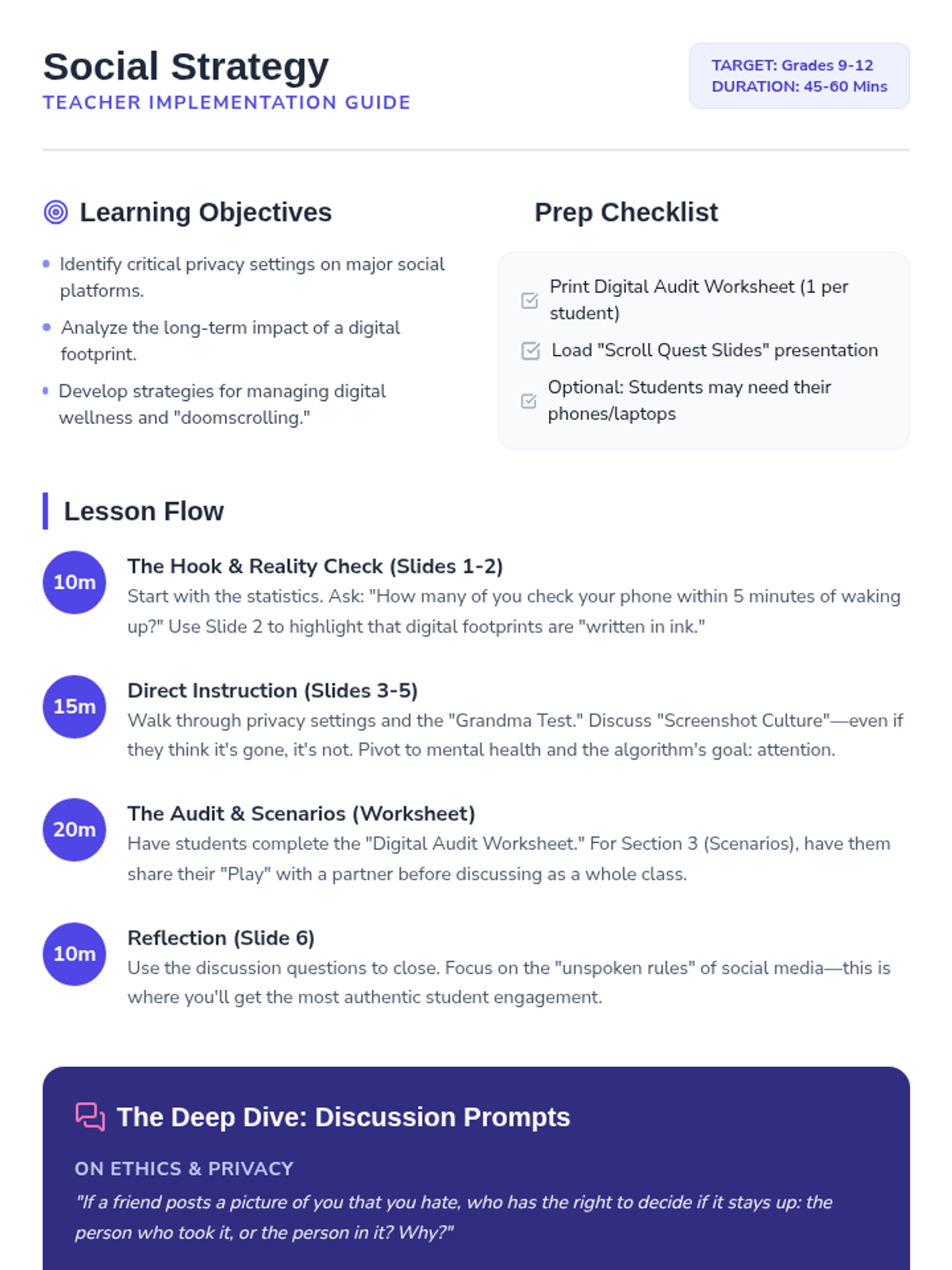 A high-energy, interactive lesson for high schoolers on navigating social media safely, focusing on privacy, digital footprints, and mental well-being.