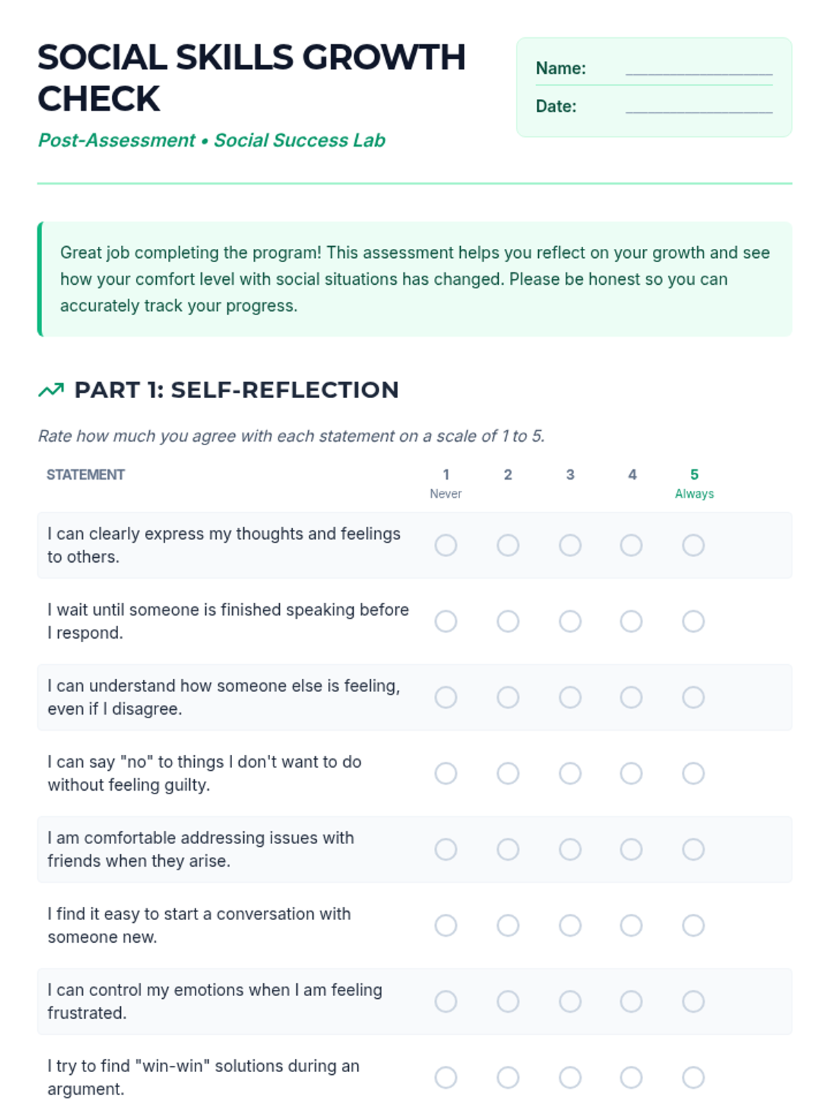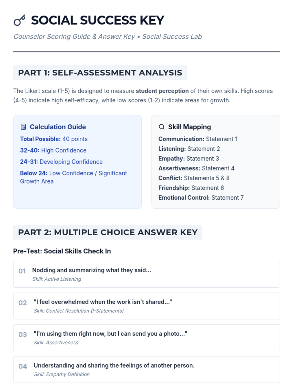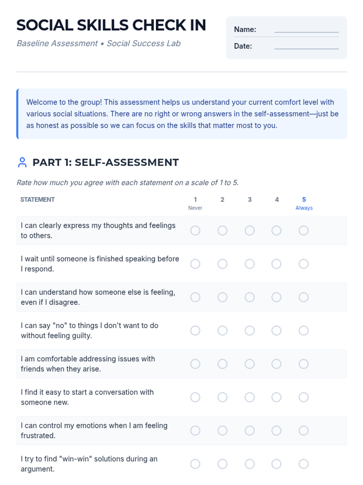A comprehensive pre and post-assessment set designed for high school social skills counseling groups, focusing on self-awareness, communication, and interpersonal effectiveness.