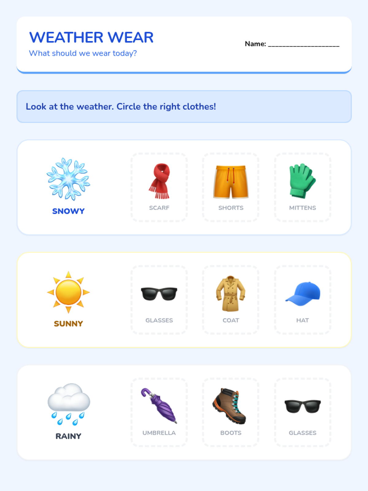 Identifies the four seasons and different types of weather, focusing on choosing appropriate clothing and sensory weather observations.