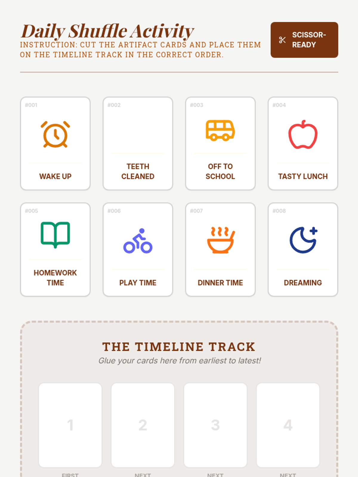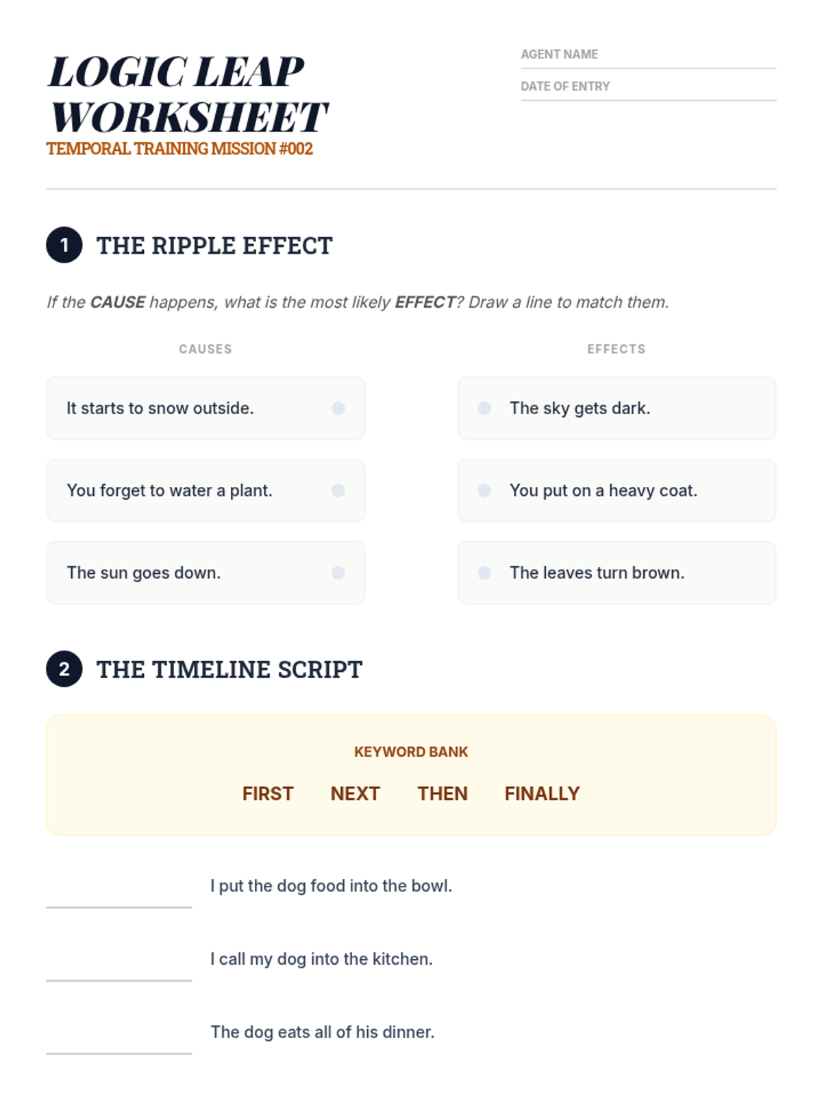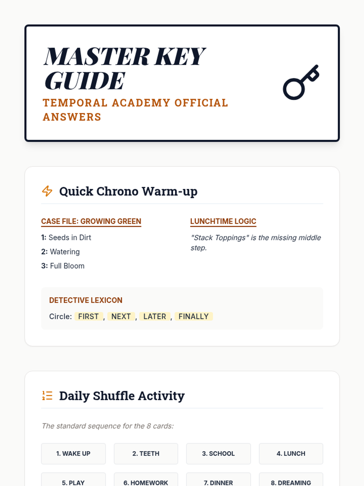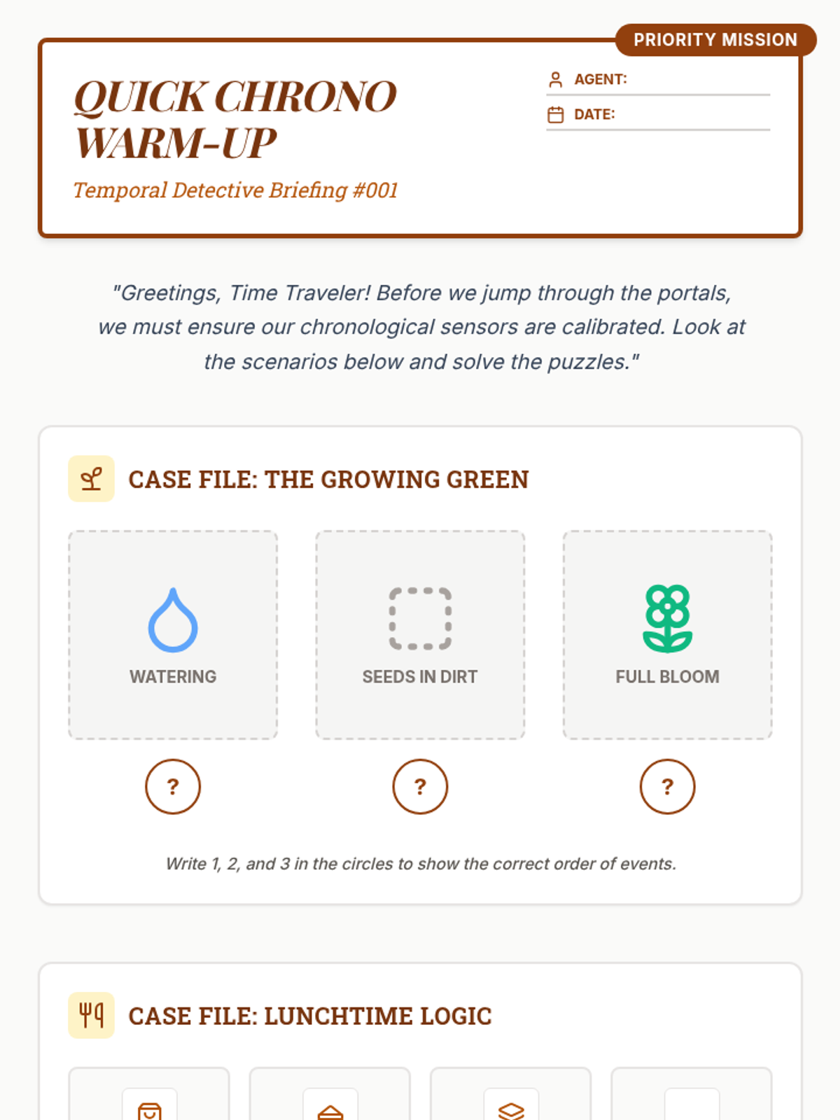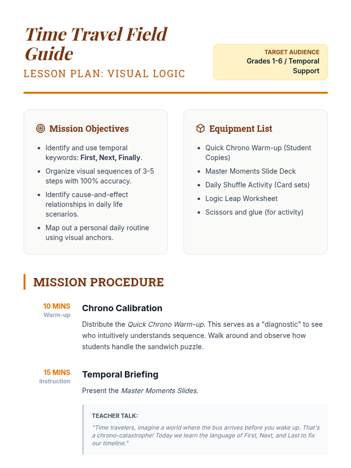 Students develop skills in identifying and organizing sequences of events using visual logic, temporal keywords, and daily routine mapping.