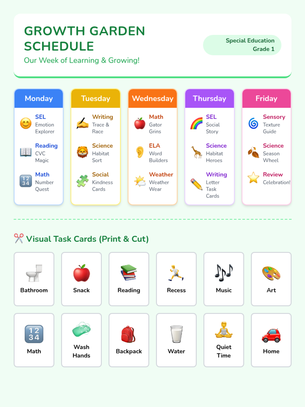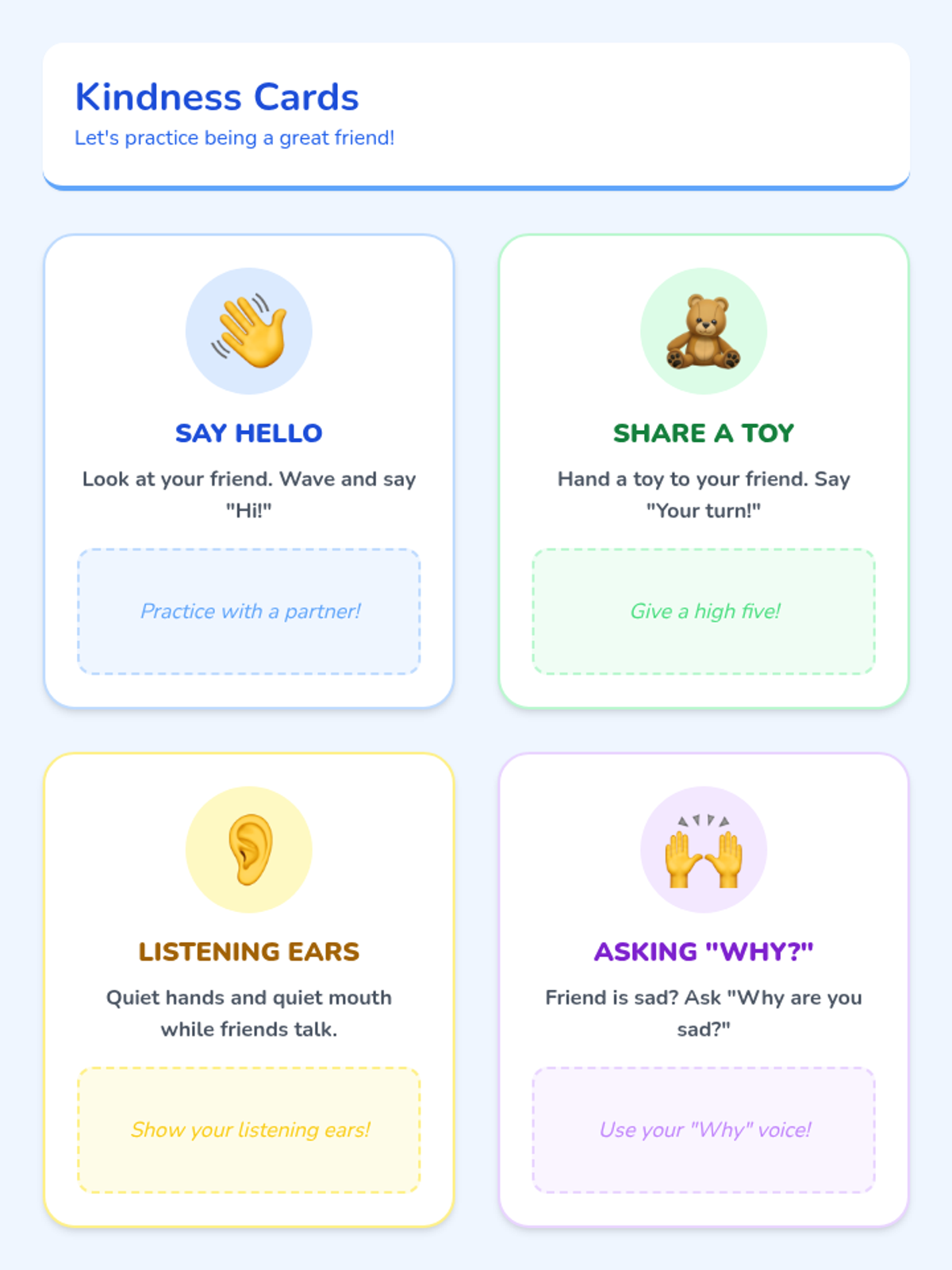 Focuses on identifying basic emotions (happy, sad, angry, surprised) and practicing simple social interactions through visual stories and matching activities.