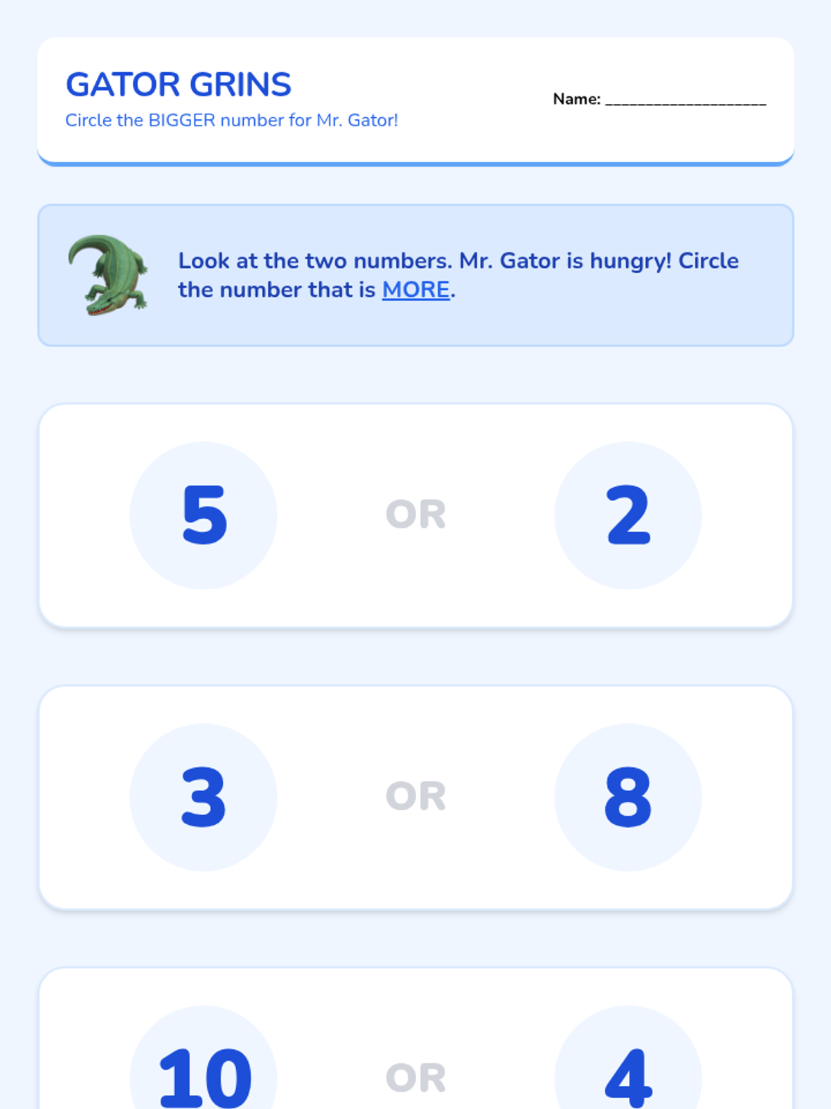 Covers number recognition and the concept of 'more' versus 'less' using visual 'greater than' alligator symbols and hands-on counting tasks.