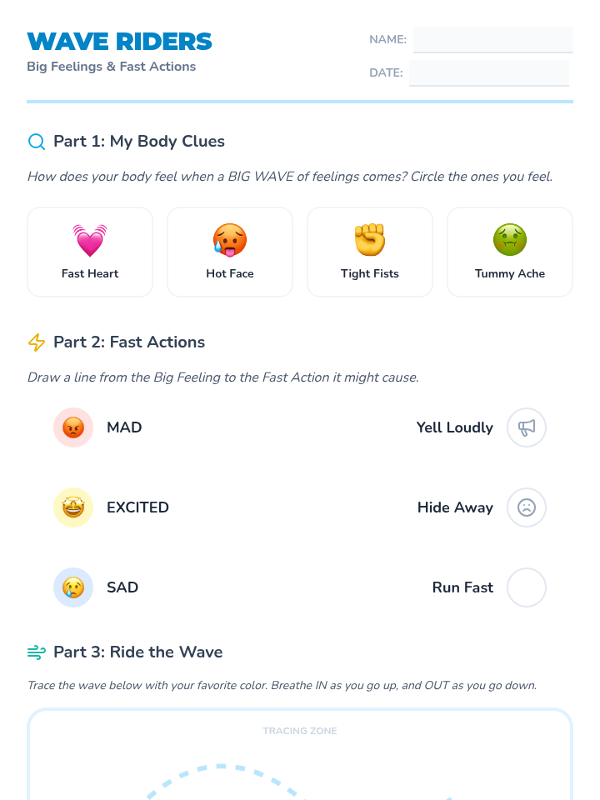 A 15-minute introductory lesson for 1st graders to help them recognize the physical sensations of strong emotions and practice 'Riding the Wave' through deep breathing to manage impulses.