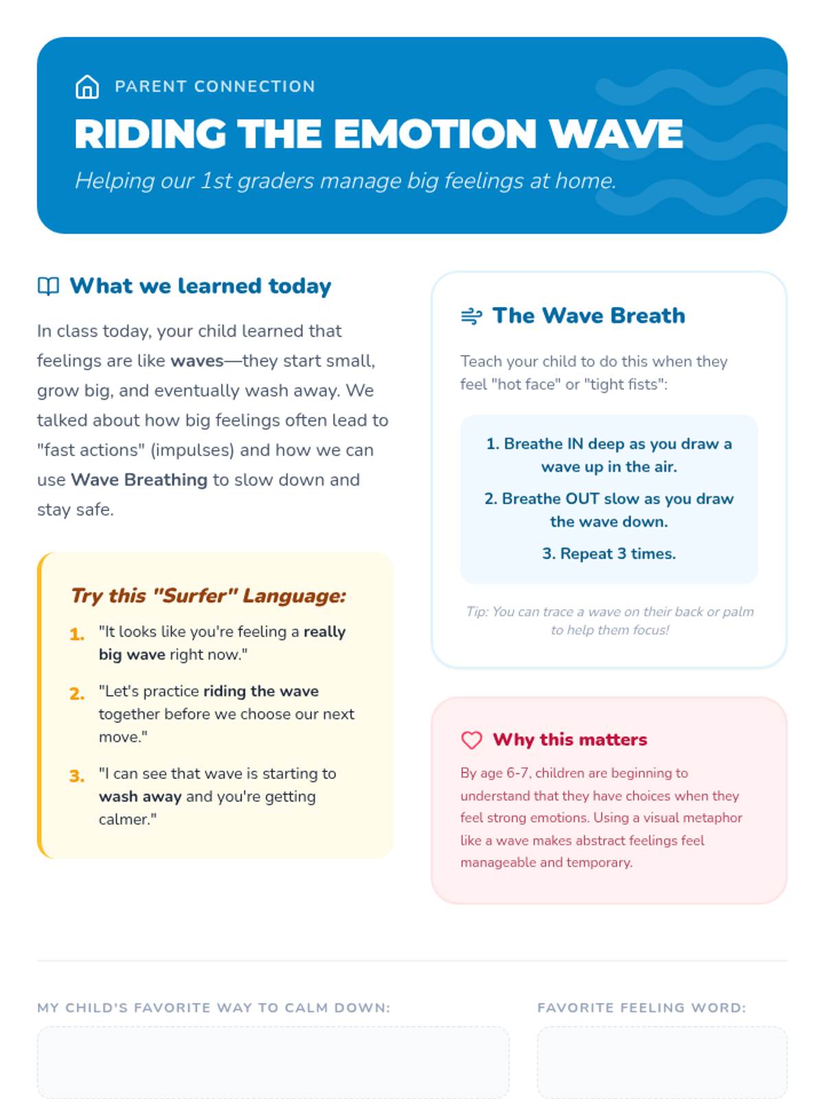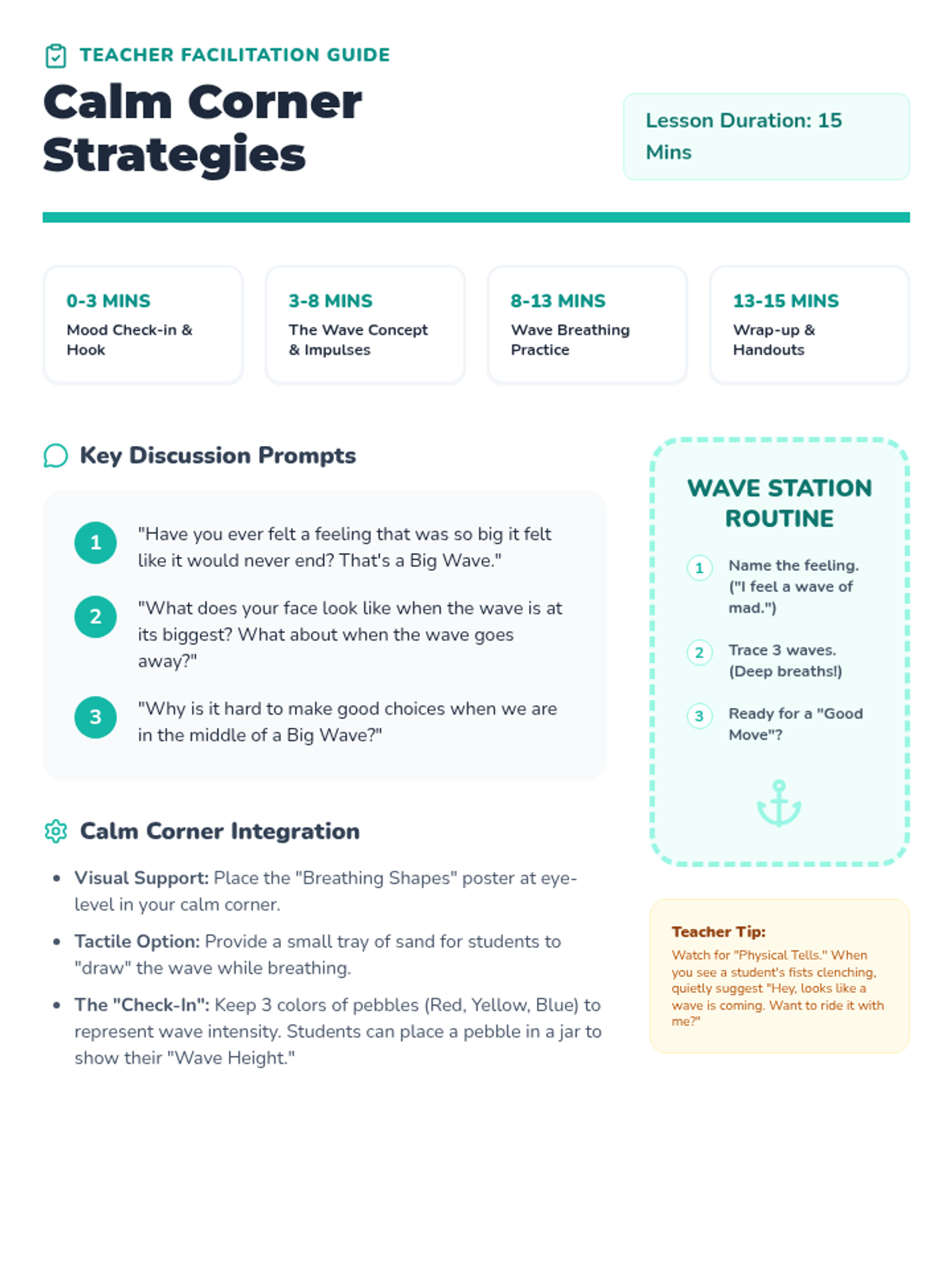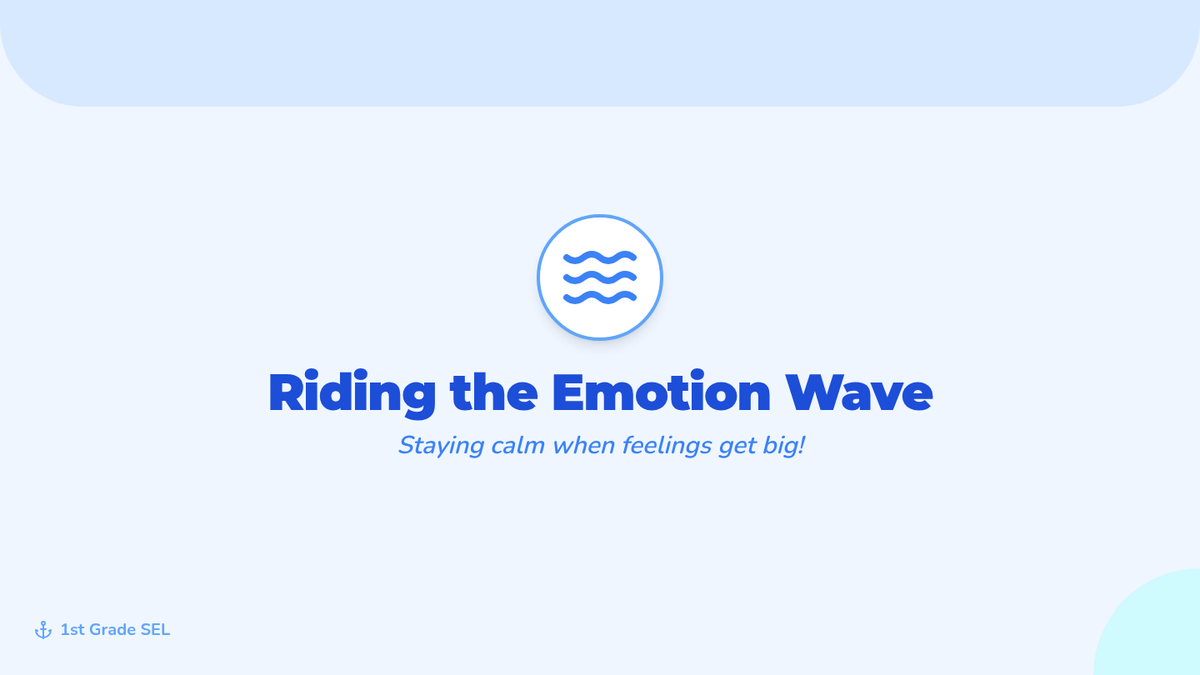 A 15-minute social-emotional learning lesson for 1st graders focused on recognizing intense emotions as 'waves' and using deep breathing to manage impulsive reactions.