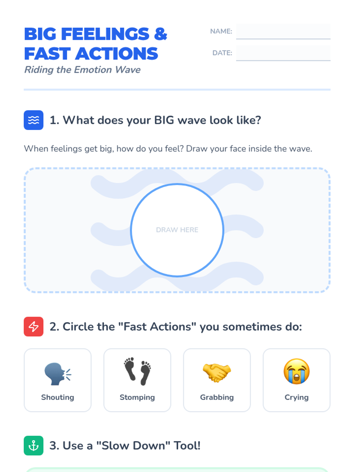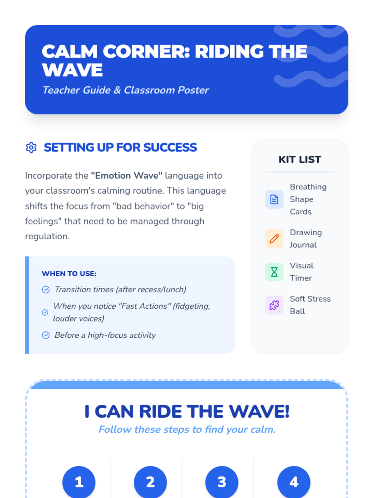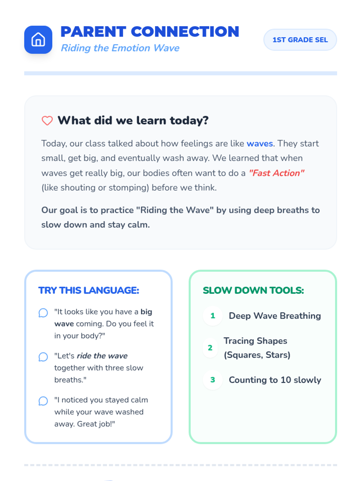 A 15-minute social-emotional learning lesson for 1st graders focused on recognizing intense emotions as 'waves' and using deep breathing to manage impulsive reactions.
