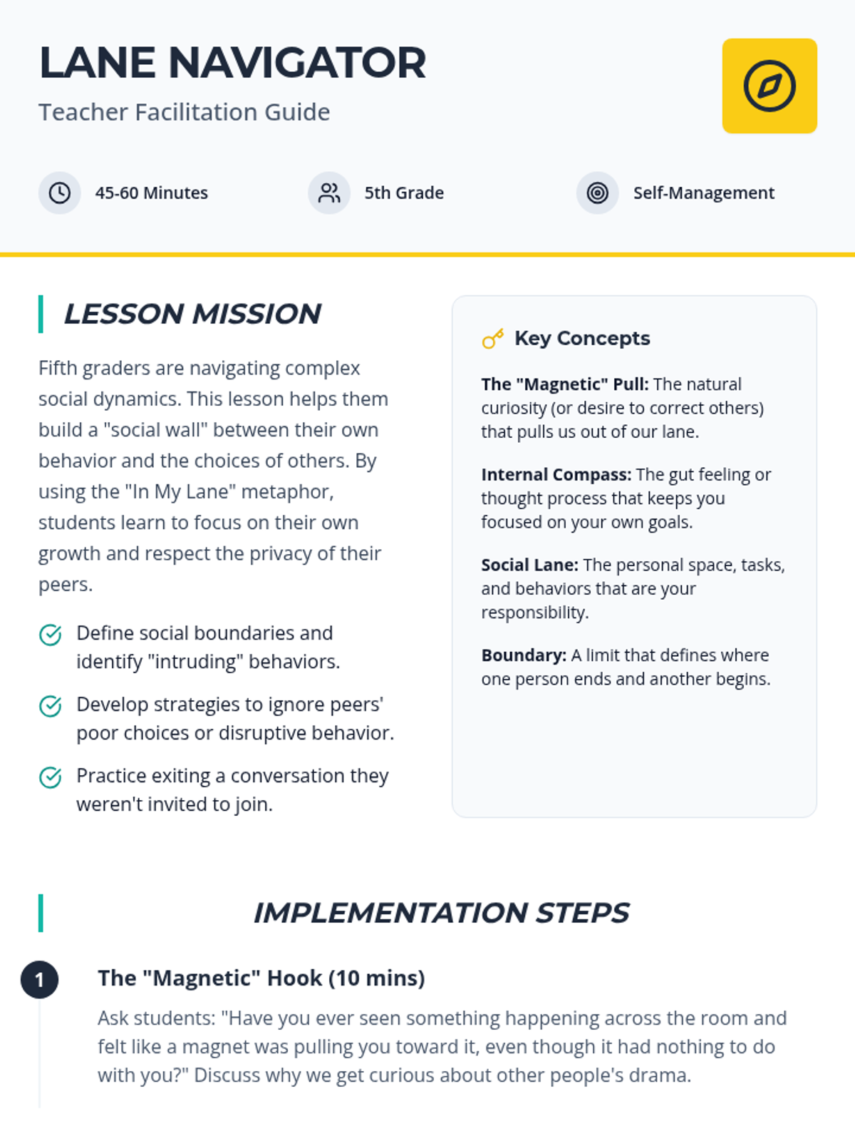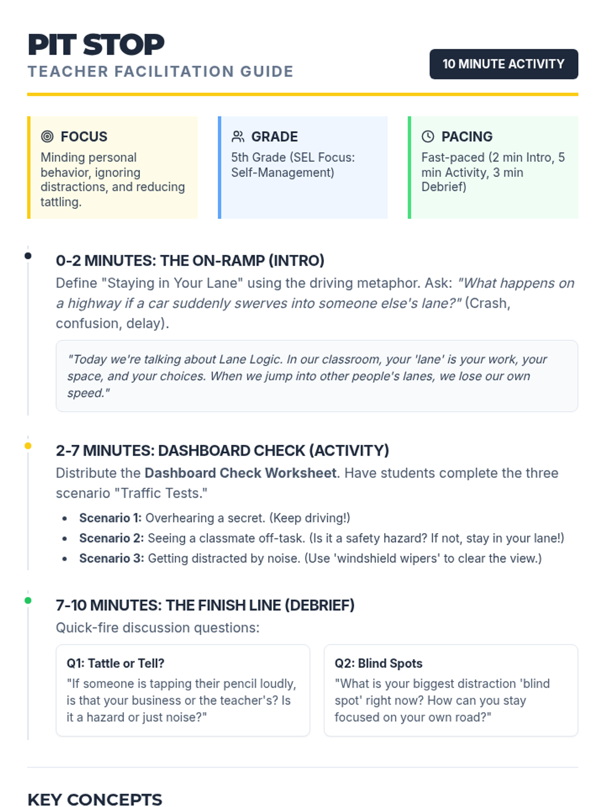 A high-energy, 10-minute SEL lesson for 5th graders focused on 'staying in your lane' by avoiding tattling, ignoring distractions, and maintaining personal focus.