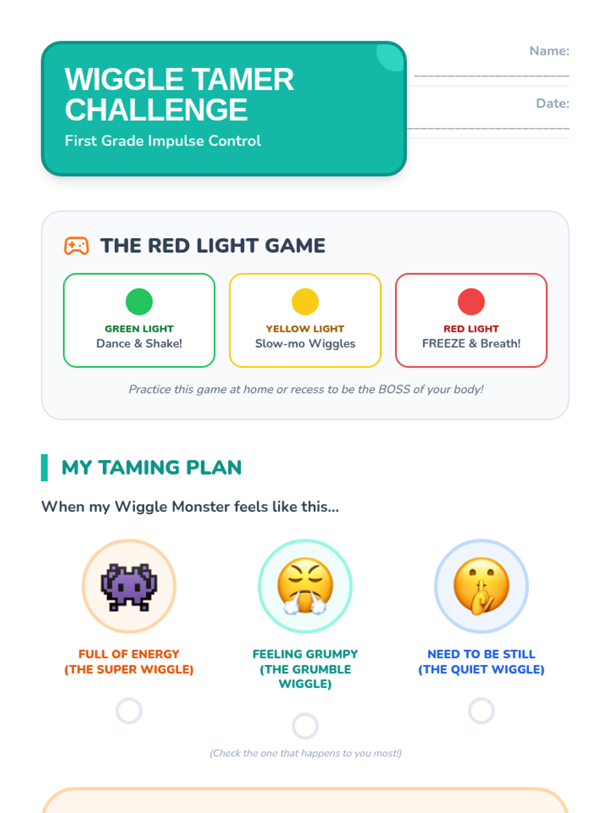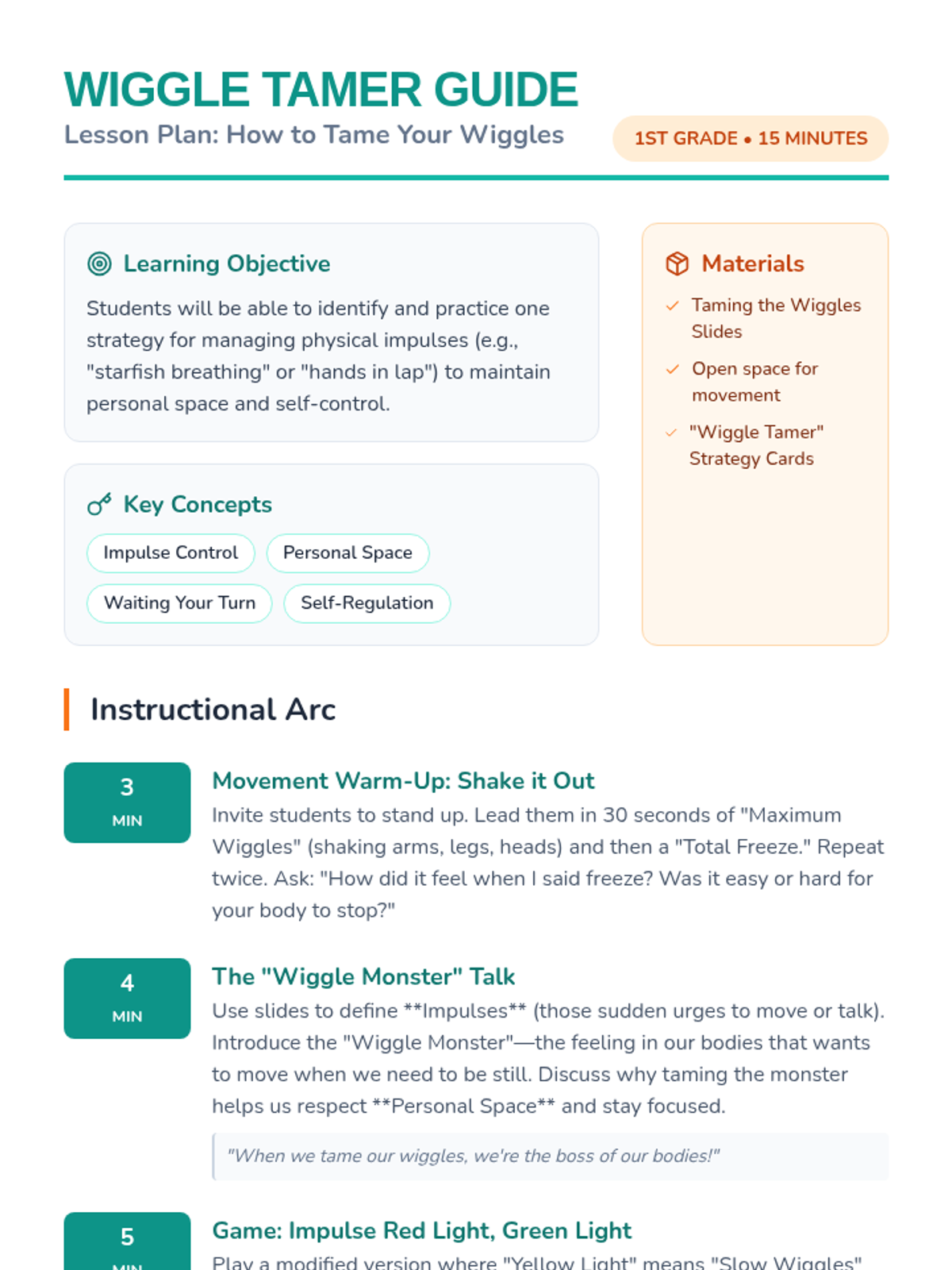 A 15-minute interactive social-emotional learning lesson designed to help 1st graders identify and manage physical impulses through movement and practice. Students explore the concept of 'wiggles' and learn concrete strategies like deep breathing to maintain self-control.