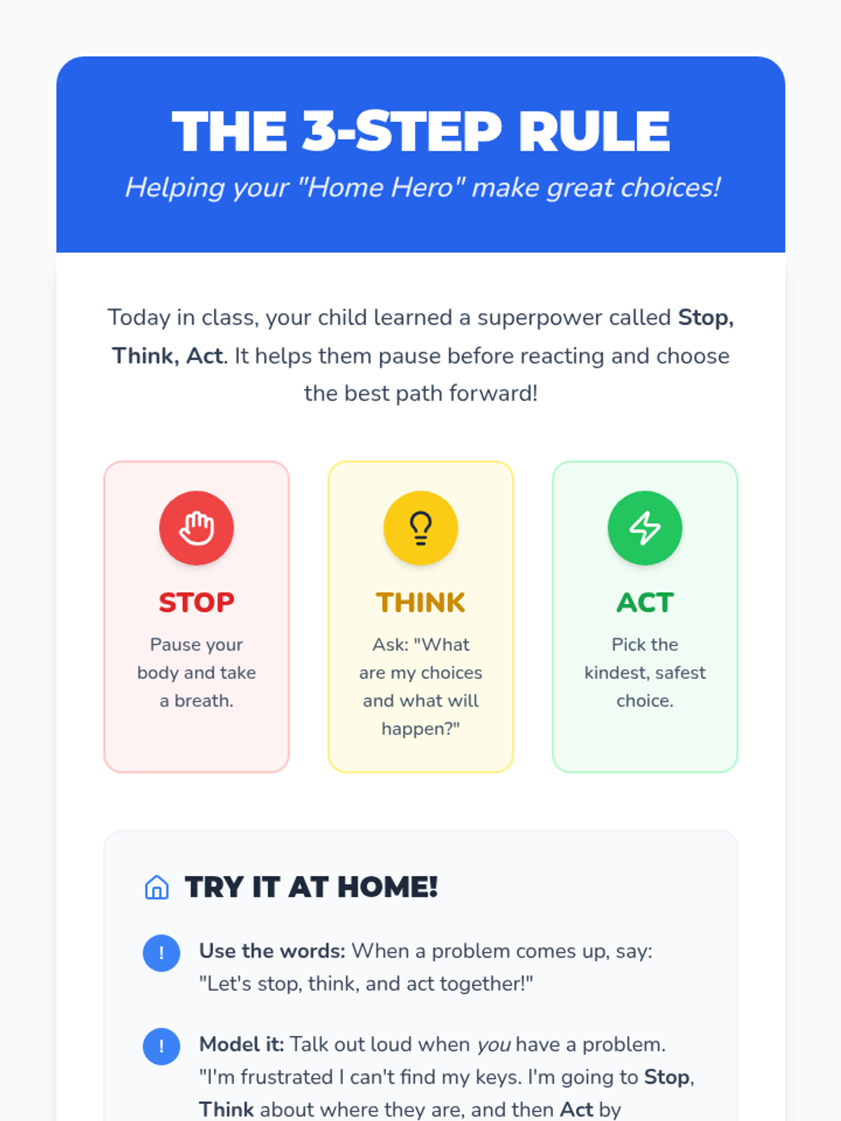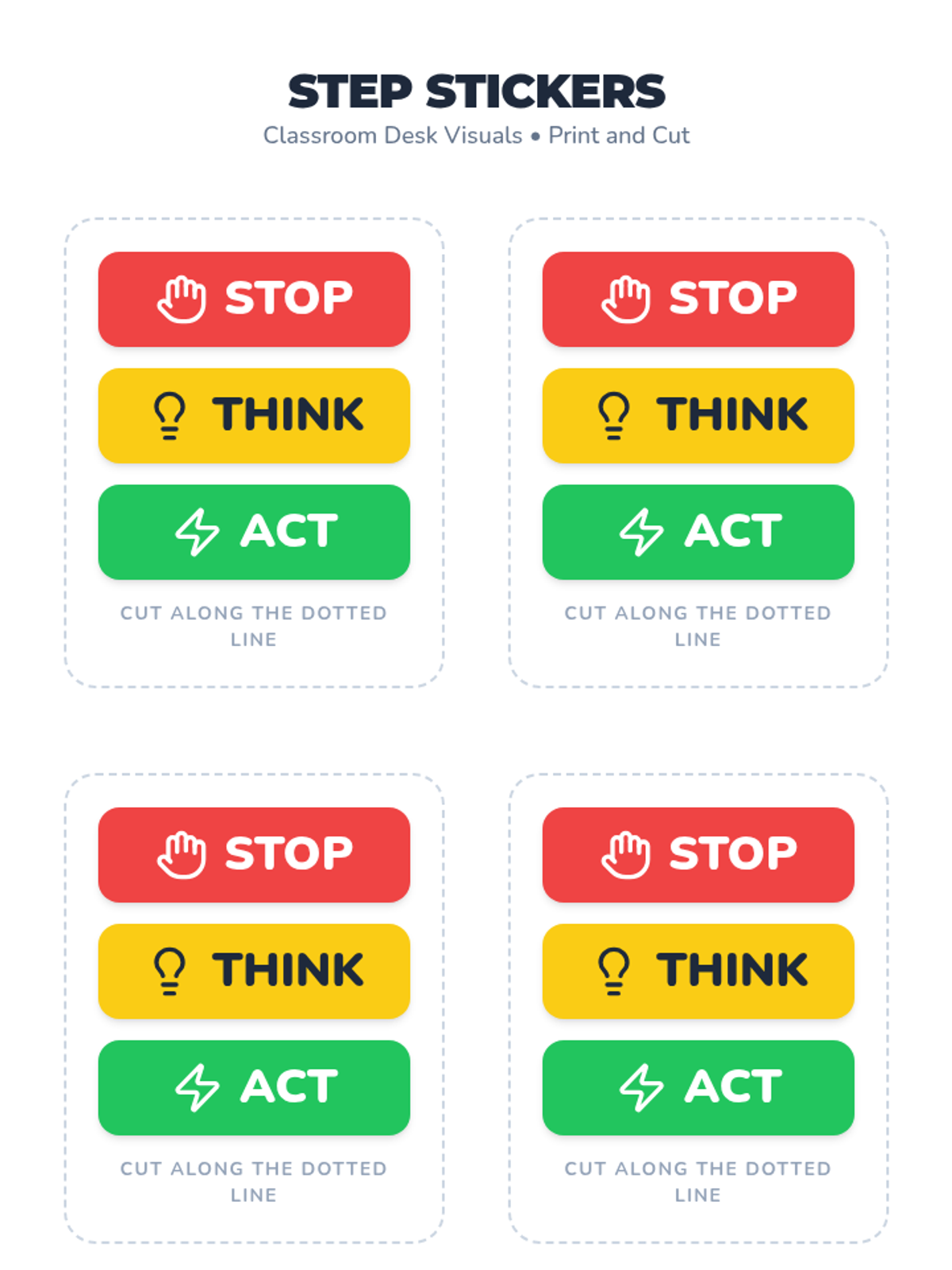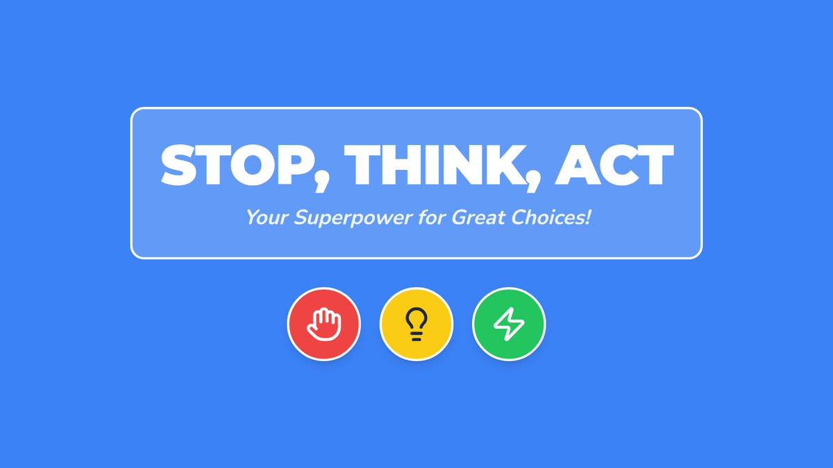 A 15-minute introductory lesson for 1st graders on the Stop-Think-Act model for self-regulation and problem-solving. Students learn to pause before reacting, consider their options, and choose the best action.
