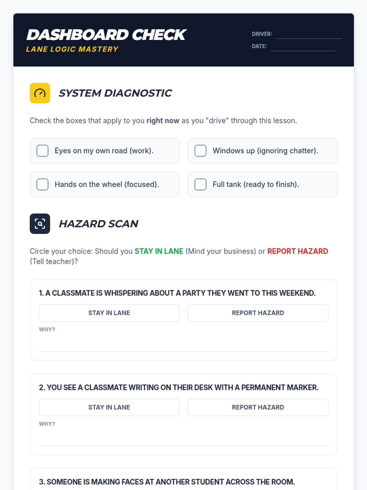 Students explore the concept of 'social lanes,' learning how to identify when they are overstepping boundaries into others' business and how to stay focused on their own choices and behaviors.