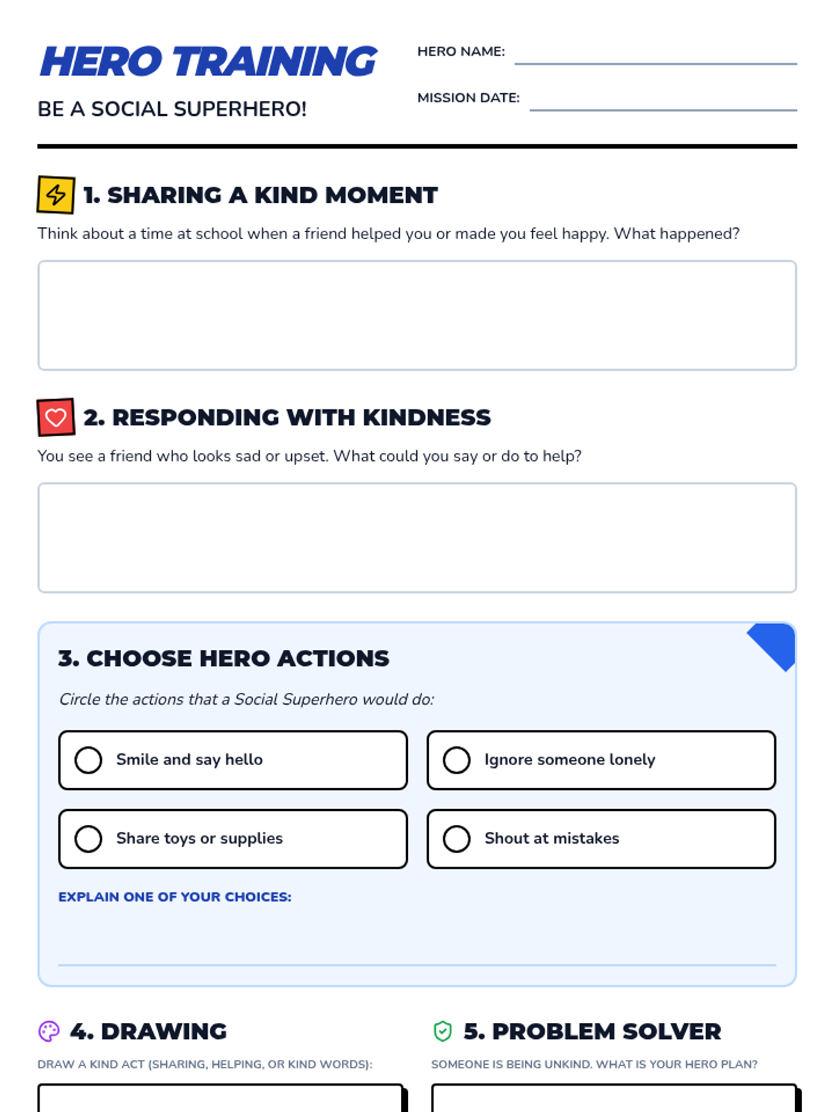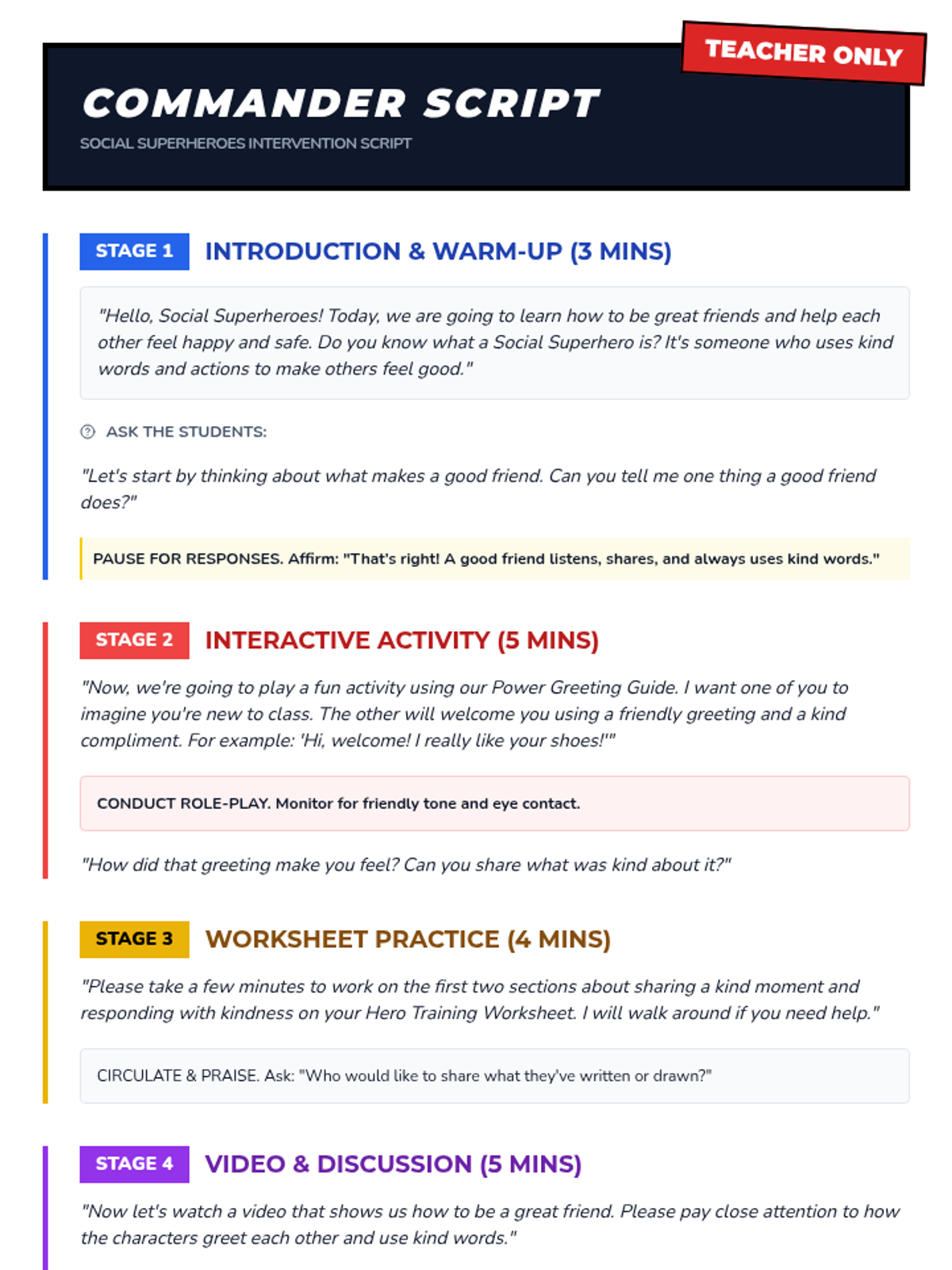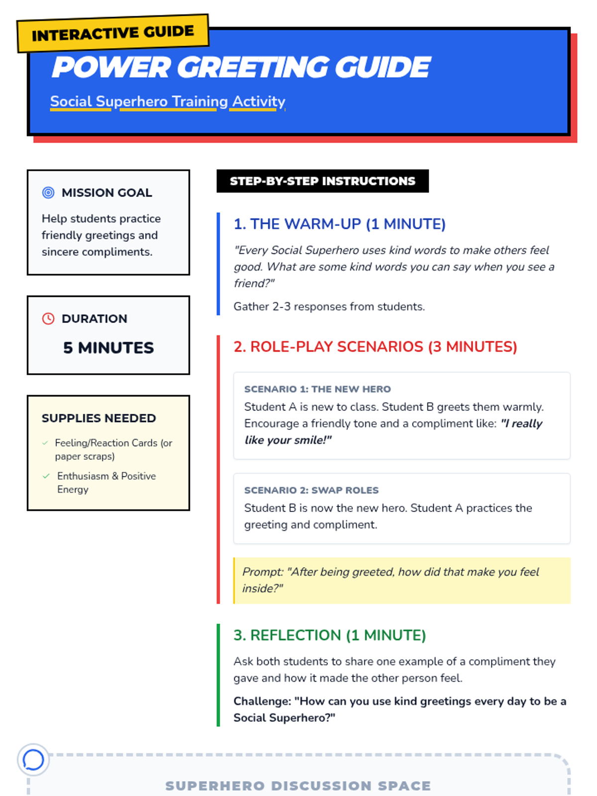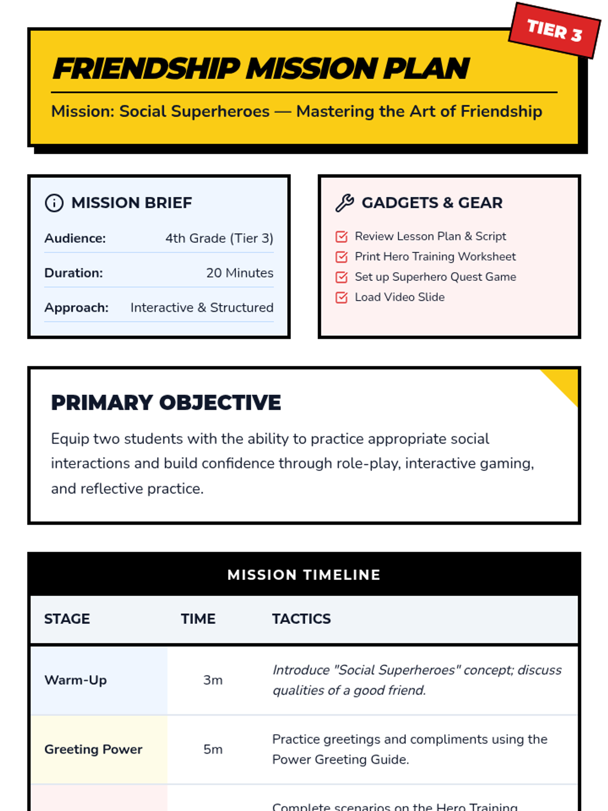 A 20-minute Tier 3 intervention for fourth-graders focusing on greetings, compliments, and empathetic responses through a fun superhero-themed lens.