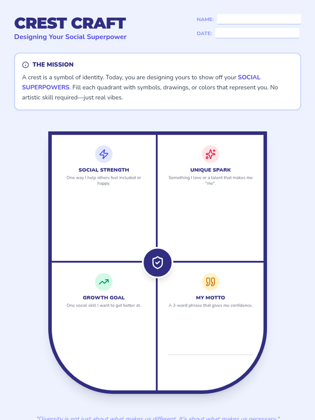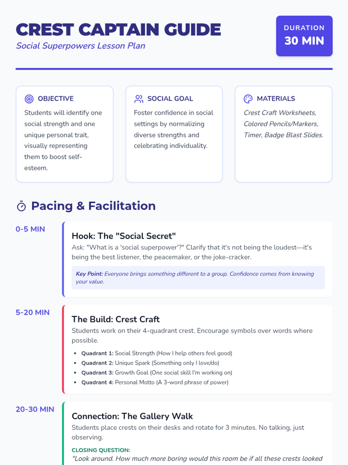 A fast-paced, 30-minute workshop where students design personal 'Social Superpower Crests' to celebrate their unique traits and build confidence in group settings.