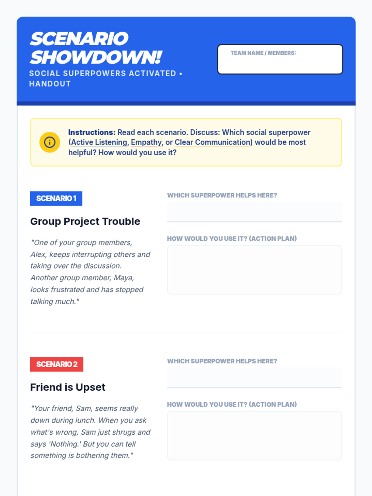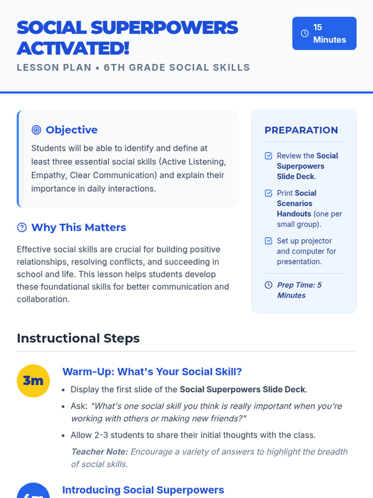 A 15-minute Tier 1 lesson for 6th graders to identify and practice essential social skills (Active Listening, Empathy, and Clear Communication) through a superhero-themed lens.