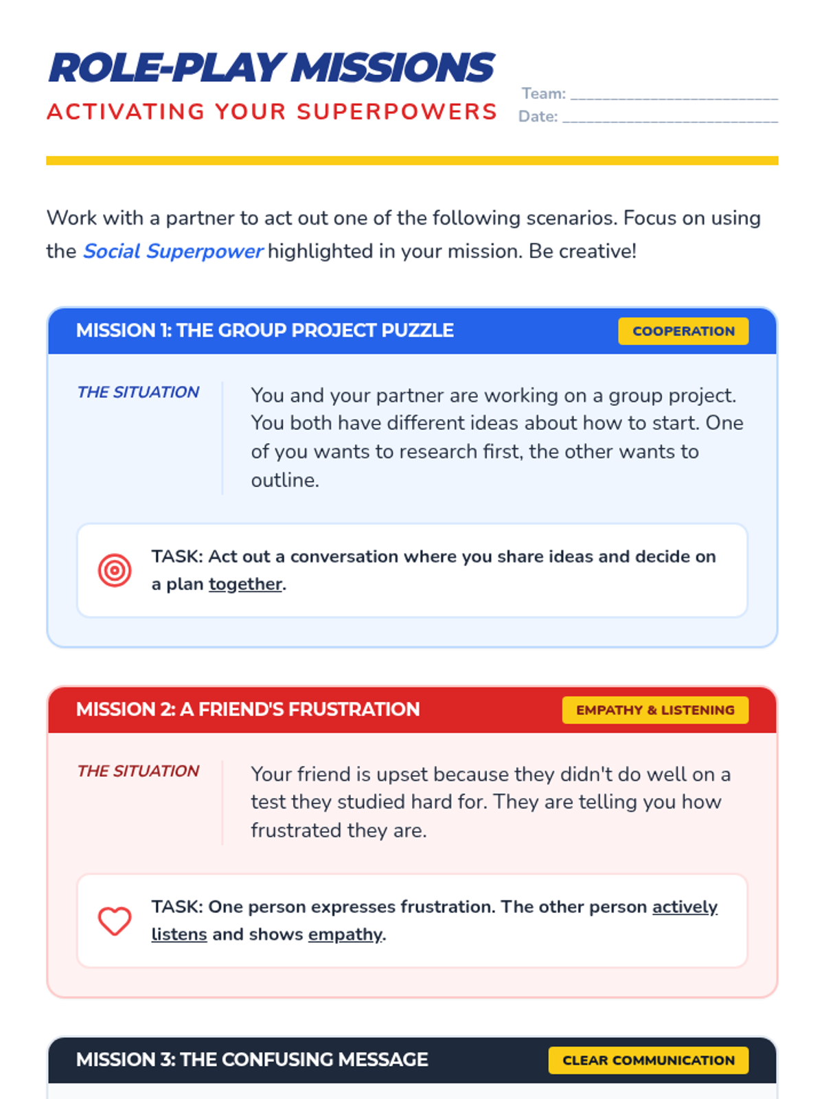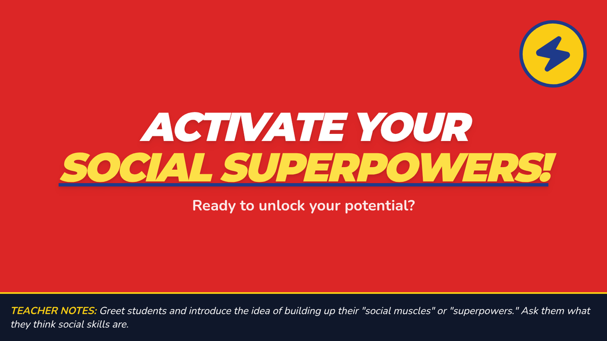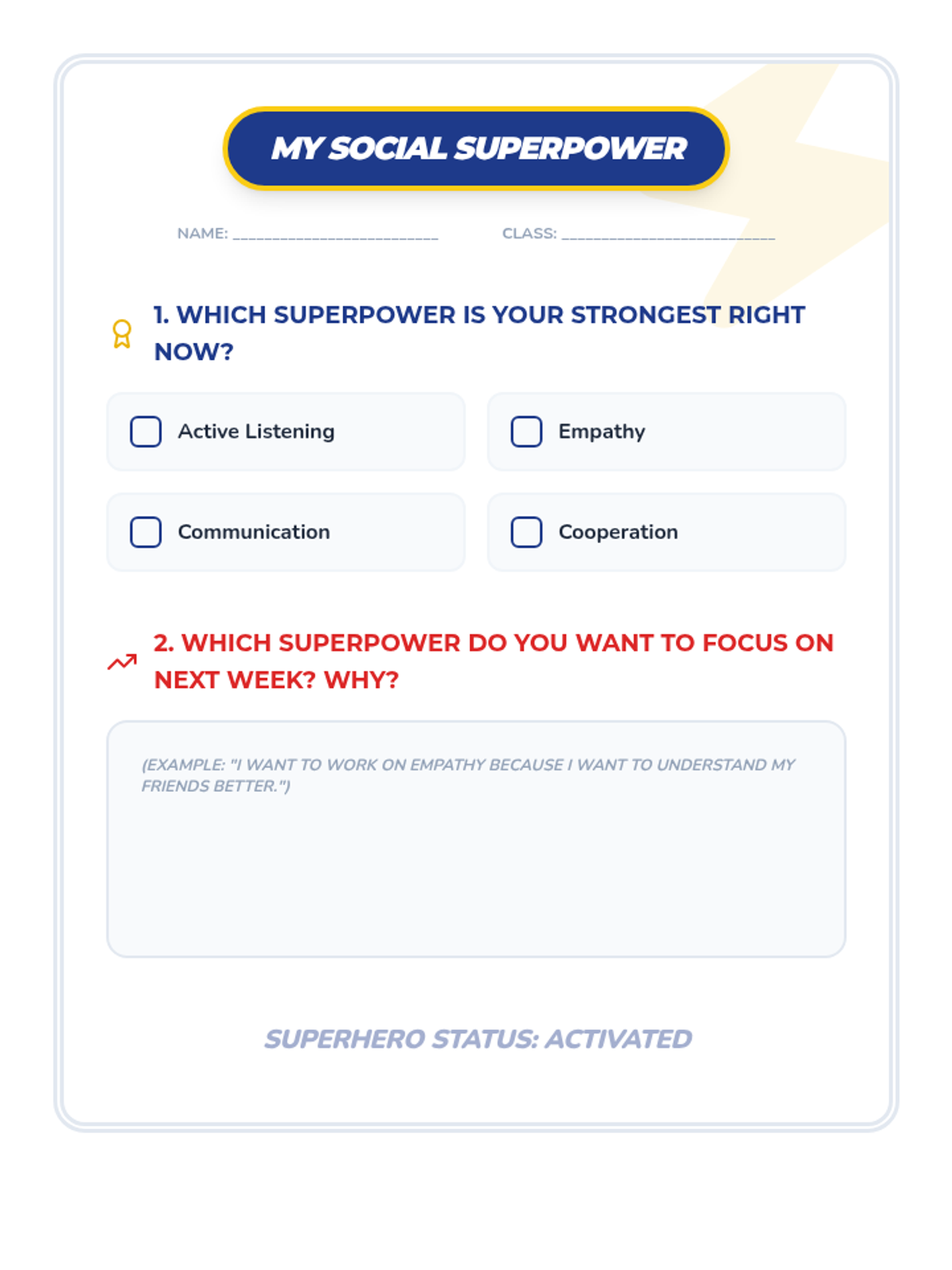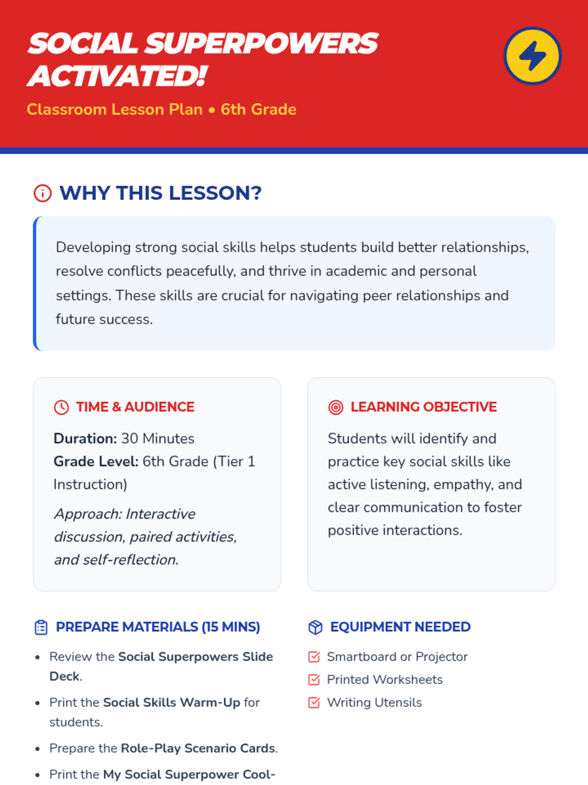 A high-energy 30-minute lesson for 6th graders to 'activate' their social skills—active listening, empathy, clear communication, and cooperation—using a superhero theme.