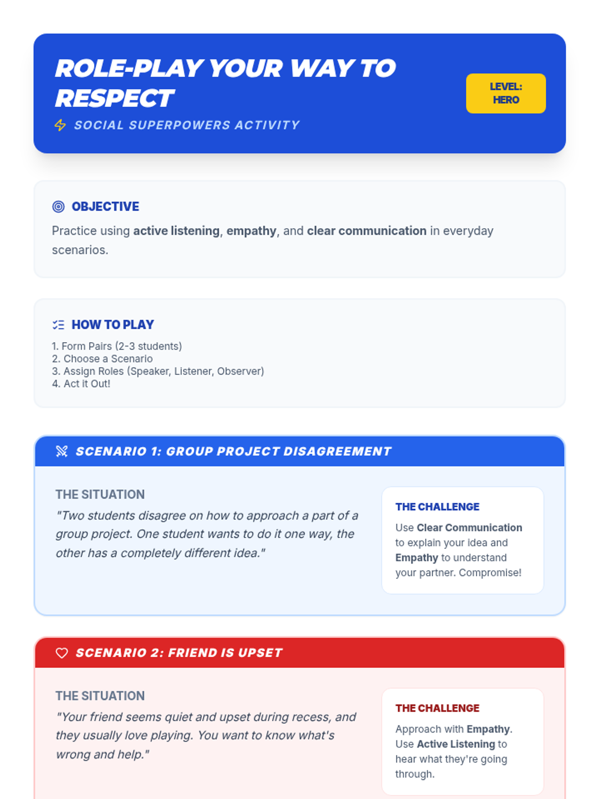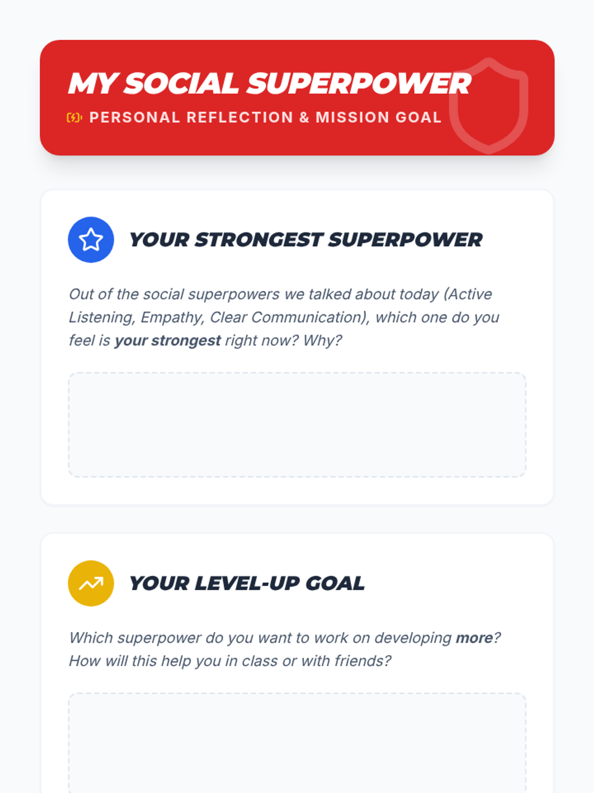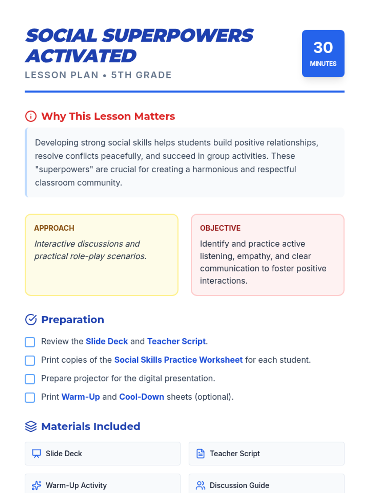 A 30-minute interactive lesson for 5th-grade students to identify and practice key social skills like active listening, empathy, and clear communication through a 'superpower' theme.