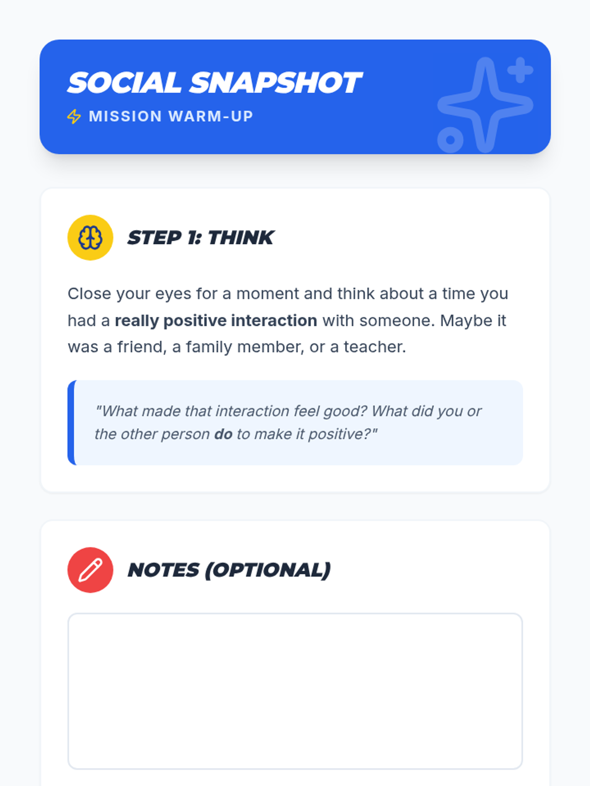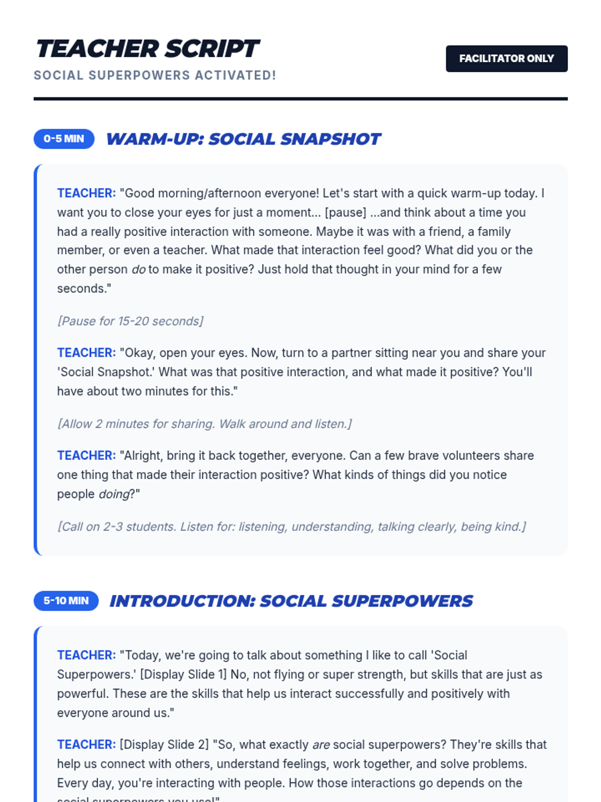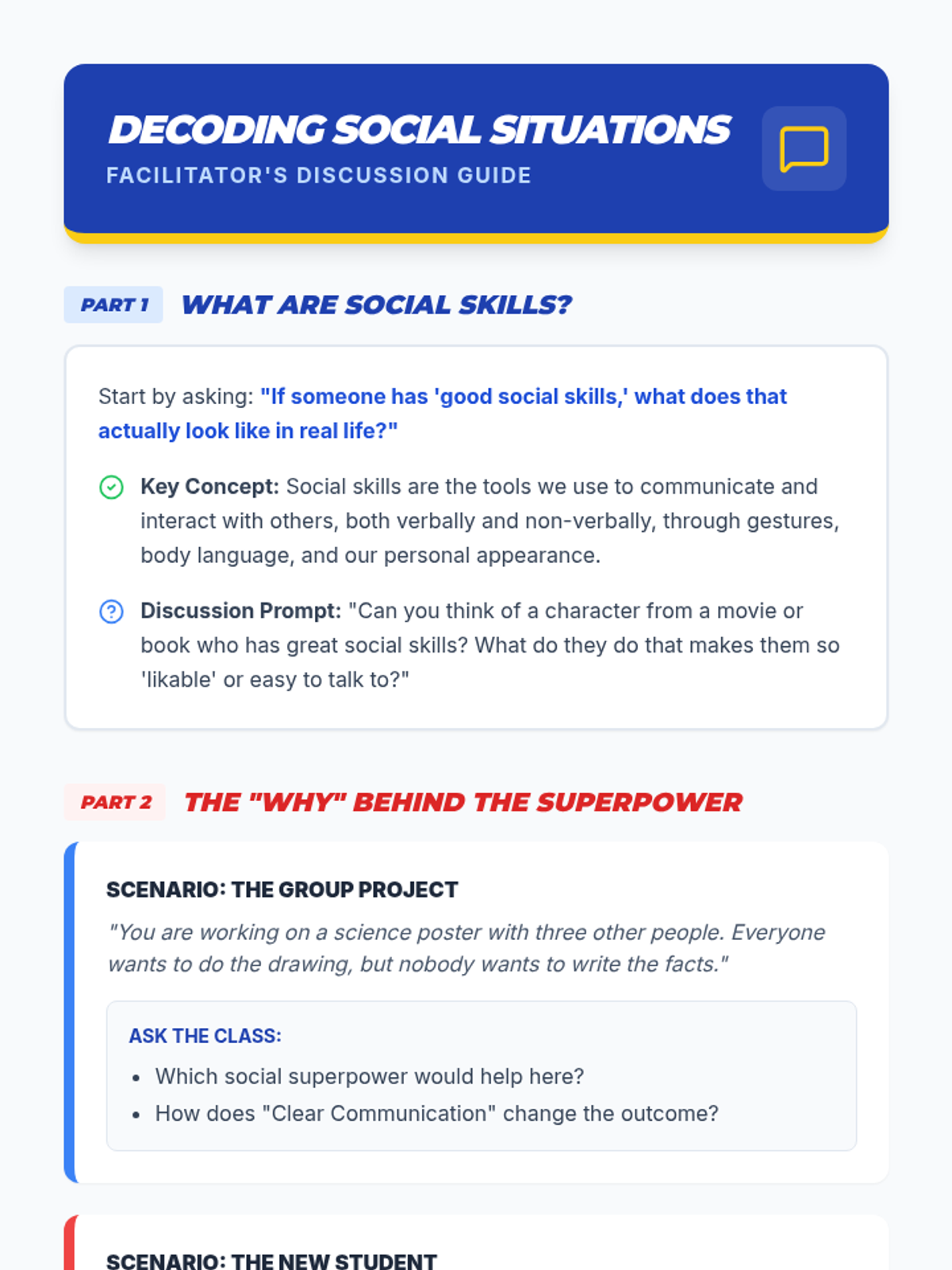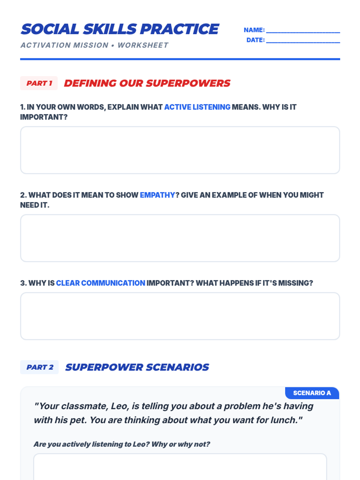 A 30-minute interactive lesson for 5th-grade students to identify and practice key social skills like active listening, empathy, and clear communication through a 'superpower' theme.