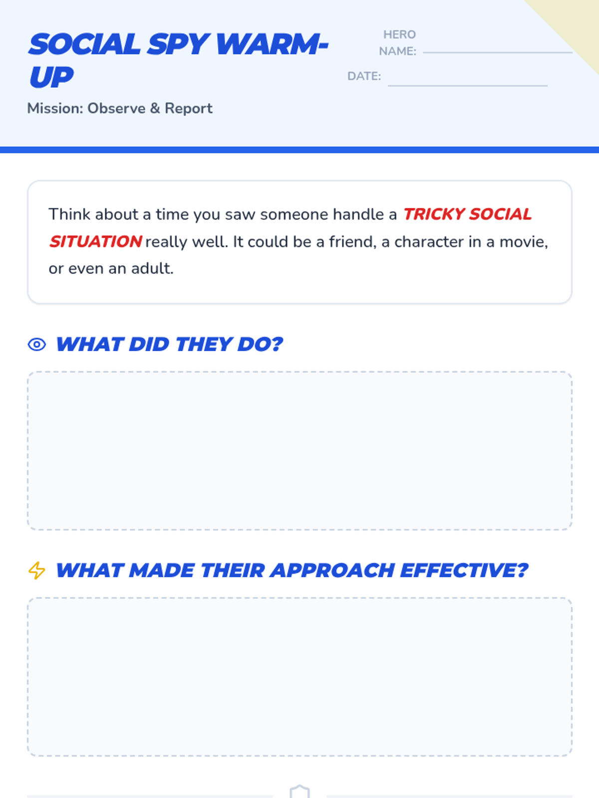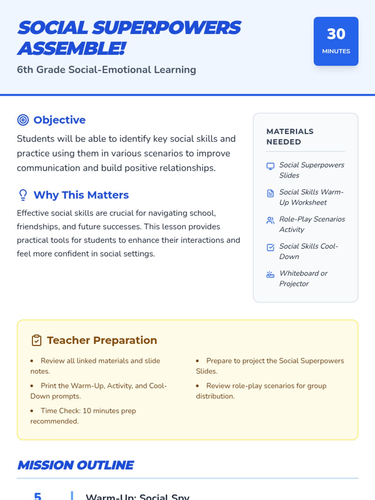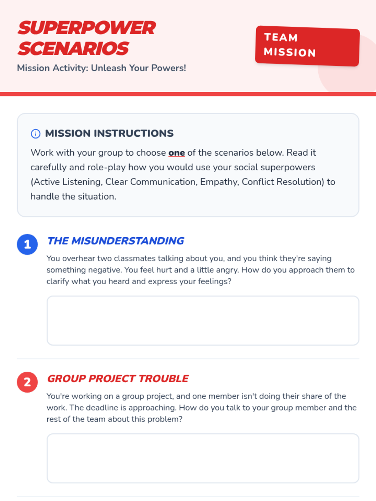 An interactive lesson for 6th graders to identify and practice essential social skills like active listening, empathy, and conflict resolution using a superhero theme.