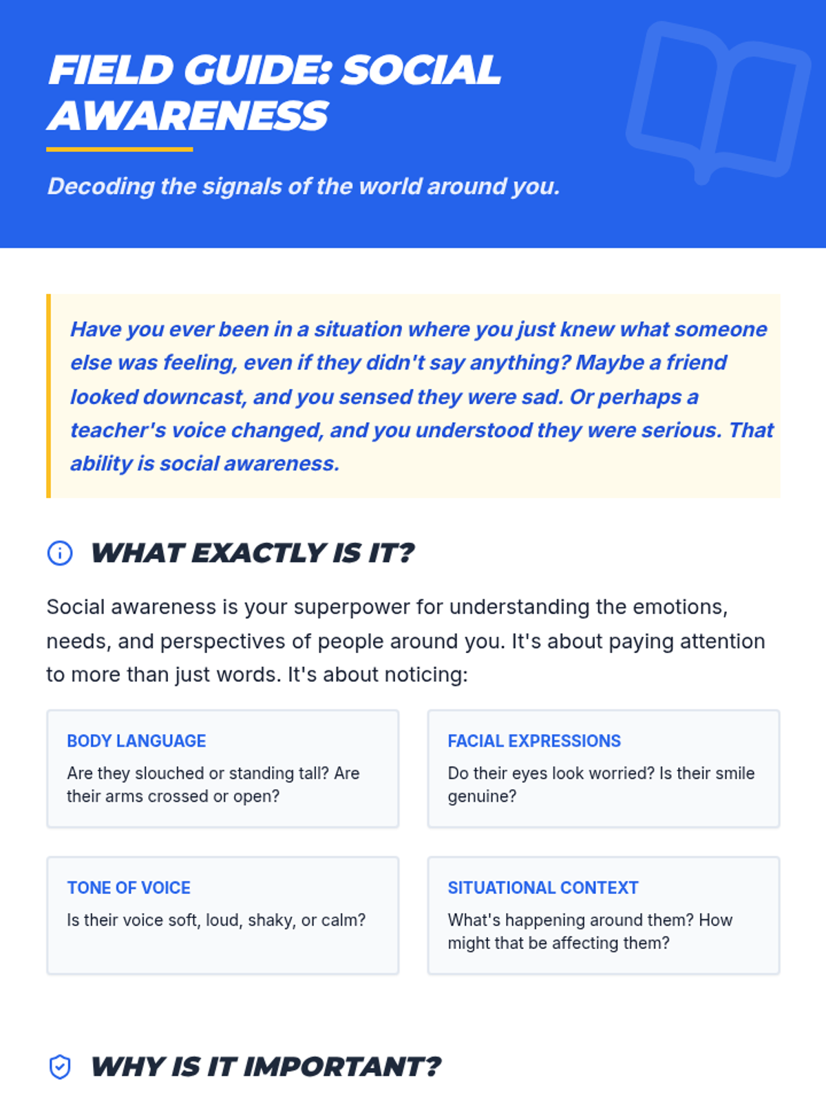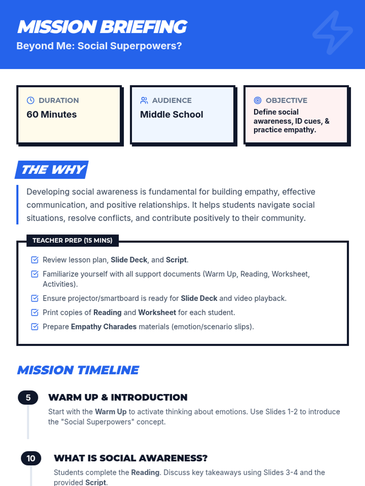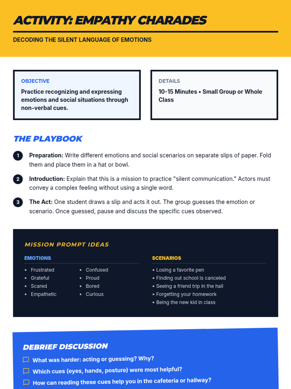 A one-hour middle school lesson designed to help students develop social awareness by identifying verbal and non-verbal cues and practicing empathy and perspective-taking.