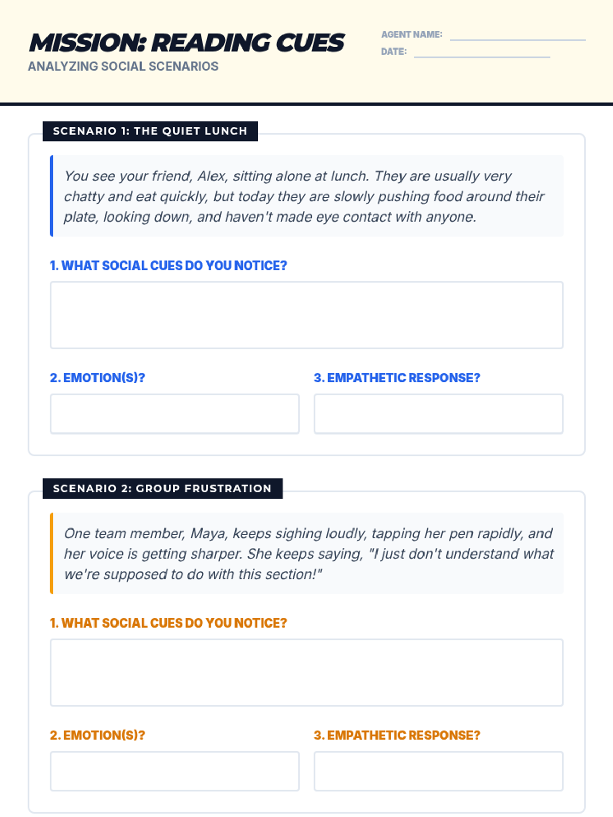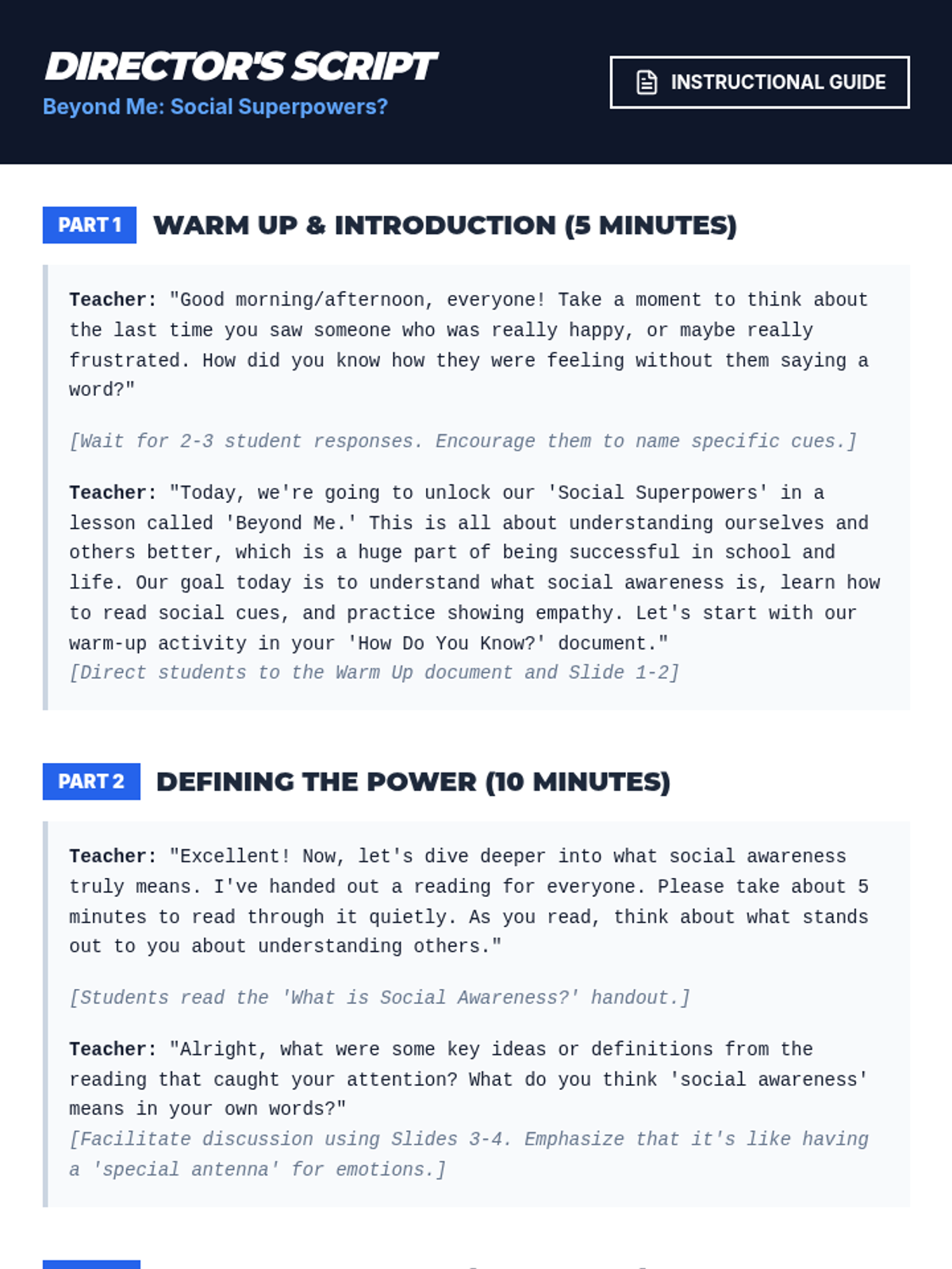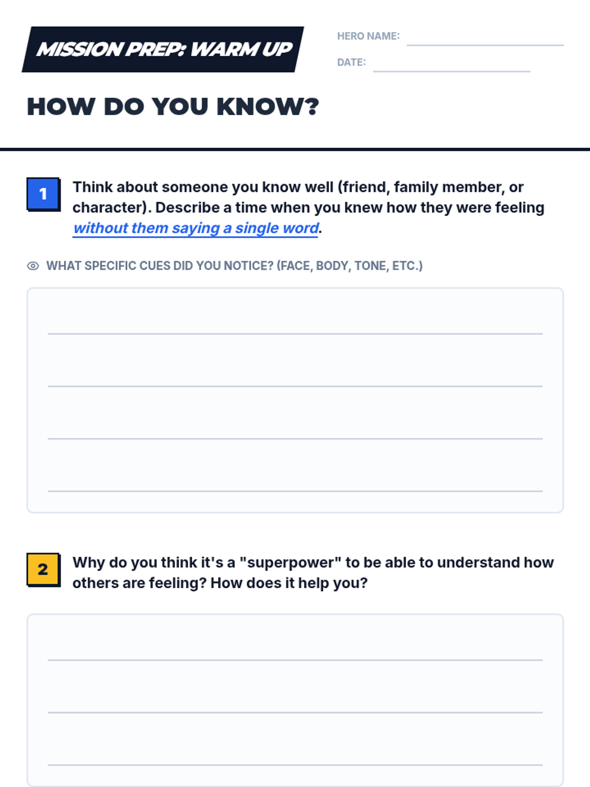A one-hour middle school lesson designed to help students develop social awareness by identifying verbal and non-verbal cues and practicing empathy and perspective-taking.