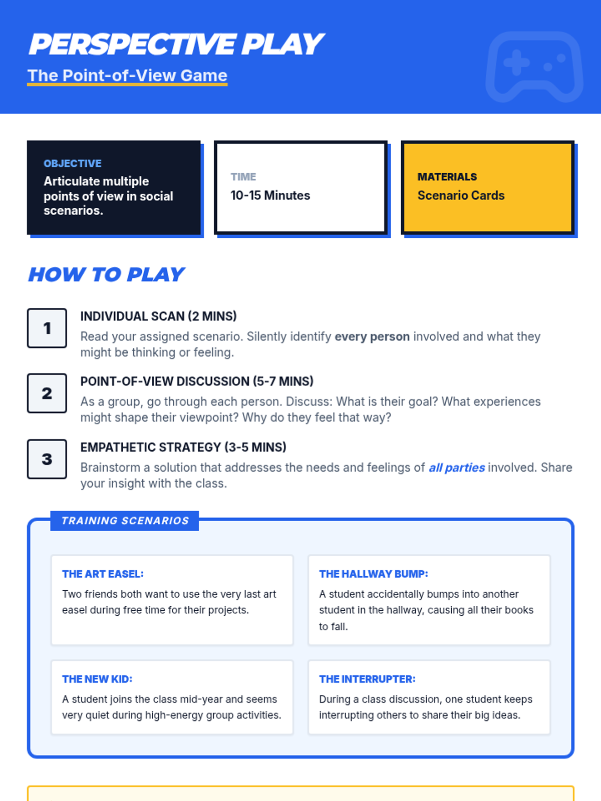 Students will explore different ways to navigate disagreements using a board game format to practice perspective-taking.