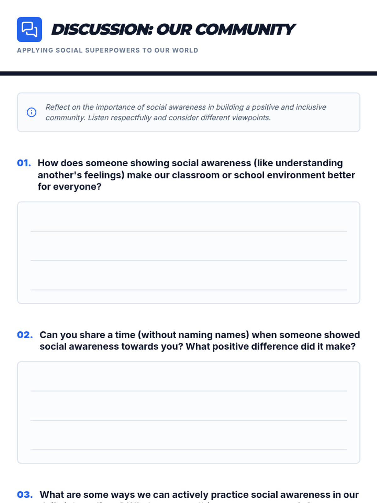 A reflective lesson designed for 8th-grade students to analyze their communication styles, specifically focusing on how to advocate for themselves respectfully when they have completed work, and understanding the collective impact of classroom disruptions.