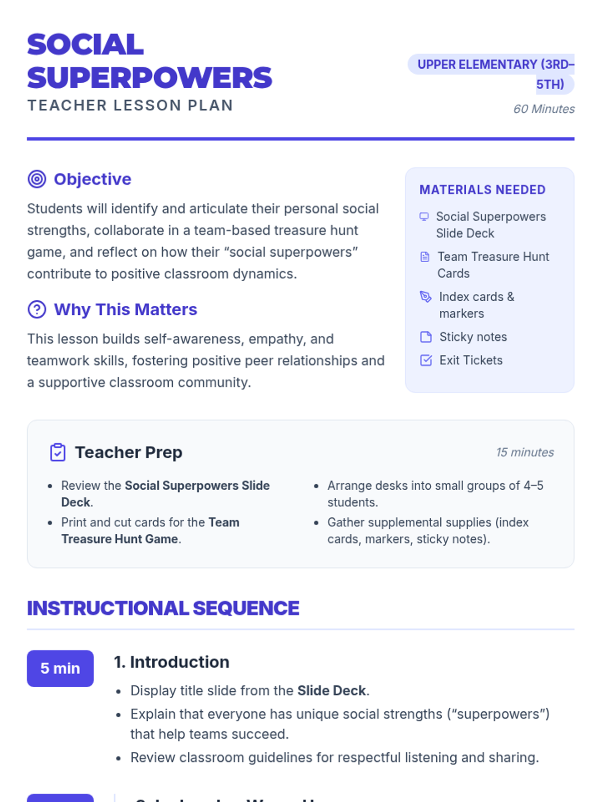 A 1-session lesson for upper elementary students that uses collaborative games and challenges to identify personal social strengths and enhance classroom teamwork.