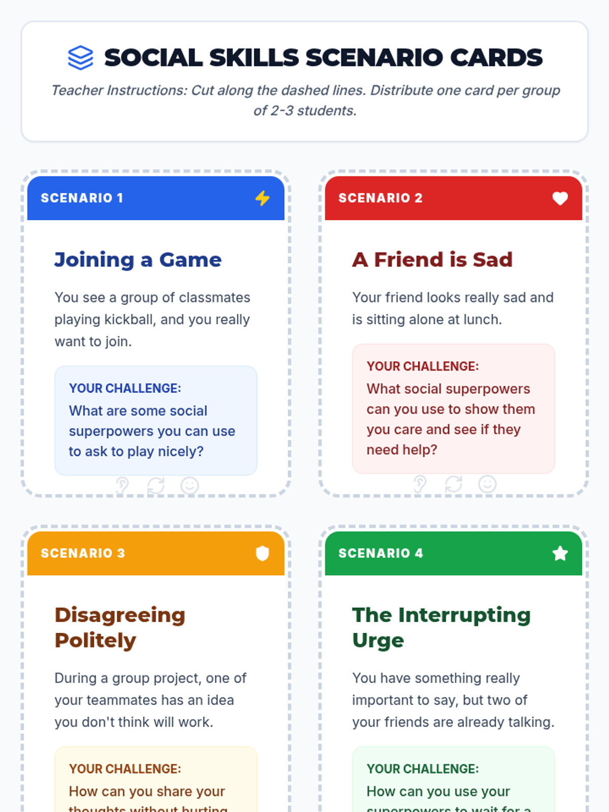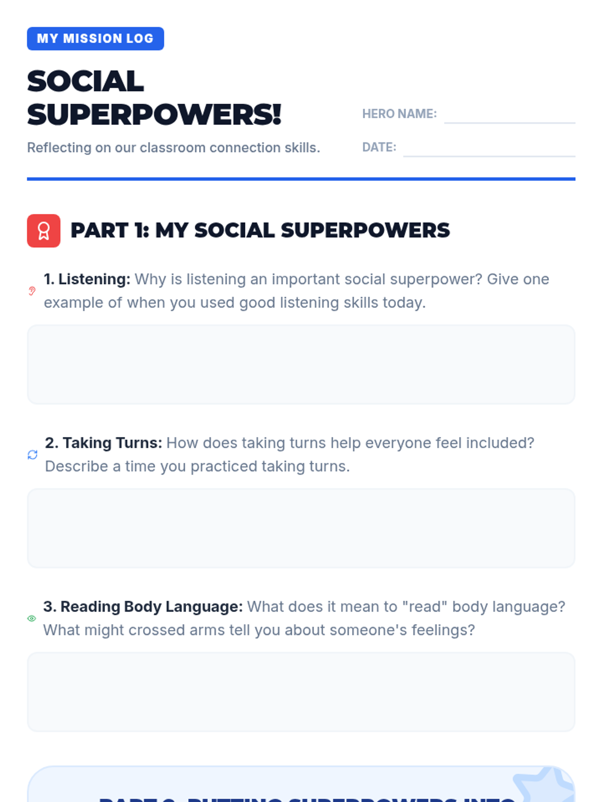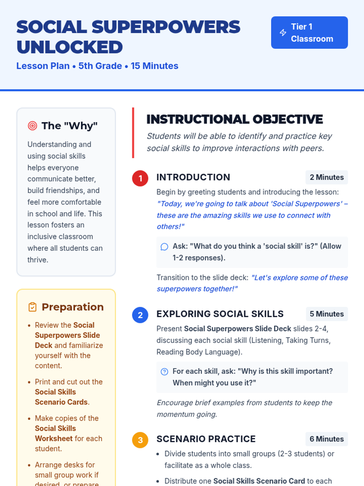 This lesson helps 5th-grade students understand and practice essential social skills like listening, taking turns, and reading body language. It uses a fun 'superhero' theme to make social-emotional learning engaging and accessible.