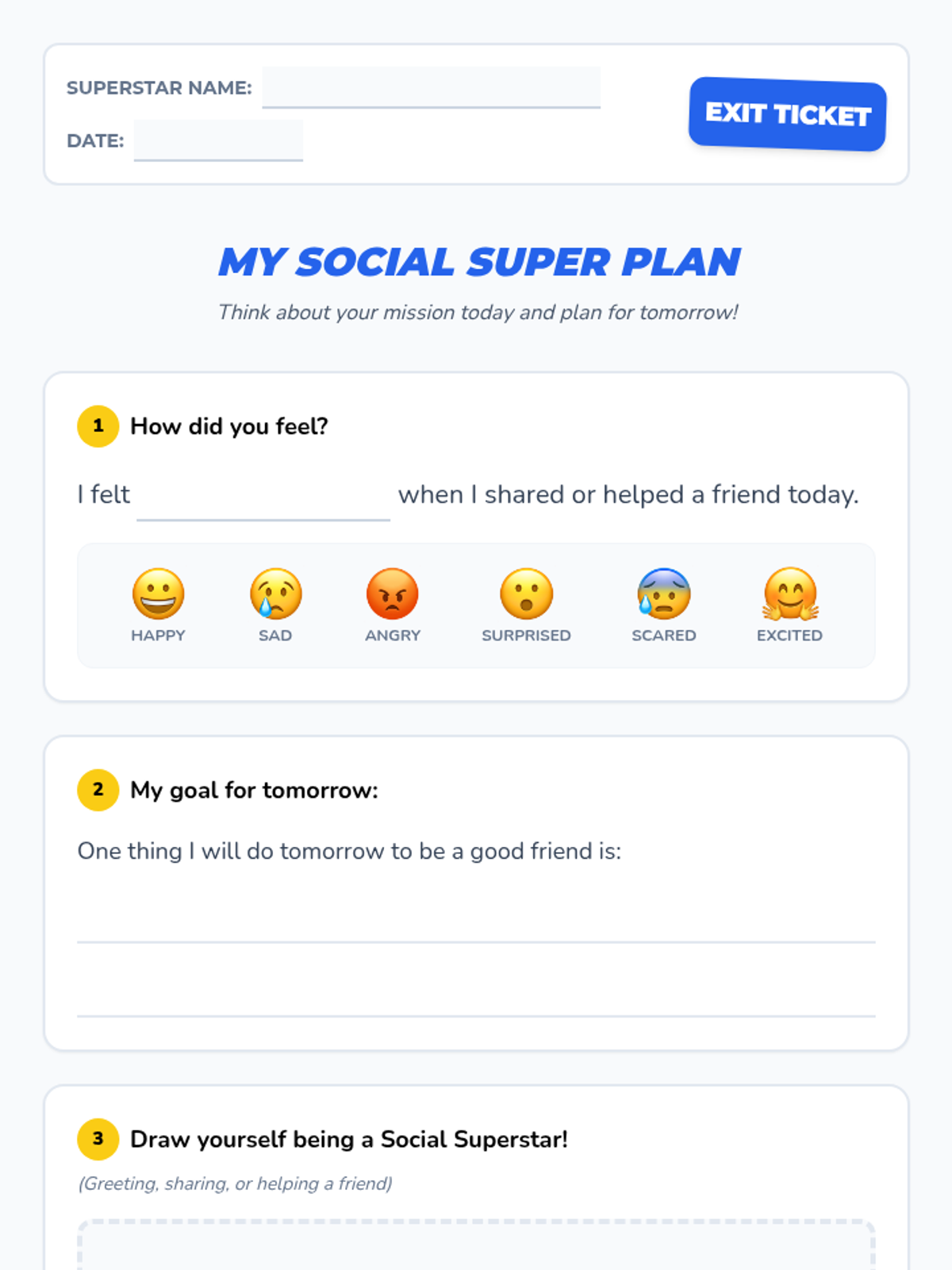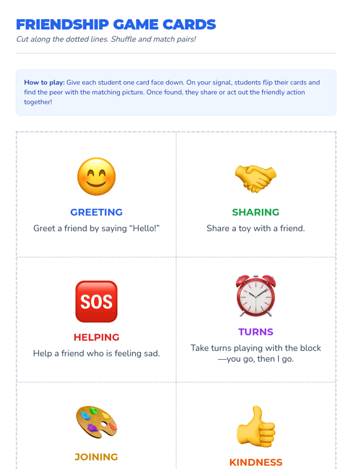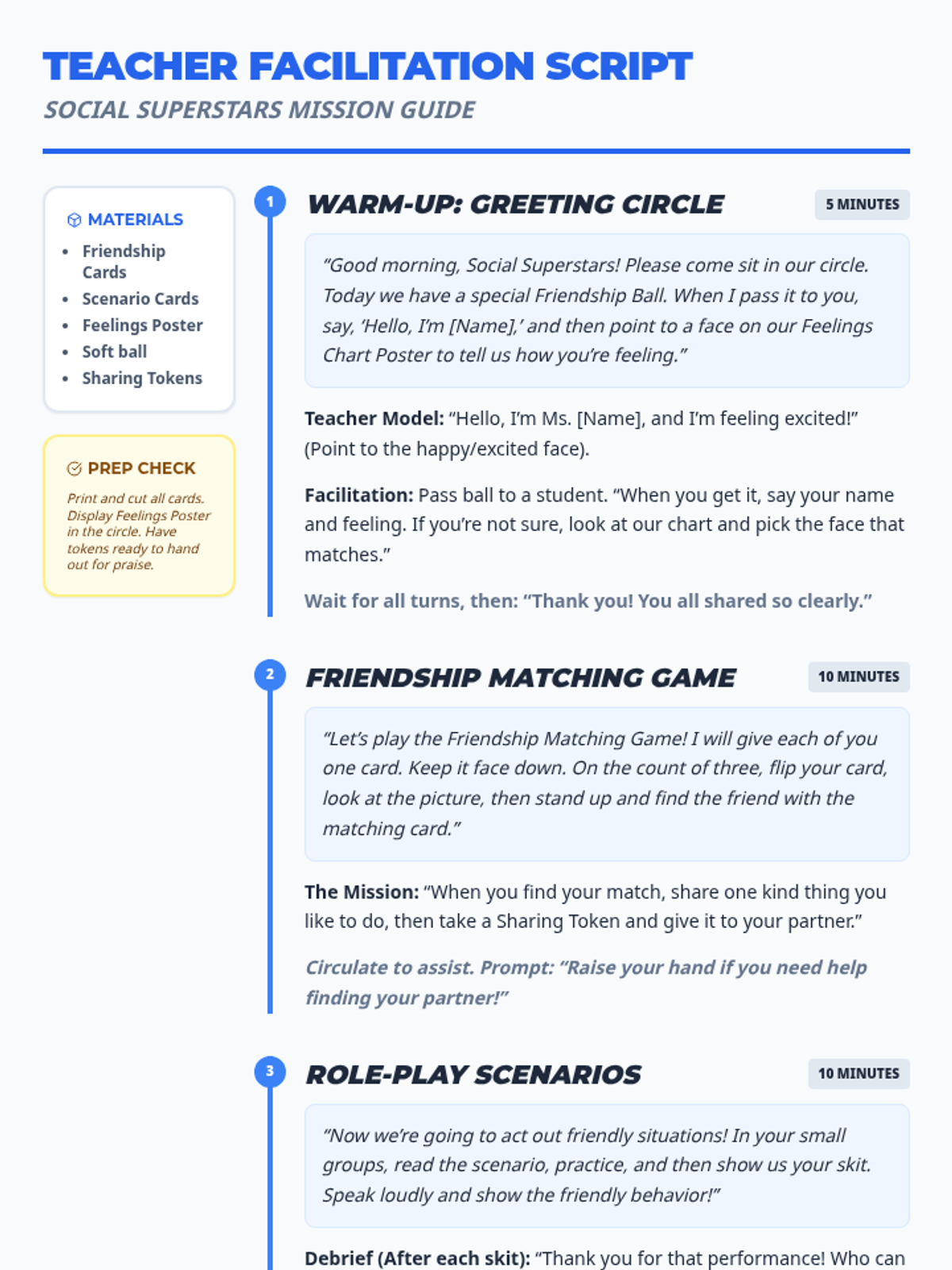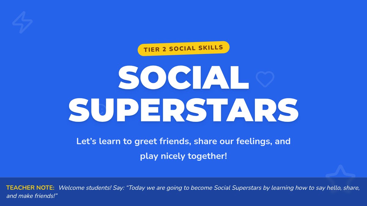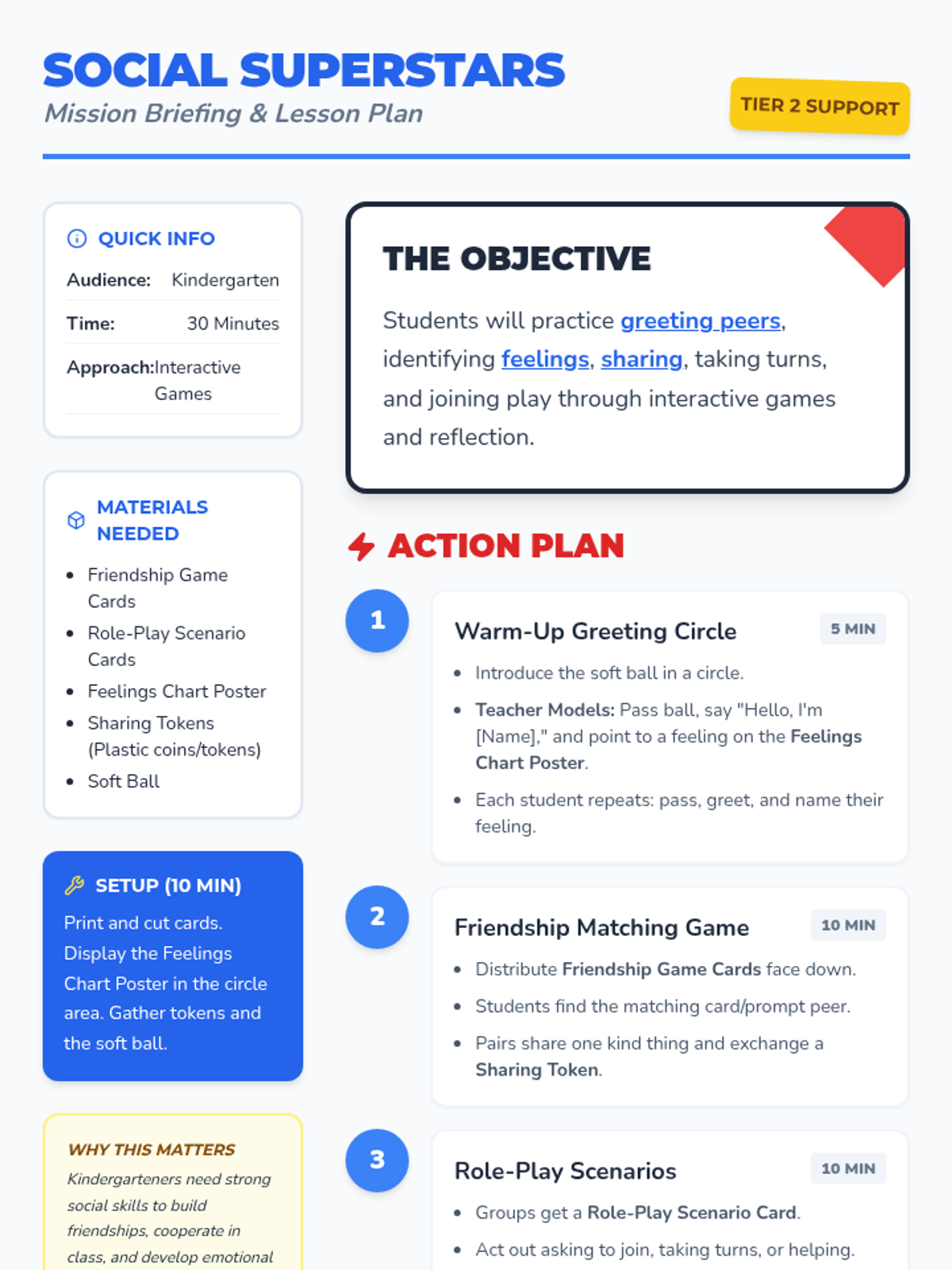 A 30-minute Tier 2 social skills lesson for Kindergarteners focusing on greeting peers, identifying feelings, sharing, taking turns, and joining play.