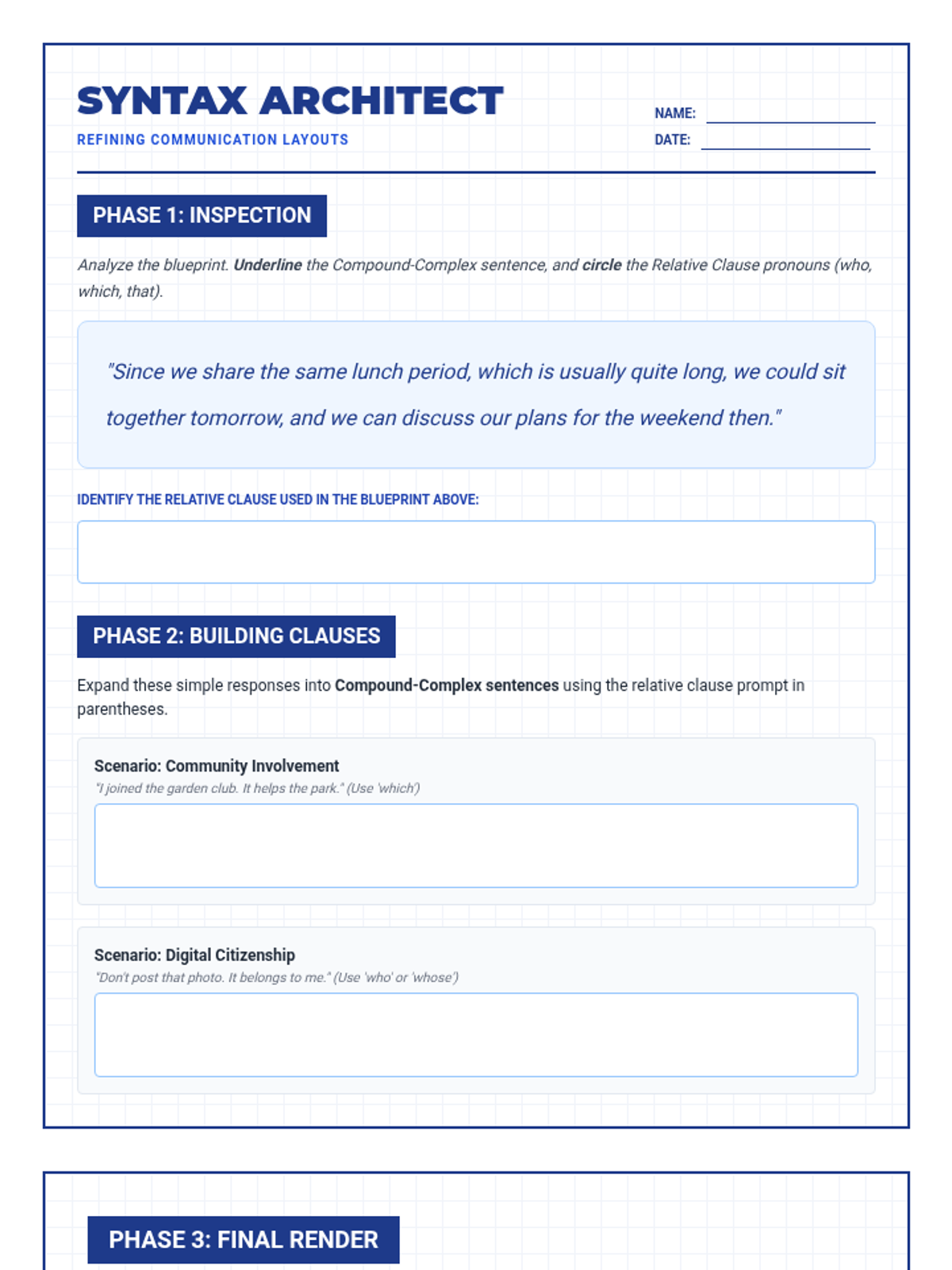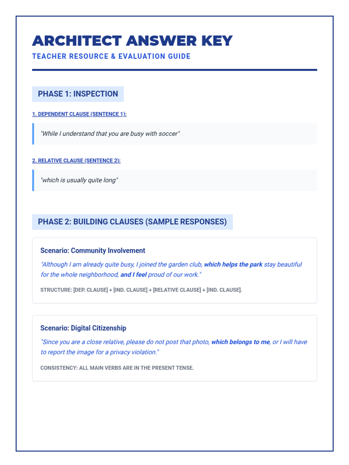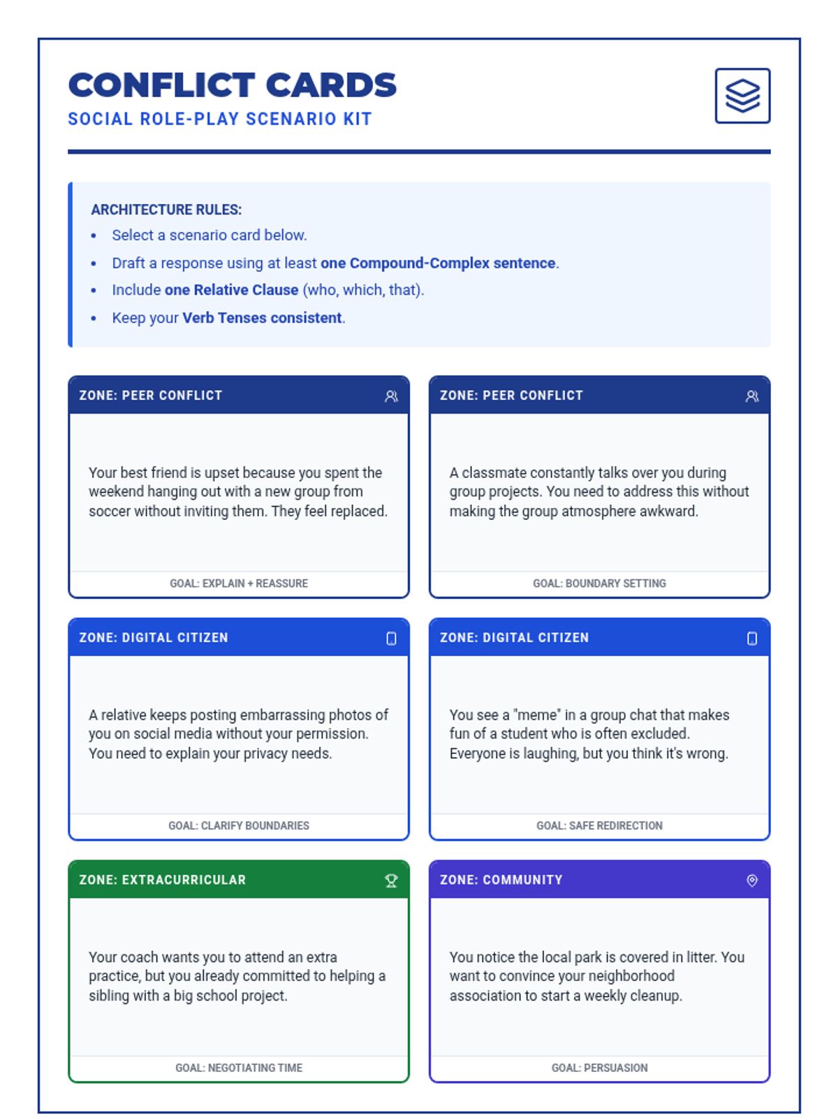 An 8th-grade lesson focusing on advanced sentence structures and verb consistency applied to real-world social scenarios like peer conflict and digital citizenship.