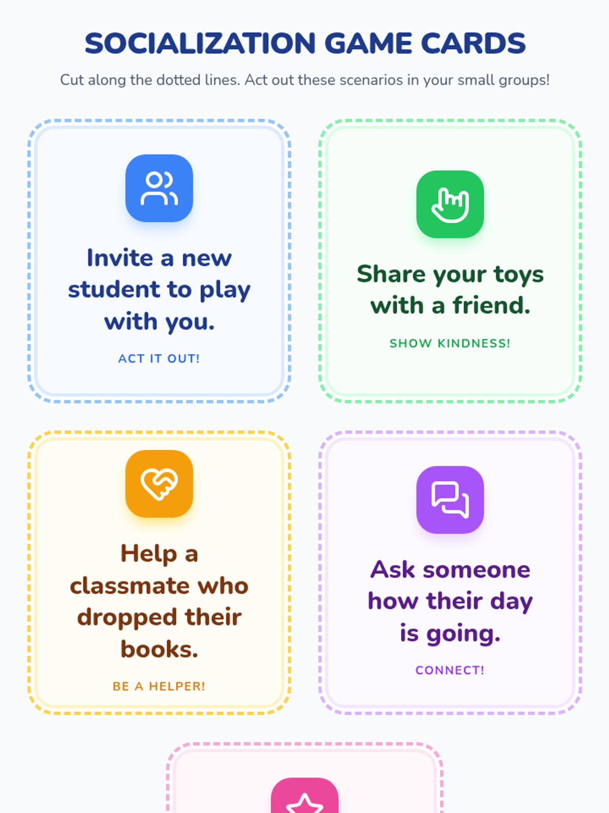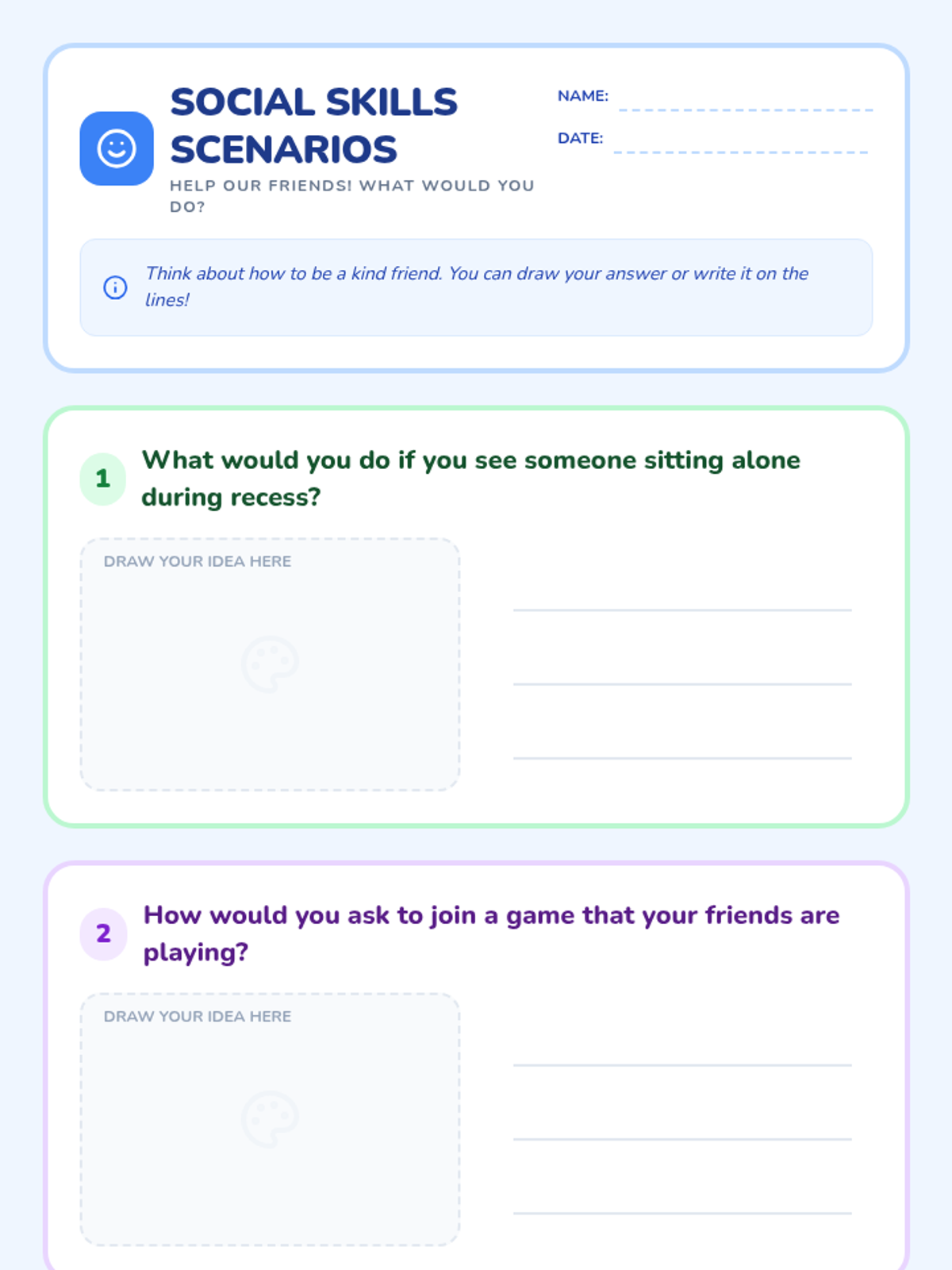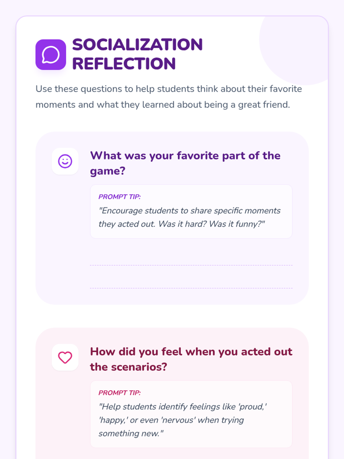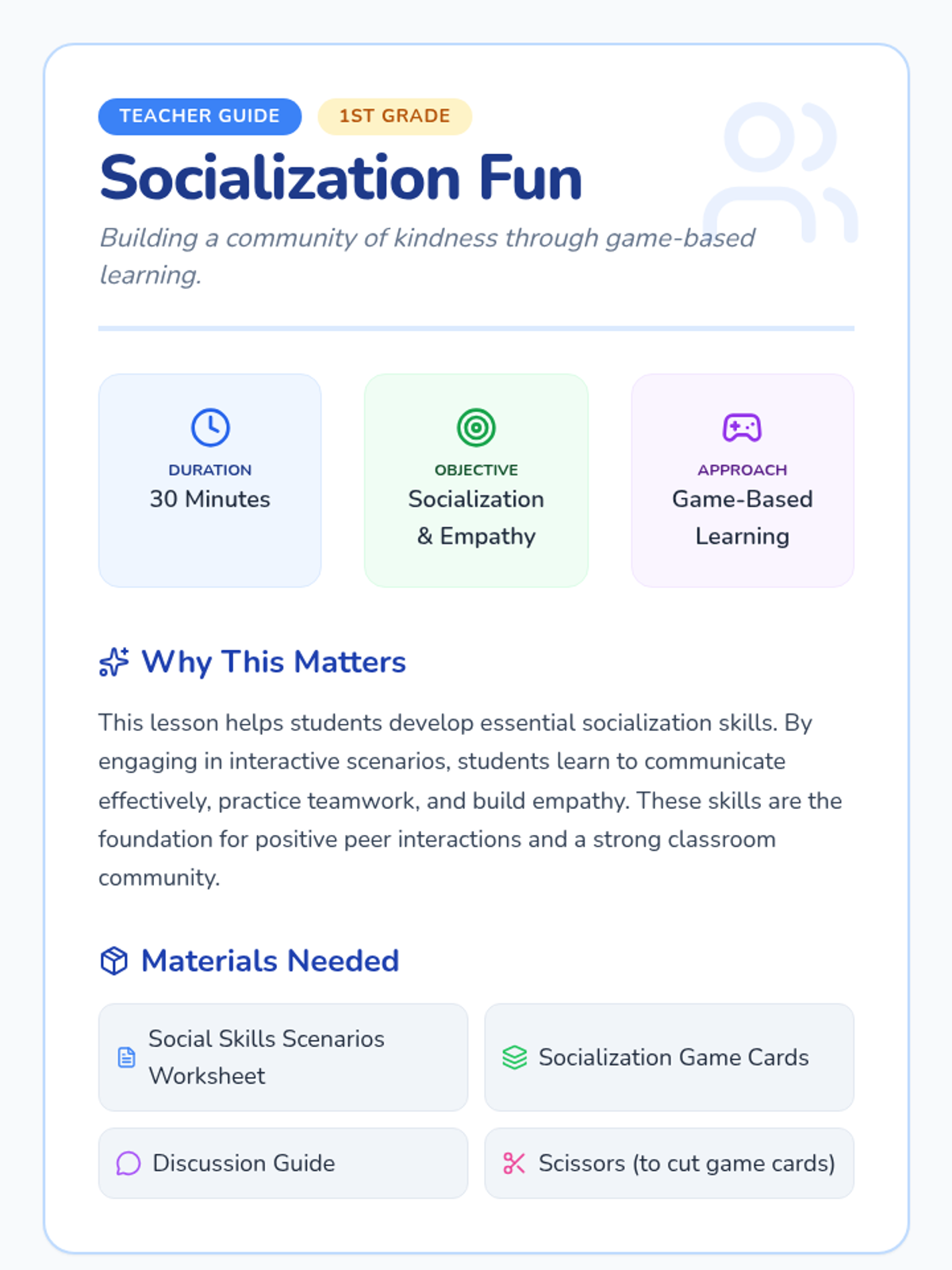 A 30-minute interactive lesson for 1st graders focusing on communication, teamwork, and empathy through role-play games and reflective scenarios.