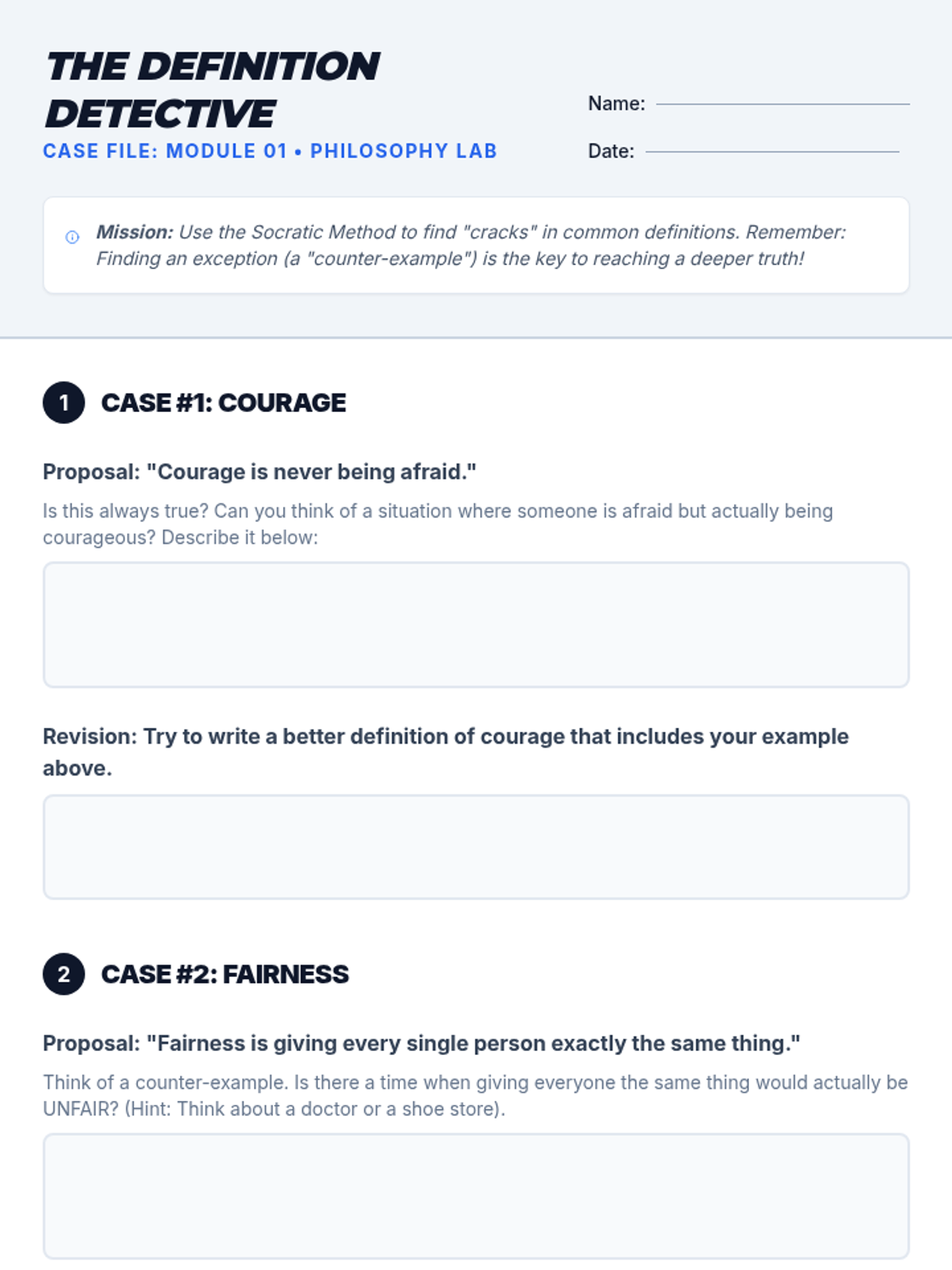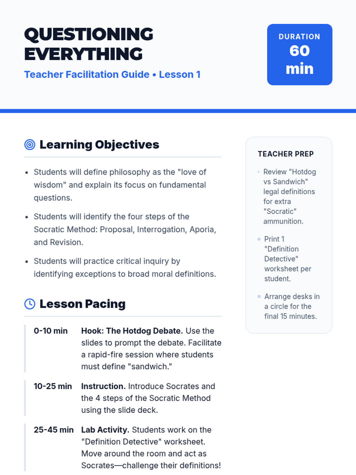 Introduces the Socratic Method and the concept of philosophy through critical inquiry and the "Hotdog" debate.