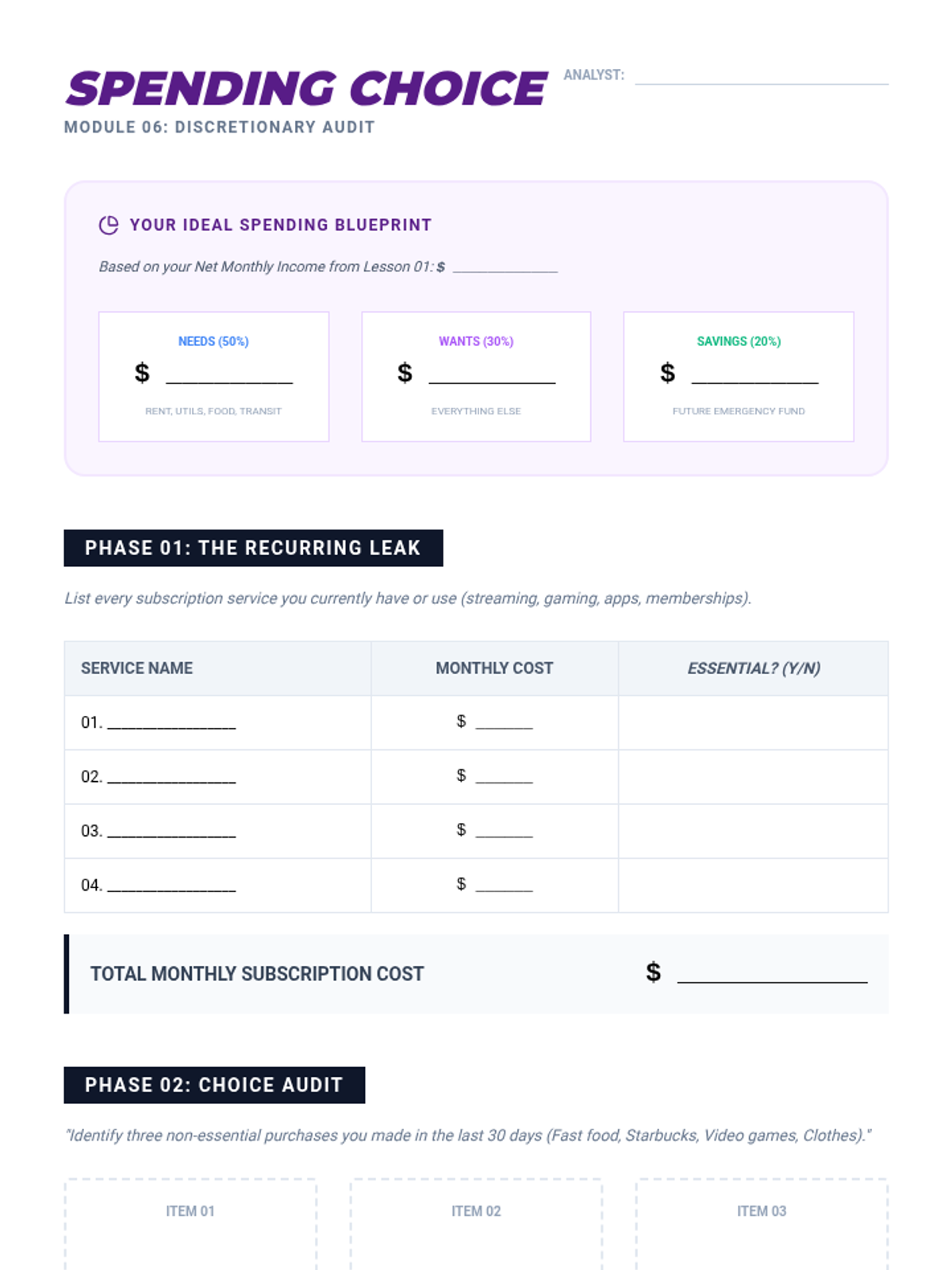 Understanding the 50/30/20 rule, identifying personal "wants" versus "needs," and managing discretionary expenses like subscriptions and entertainment.