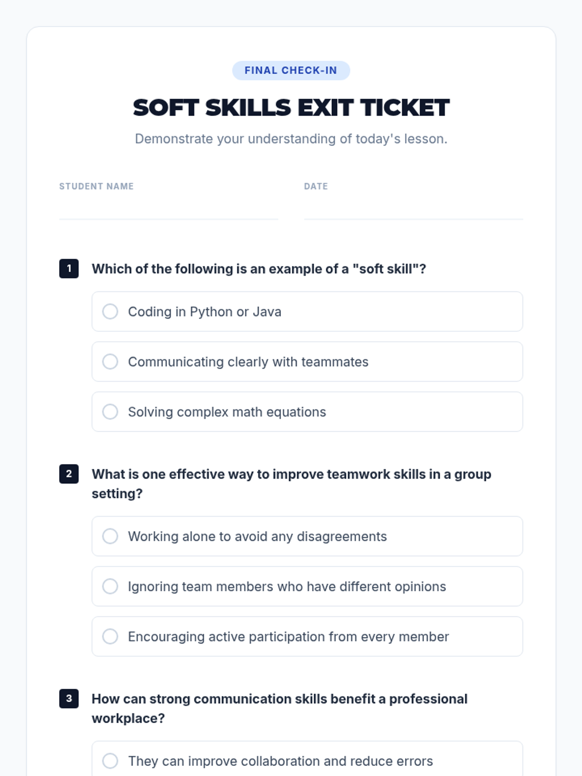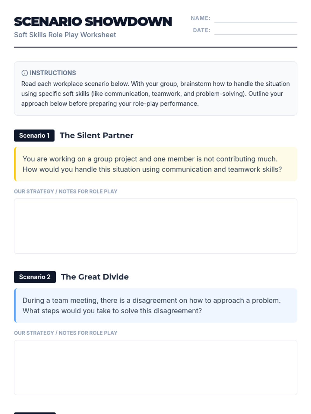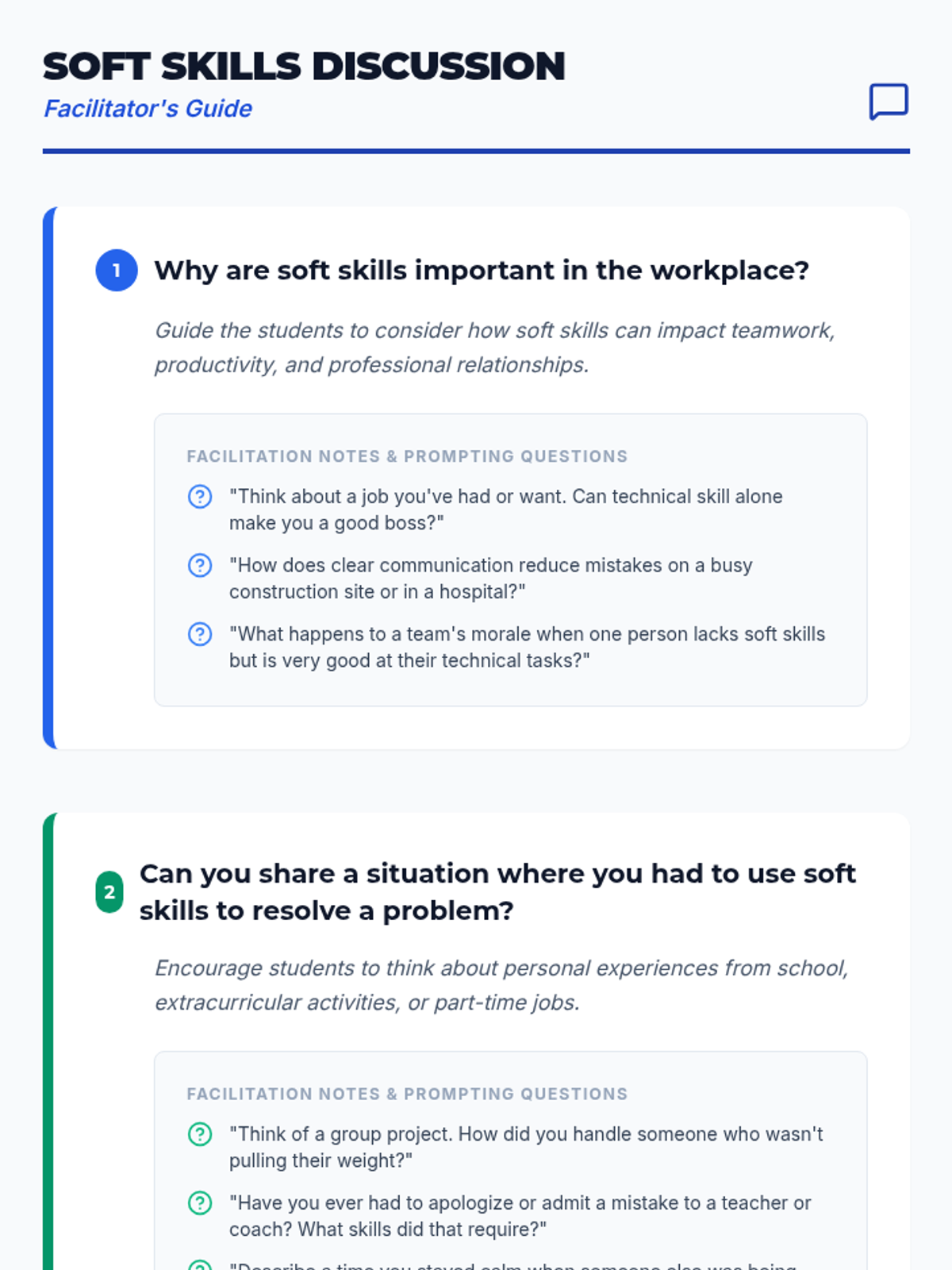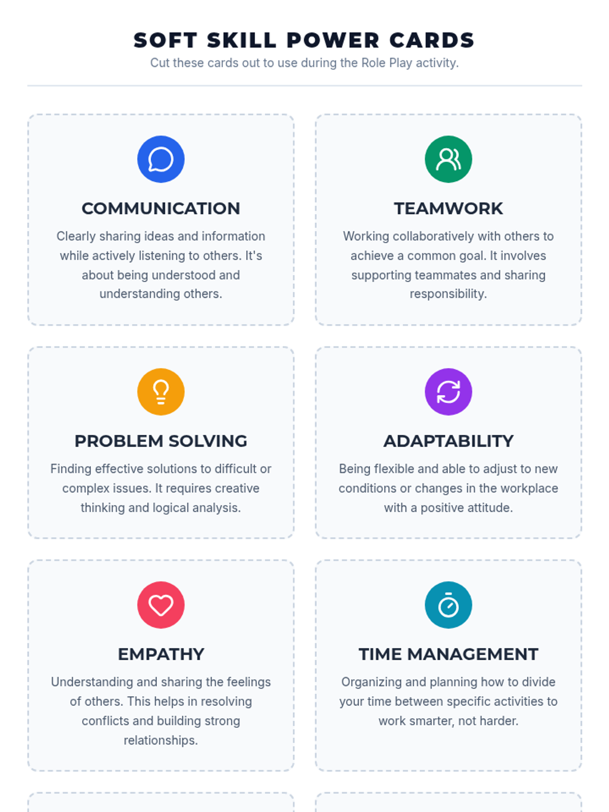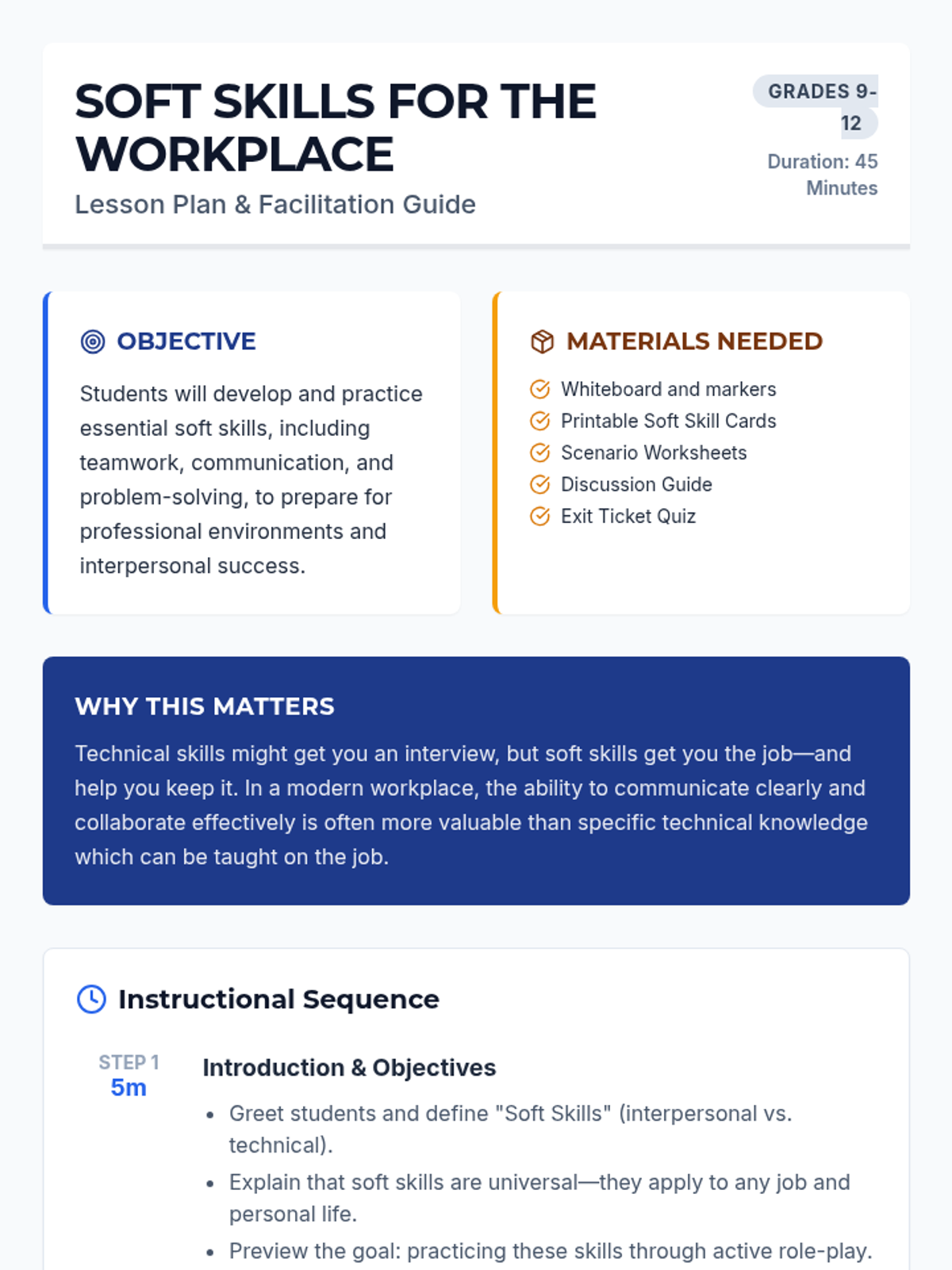 A comprehensive lesson designed to help high school students develop essential soft skills like communication, teamwork, and problem-solving through interactive role-plays and discussions.