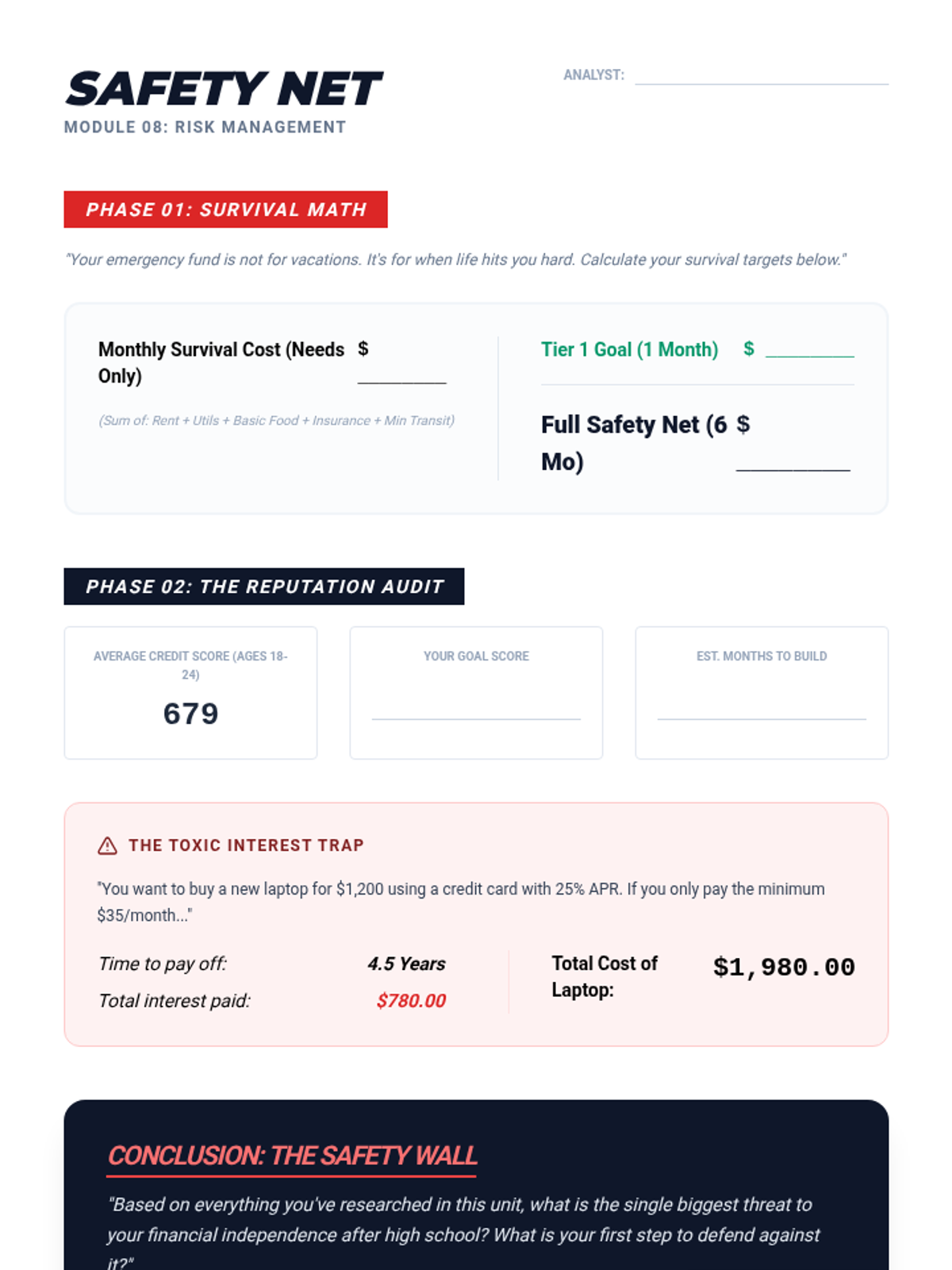 Exploring emergency funds, the basics of credit scores, and strategies for avoiding high-interest debt after high school.