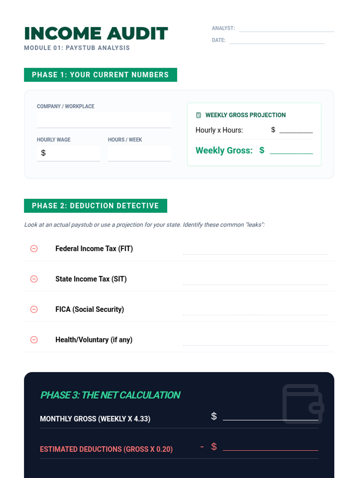 Students identify different components of a paystub, understand FICA and income tax deductions, and calculate accurate net monthly income based on their current jobs.